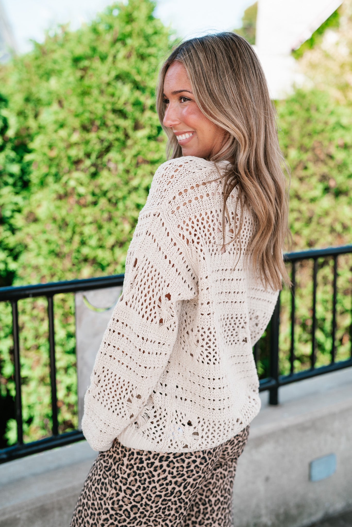 Designed with a relaxed, oversized silhouette and airy crochet-knit detailing, this sweater brings both texture and warmth. The soft oatmeal hue makes it a versatile staple, pairing beautifully with denim, skirts, or layered over a slip dress. Its open-knit design adds a touch of playfulness, making it perfect for breezy afternoons, cozy mornings, or weekend coffee dates. The slightly cropped length keeps it modern while maintaining that comfortable, easy fit you’ll love reaching for.