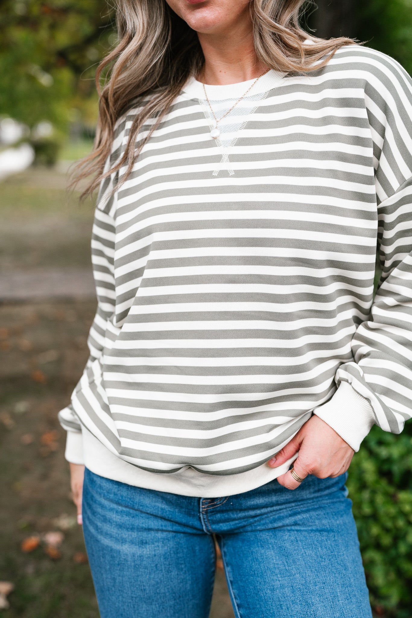 Looking for a striped pullover that feels as easy as it looks polished? The Olive Stripe Relaxed Pullover blends timeless style with everyday comfort. Its sage and cream stripes add a soft, modern touch that makes it easy to pair with your favorite denim or joggers.