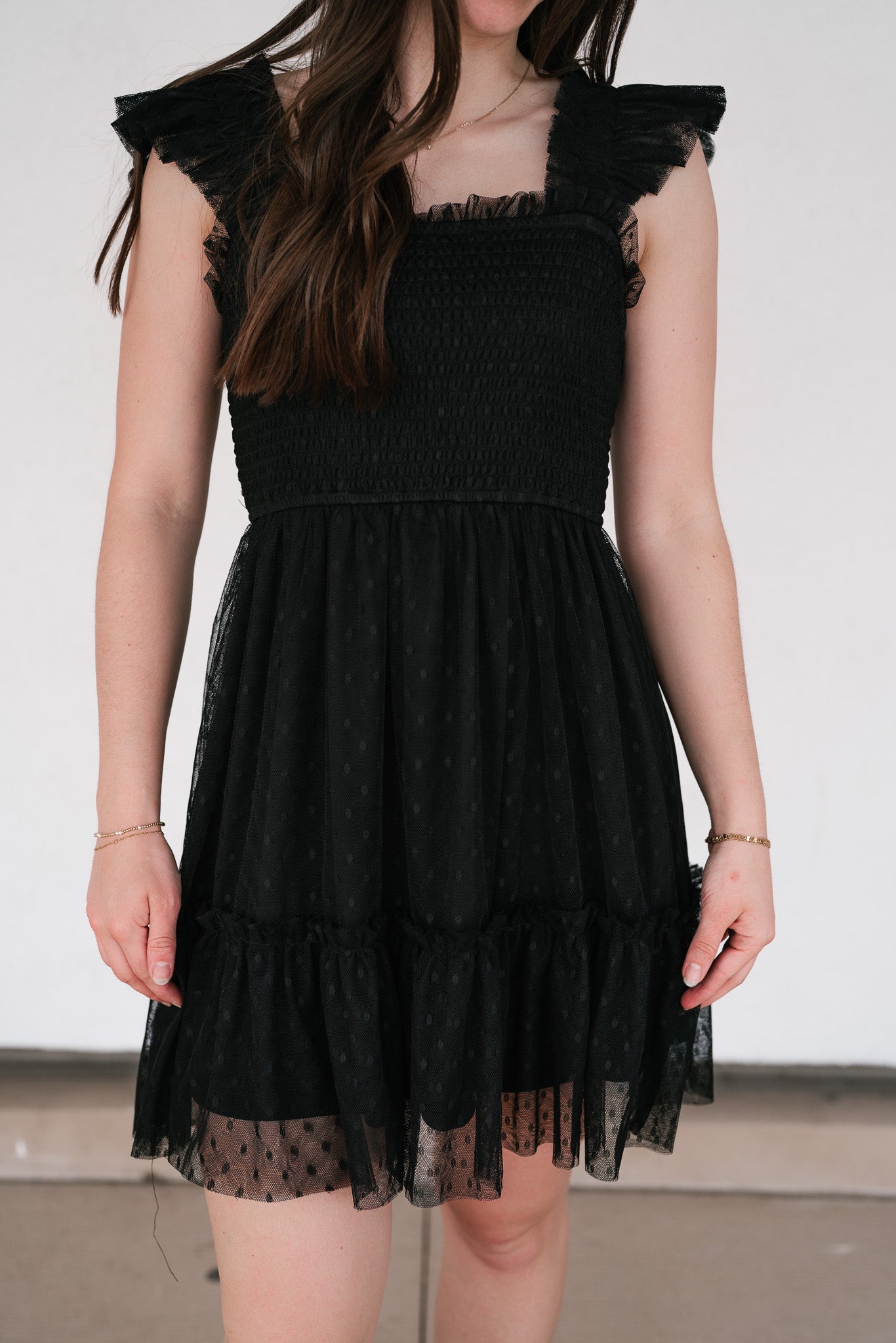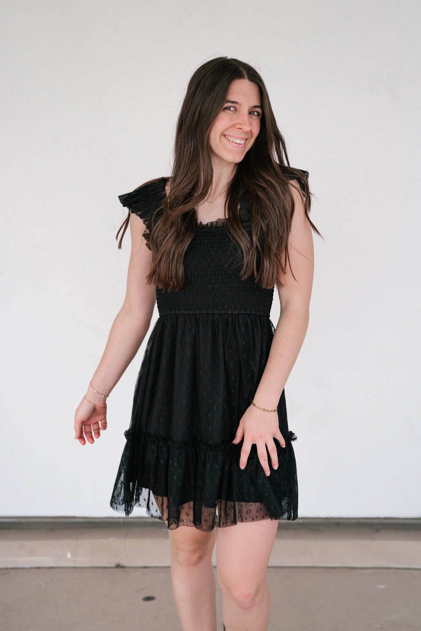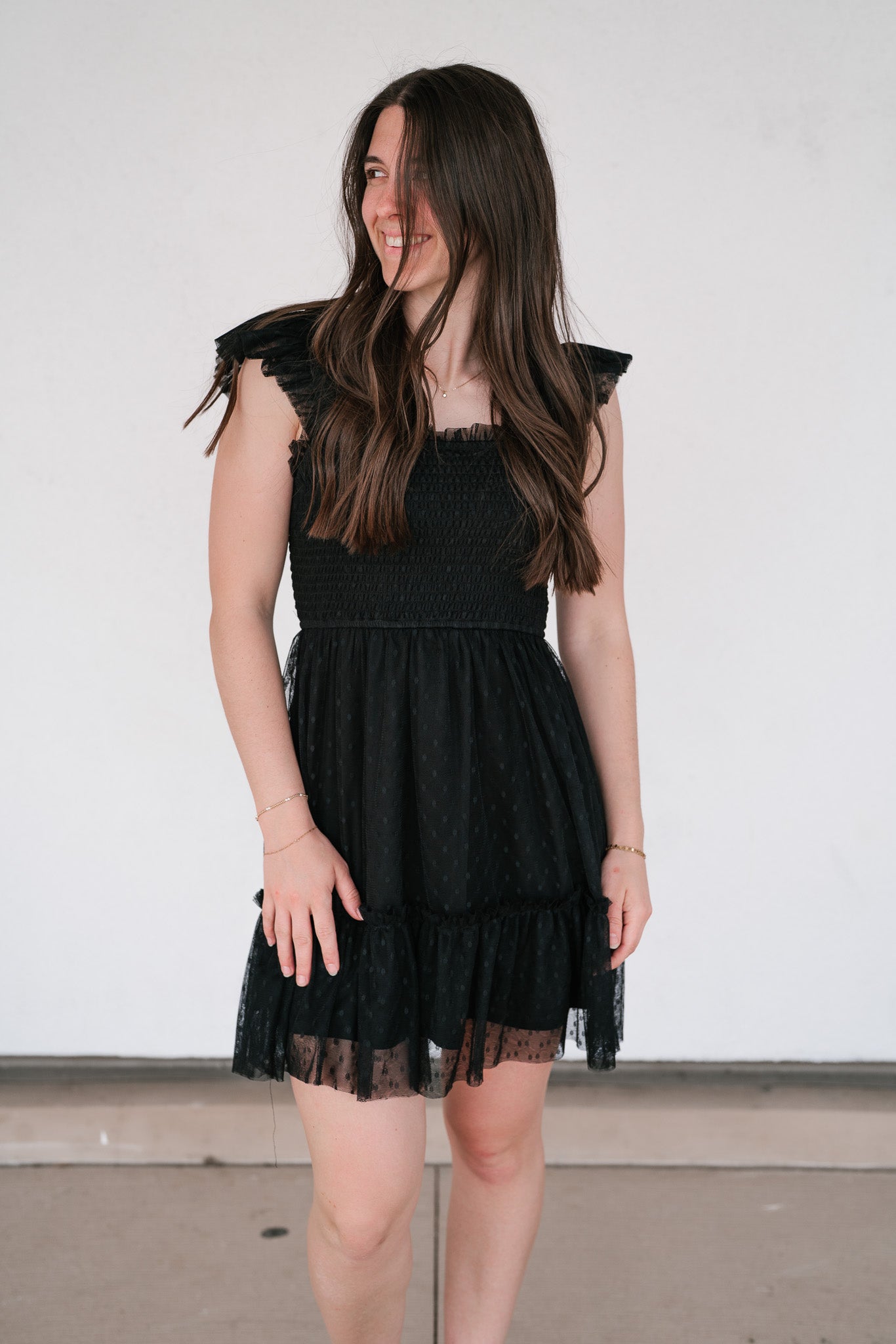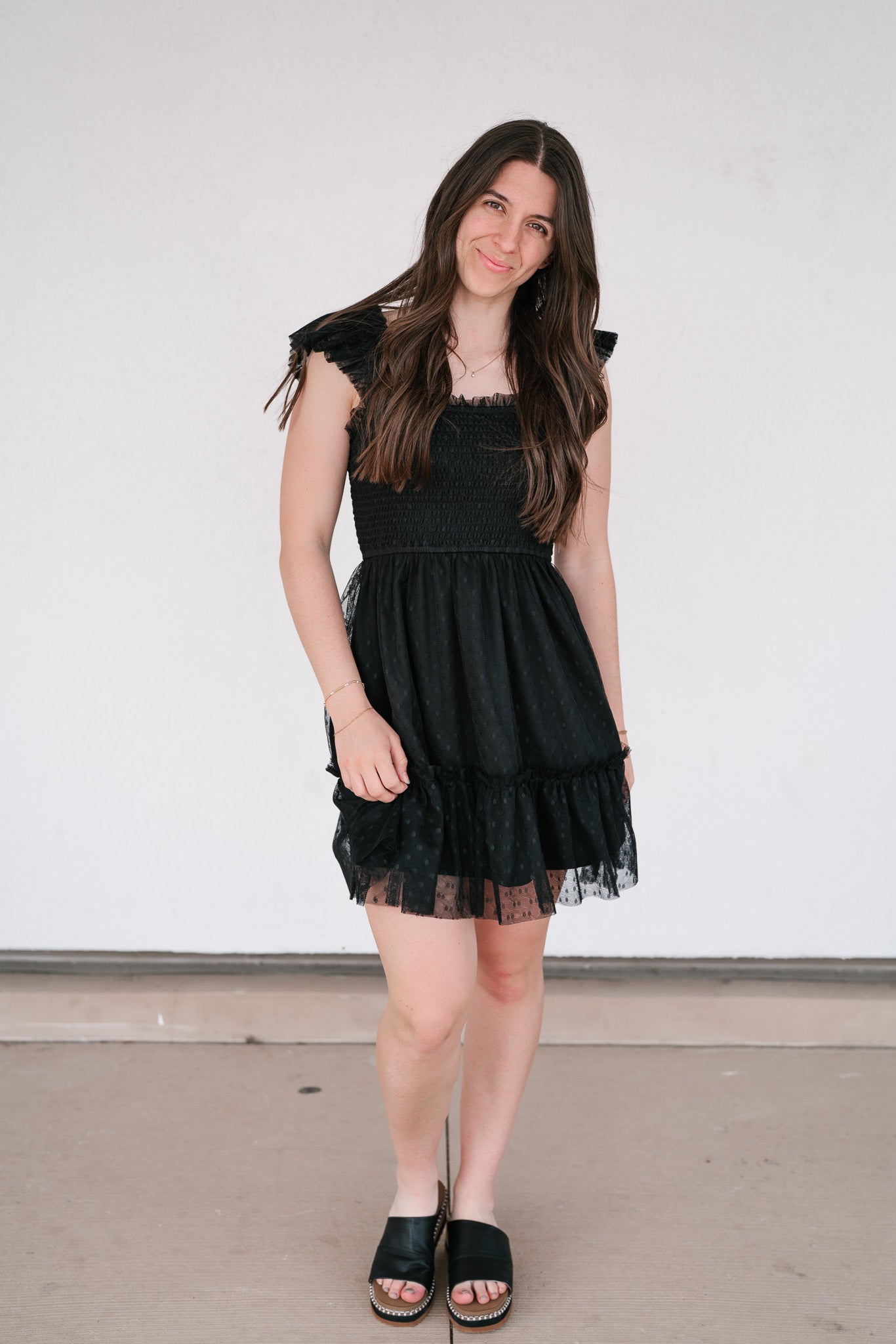 Elegant with a touch of whimsy, the Moment In Time Smocked Mini Dress in Black redefines timeless charm. Crafted from lightweight tulle fabric, this dress features a figure-flattering smocked bodice and a simple, softly gathered skirt that moves with grace. The wide 2-inch ruffled straps add a romantic edge, offering both comfort and feminine detail. Perfect for evening soirées, date nights, or adding a sophisticated touch to your everyday wardrobe, this dress blends modern minimalism with delicate texture for a look that’s effortlessly captivating.