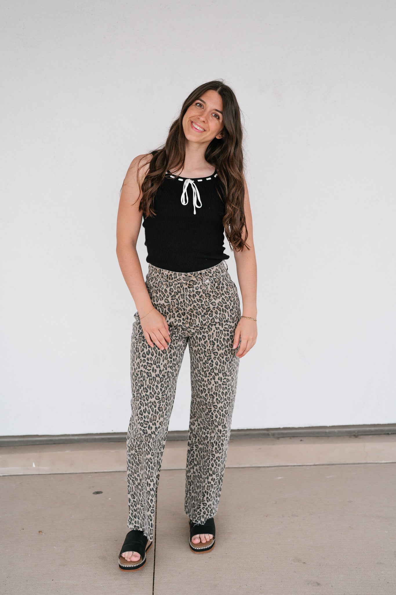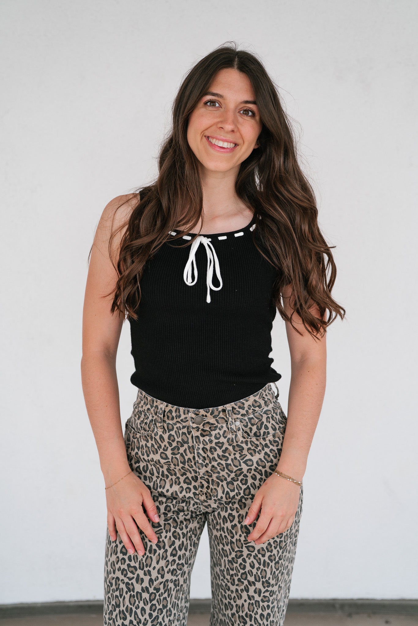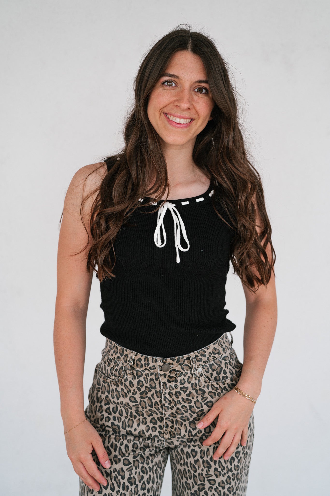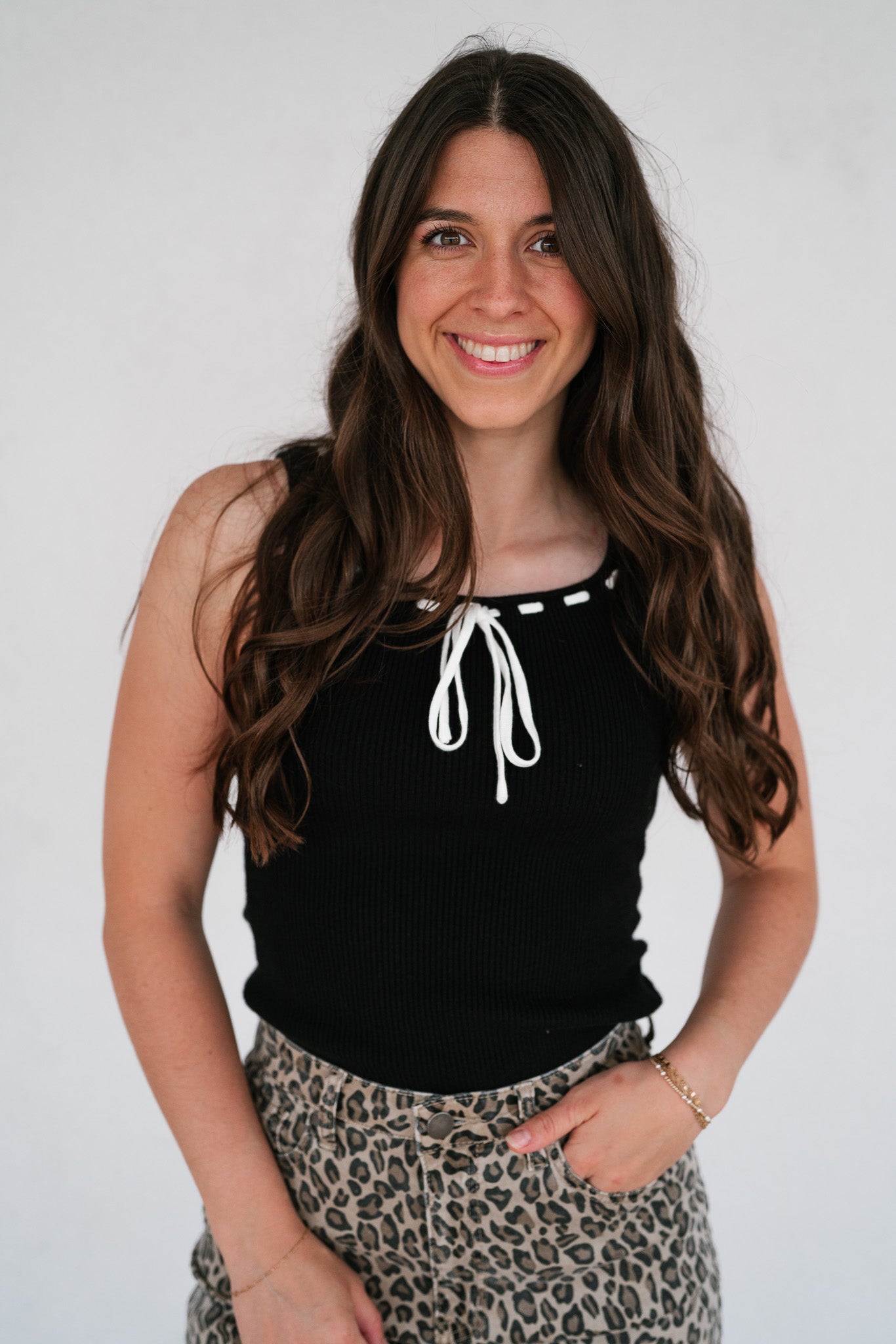 • Fall in love with contrast and charm in our Tied In Love Ribbed Tank. This black ribbed knit tank is detailed with playful white whipstitch accents along the neckline and straps, finished with an adorable front tie bow that adds a sweet, eye-catching touch. The cropped silhouette and body-hugging fit make it perfect for layering or styling solo. Whether you’re going for casual-cute or elevated basics, this tank adds a flirty twist to your everyday look.