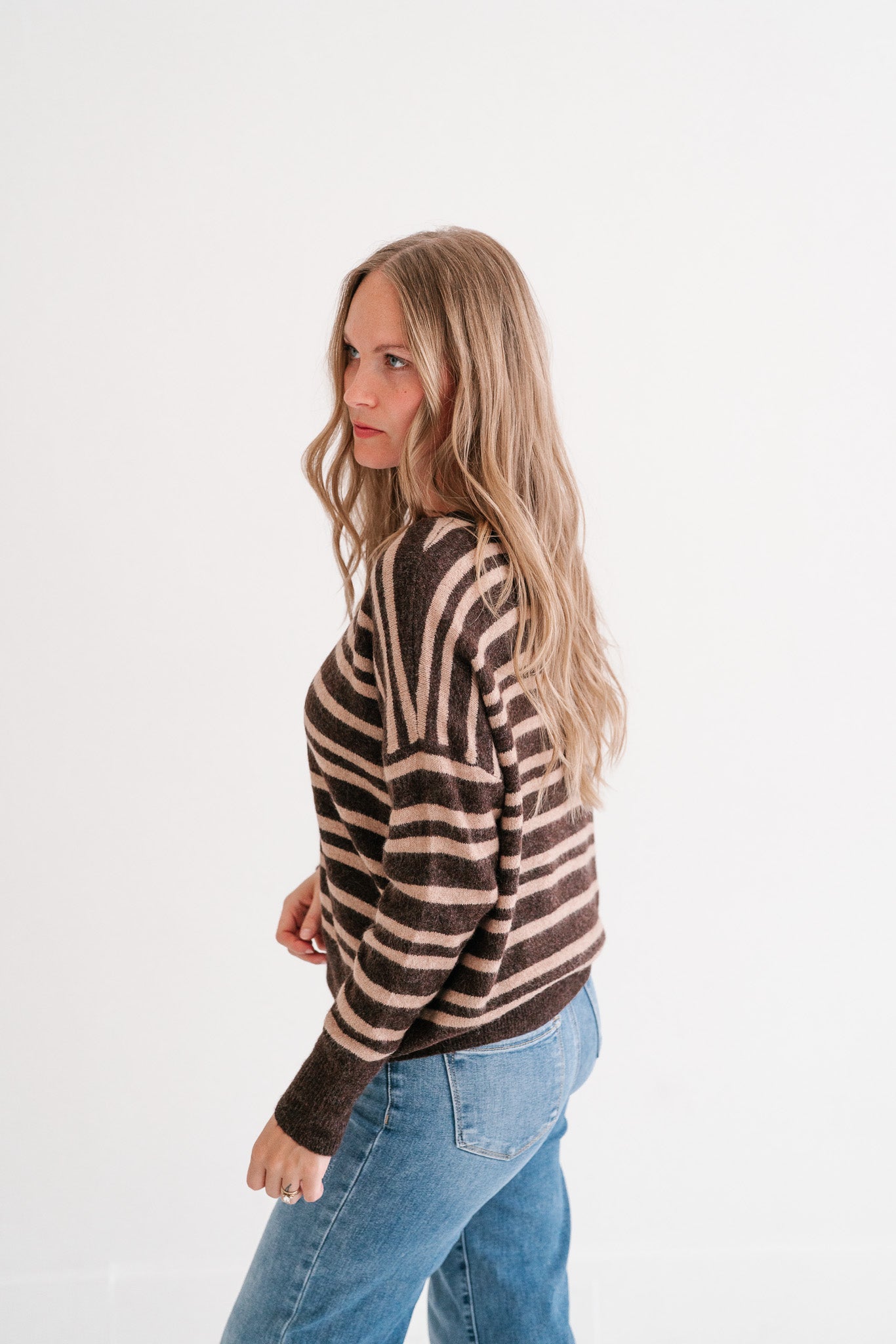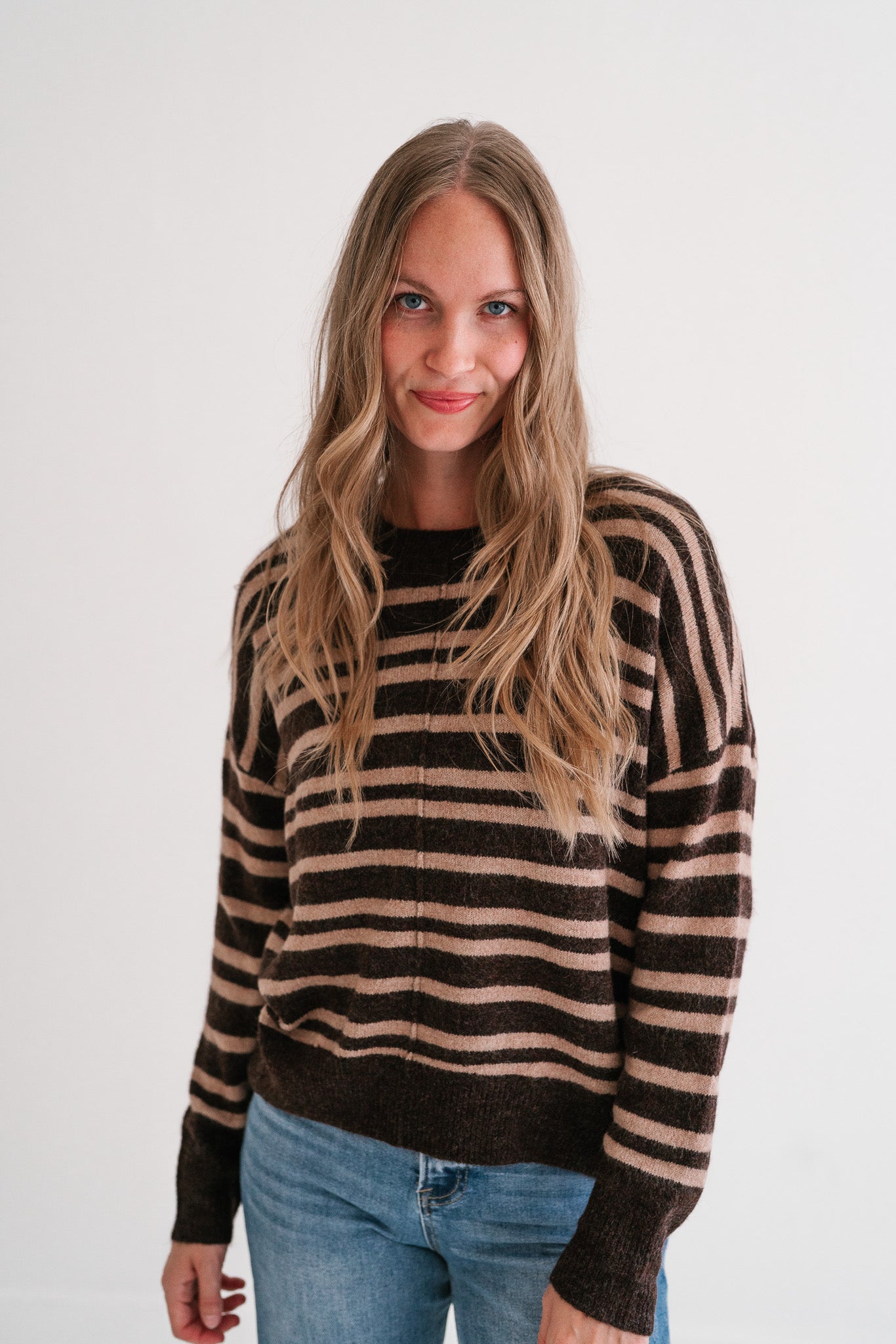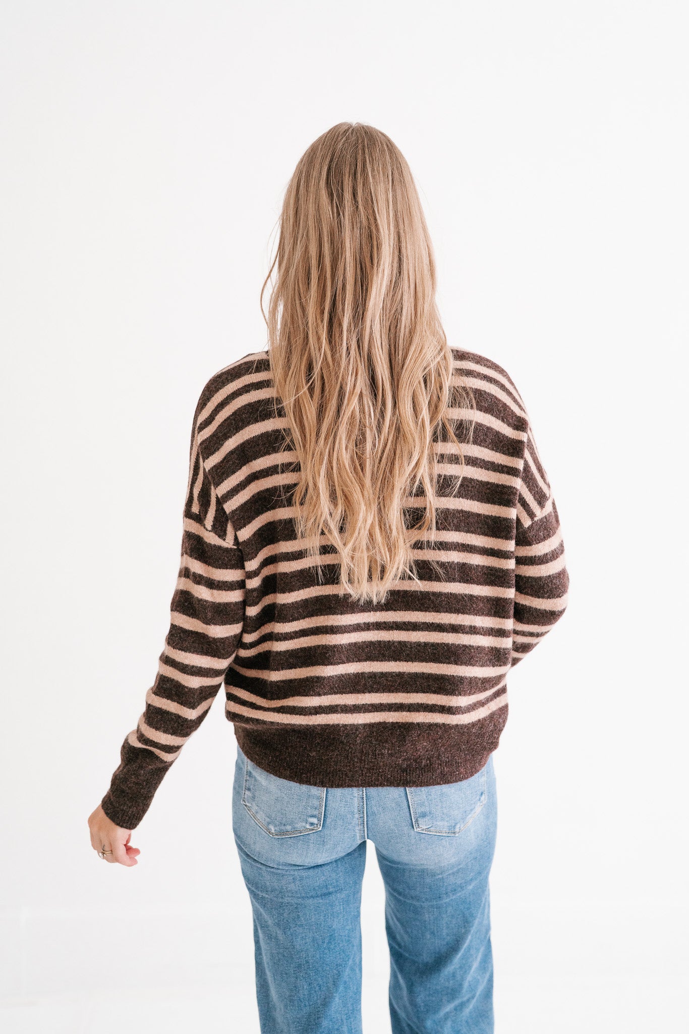 Designed with a cozy knit texture and an easy silhouette, this sweater blends comfort and everyday versatility. The mocha and beige stripe pattern adds a classic yet modern touch, making it perfect for pairing with your favorite denim, skirts, or layered under a jacket. Whether you're heading into town for errands or cozying up on a crisp day, this striped sweater will be a piece you reach for again and again.