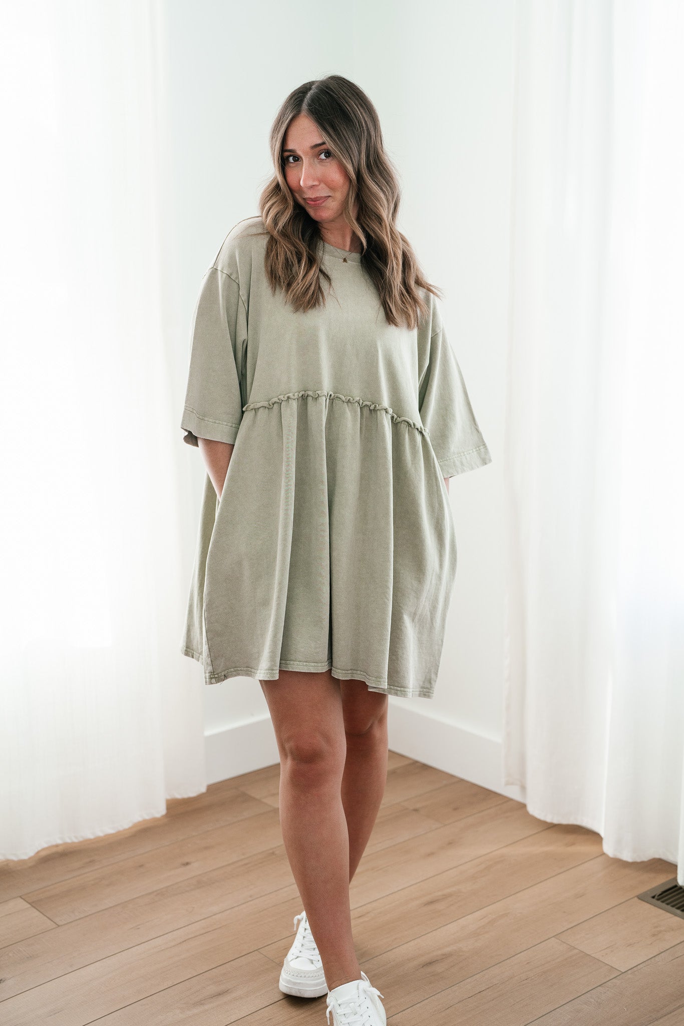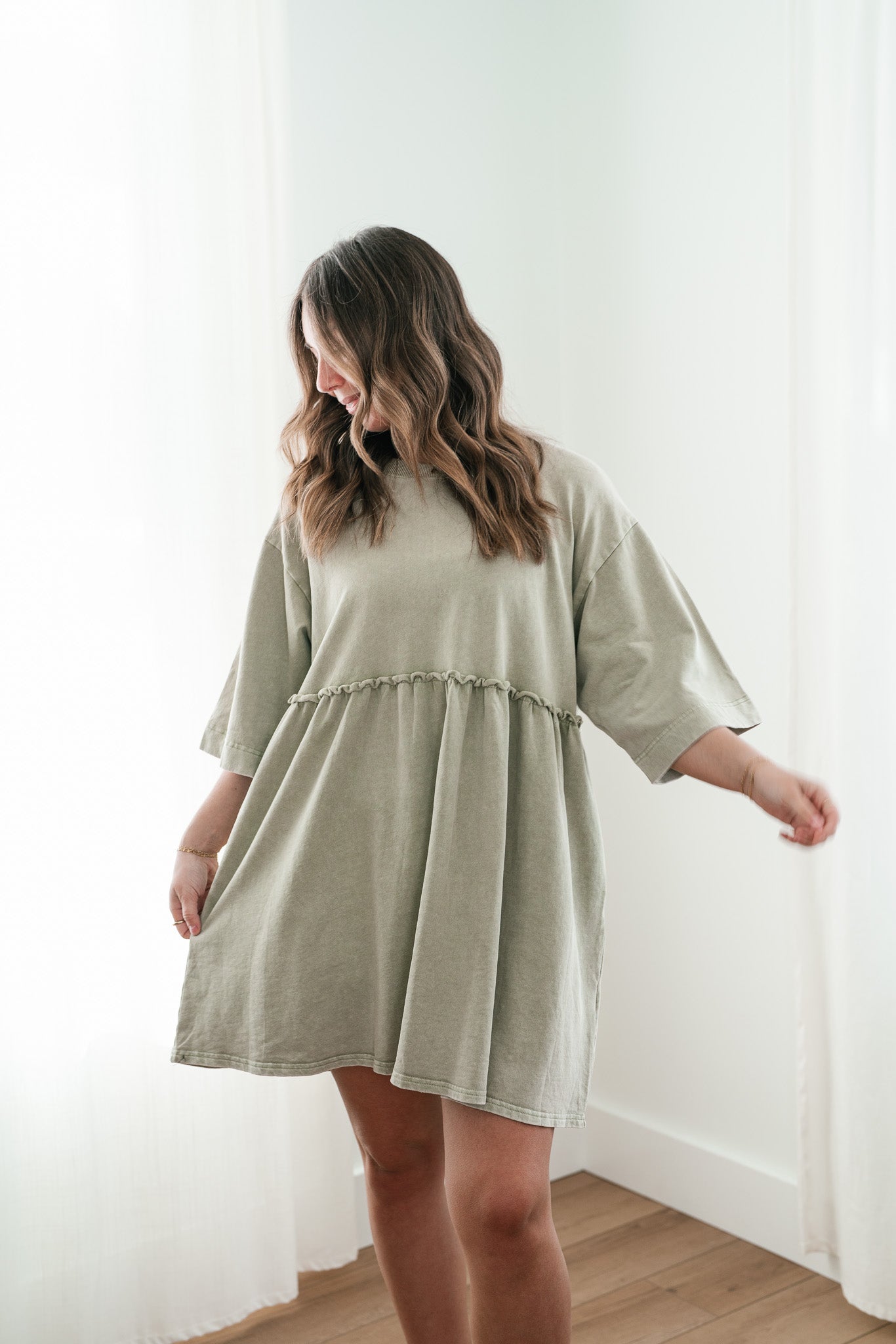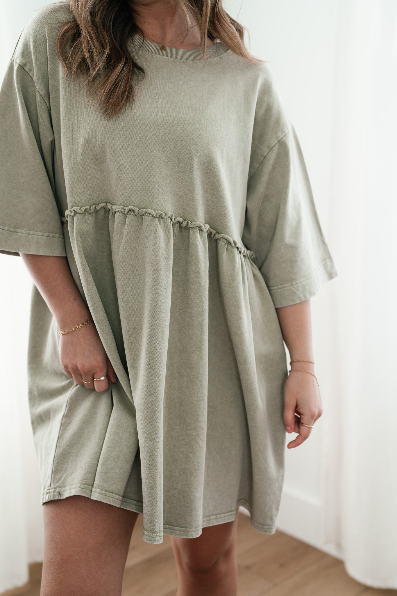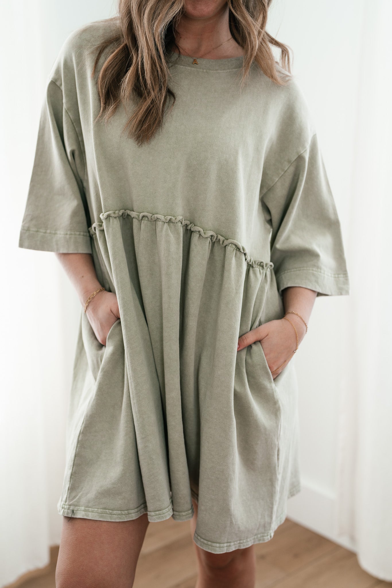 The Wild & Free Mineral Wash Babydoll Dress is the perfect blend of effortless style and casual charm. Featuring a soft, lightweight fabric with a vintage-inspired mineral wash, this dress exudes a laid-back, lived-in look. Its relaxed babydoll silhouette offers a flattering, flowy fit, while delicate details like a round neckline, short sleeves, and subtle pleating add a touch of femininity. Whether you're pairing it with sneakers for a casual day out or layering it with boots and a jacket for cooler evenings, this dress is a versatile must-have for any free-spirited wardrobe.