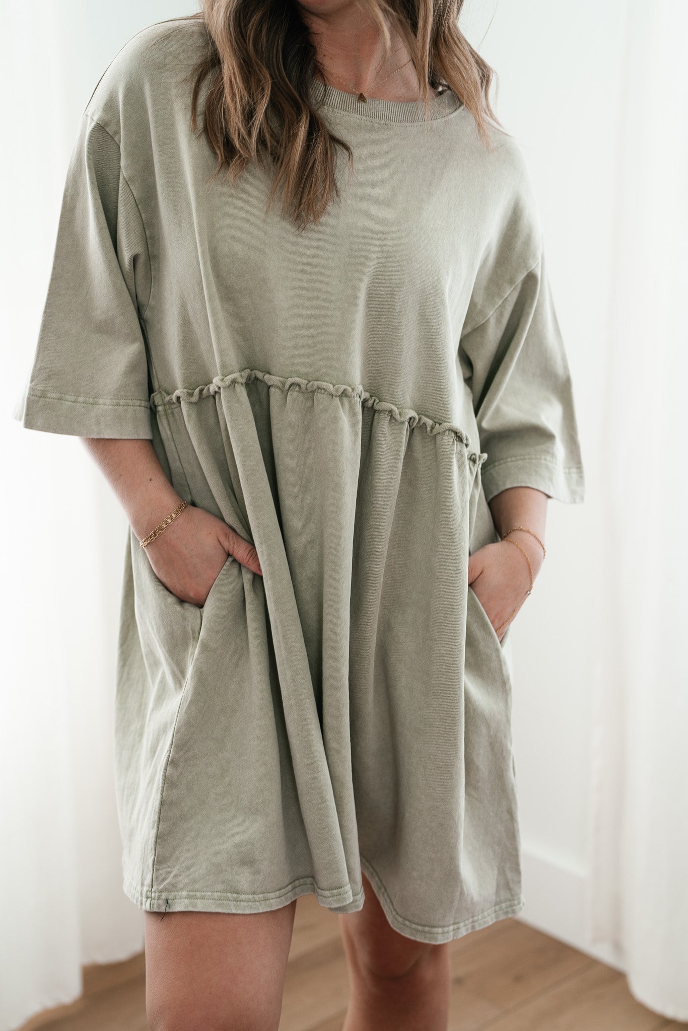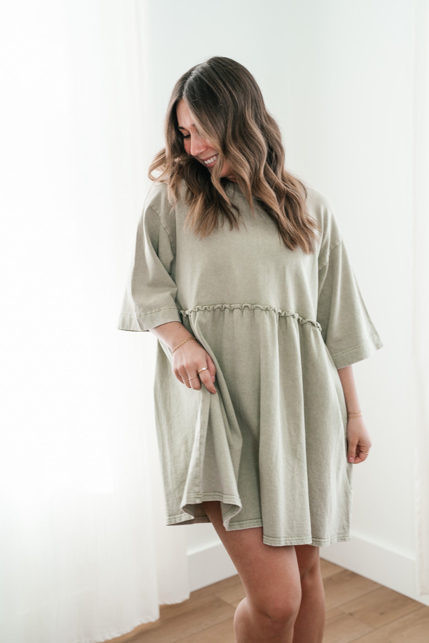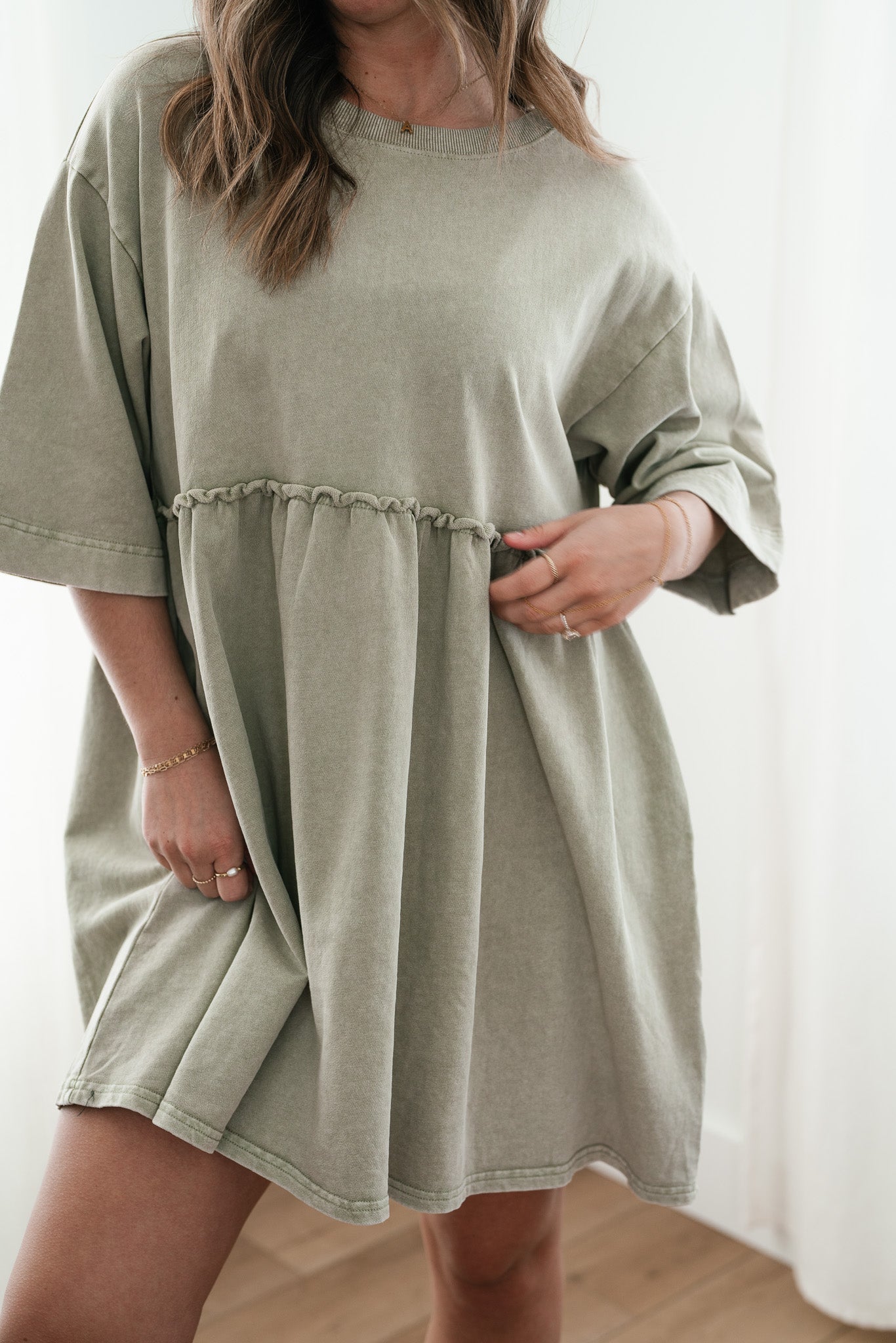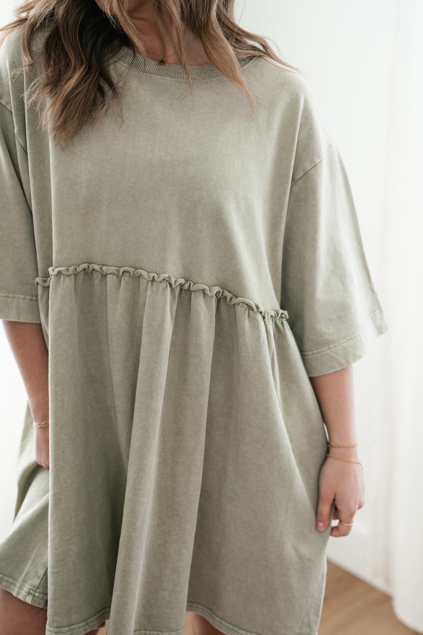 The Wild & Free Mineral Wash Babydoll Dress is the perfect blend of effortless style and casual charm. Featuring a soft, lightweight fabric with a vintage-inspired mineral wash, this dress exudes a laid-back, lived-in look. Its relaxed babydoll silhouette offers a flattering, flowy fit, while delicate details like a round neckline, short sleeves, and subtle pleating add a touch of femininity. Whether you're pairing it with sneakers for a casual day out or layering it with boots and a jacket for cooler evenings, this dress is a versatile must-have for any free-spirited wardrobe.