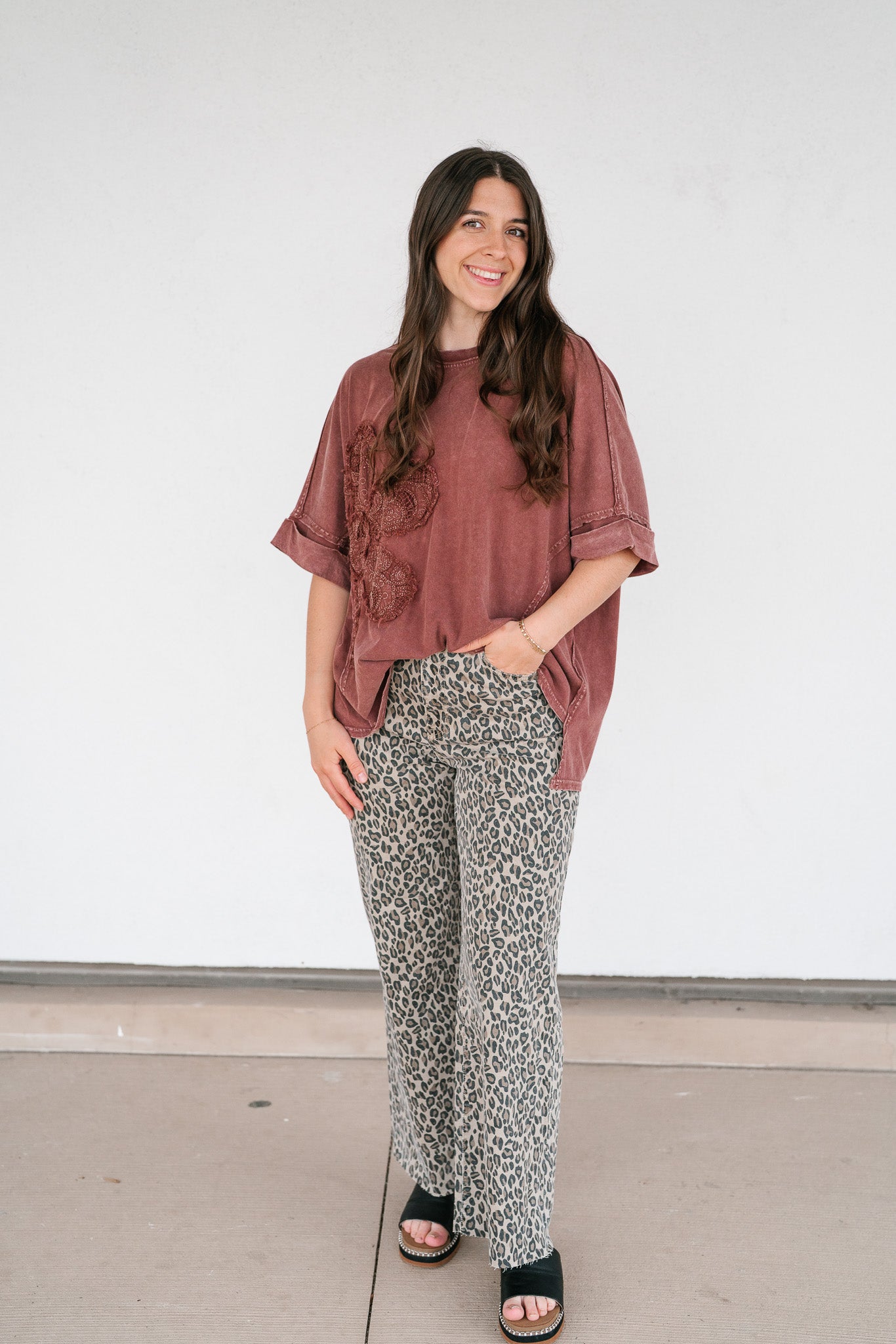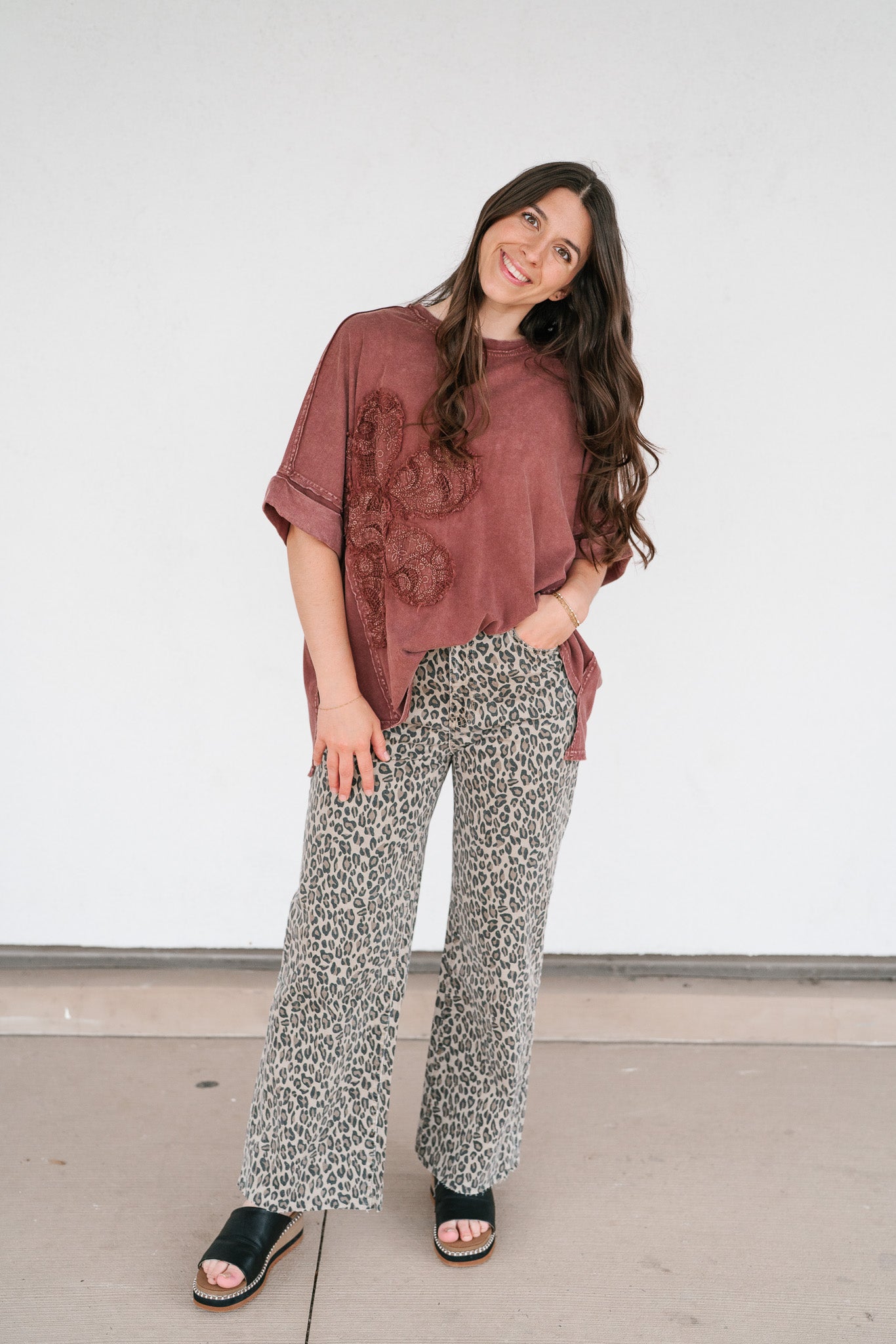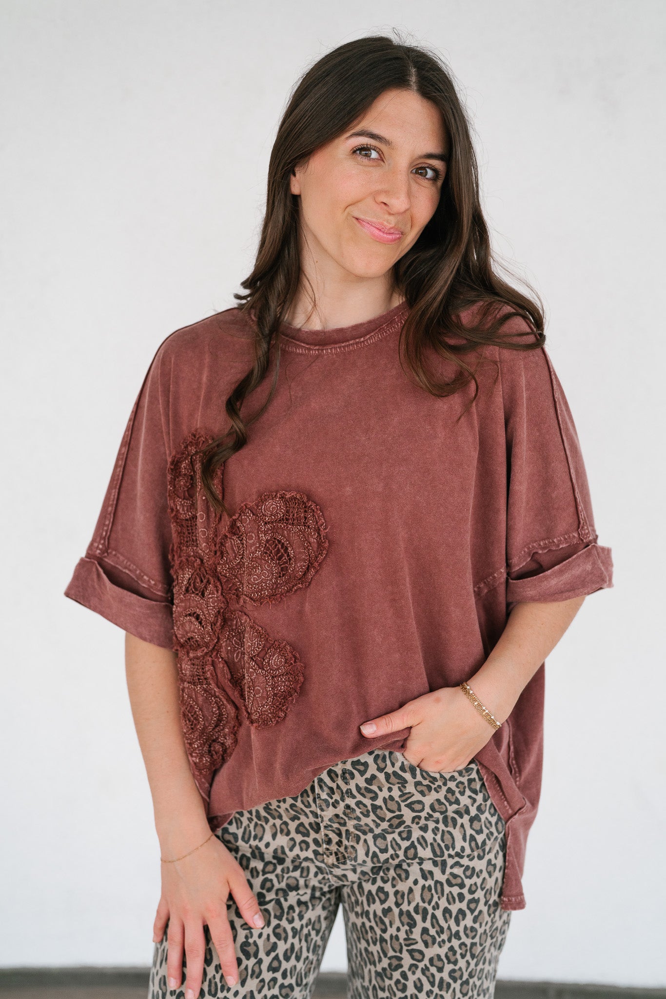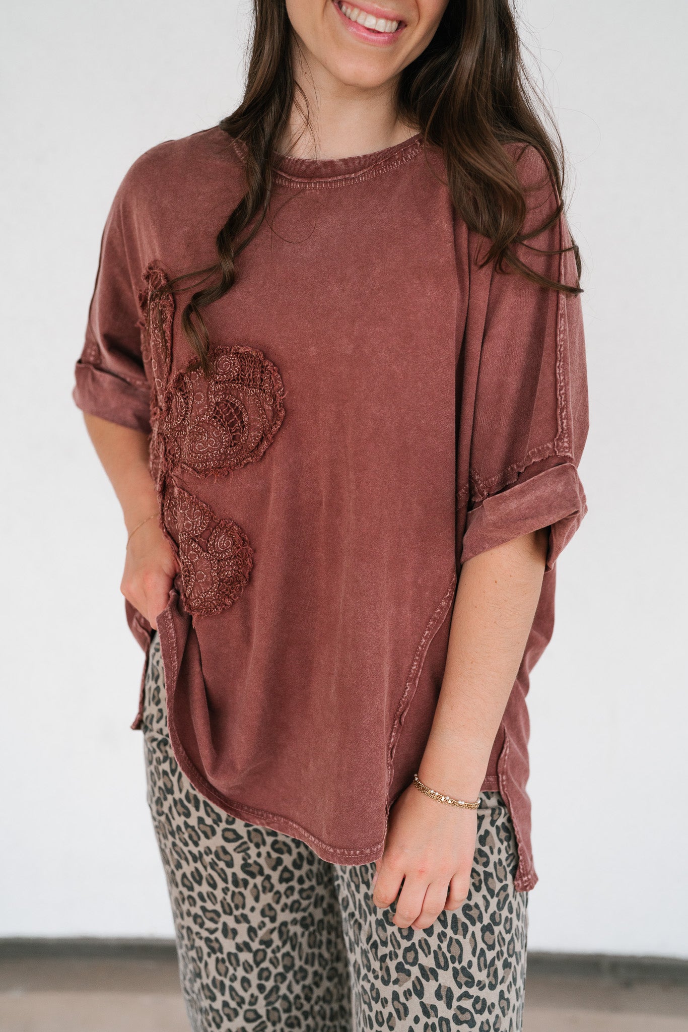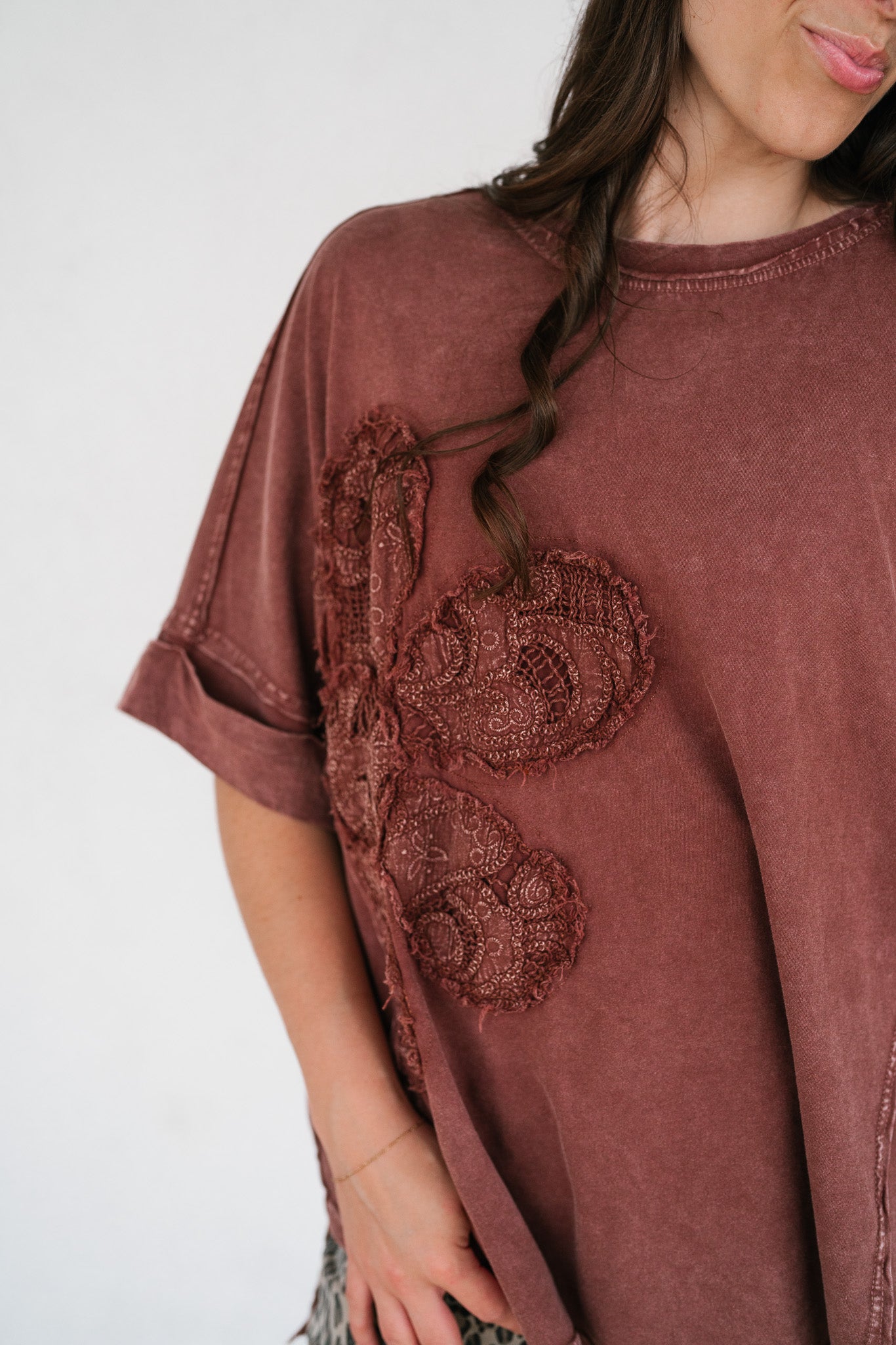 Make a statement in effortless comfort with our Rowan Flower Top. This oversized mineral-washed tee features a bold floral lace appliqué across the front, blending vintage boho vibes with a laid-back silhouette. The raw edge details, rolled short sleeves, and curved hemline give it that perfectly worn-in feel, while the rich mauve tone adds a warm, earthy touch. Pair it with denim shorts, wide-leg pants, or layer it under a shacket for an easygoing yet elevated look.