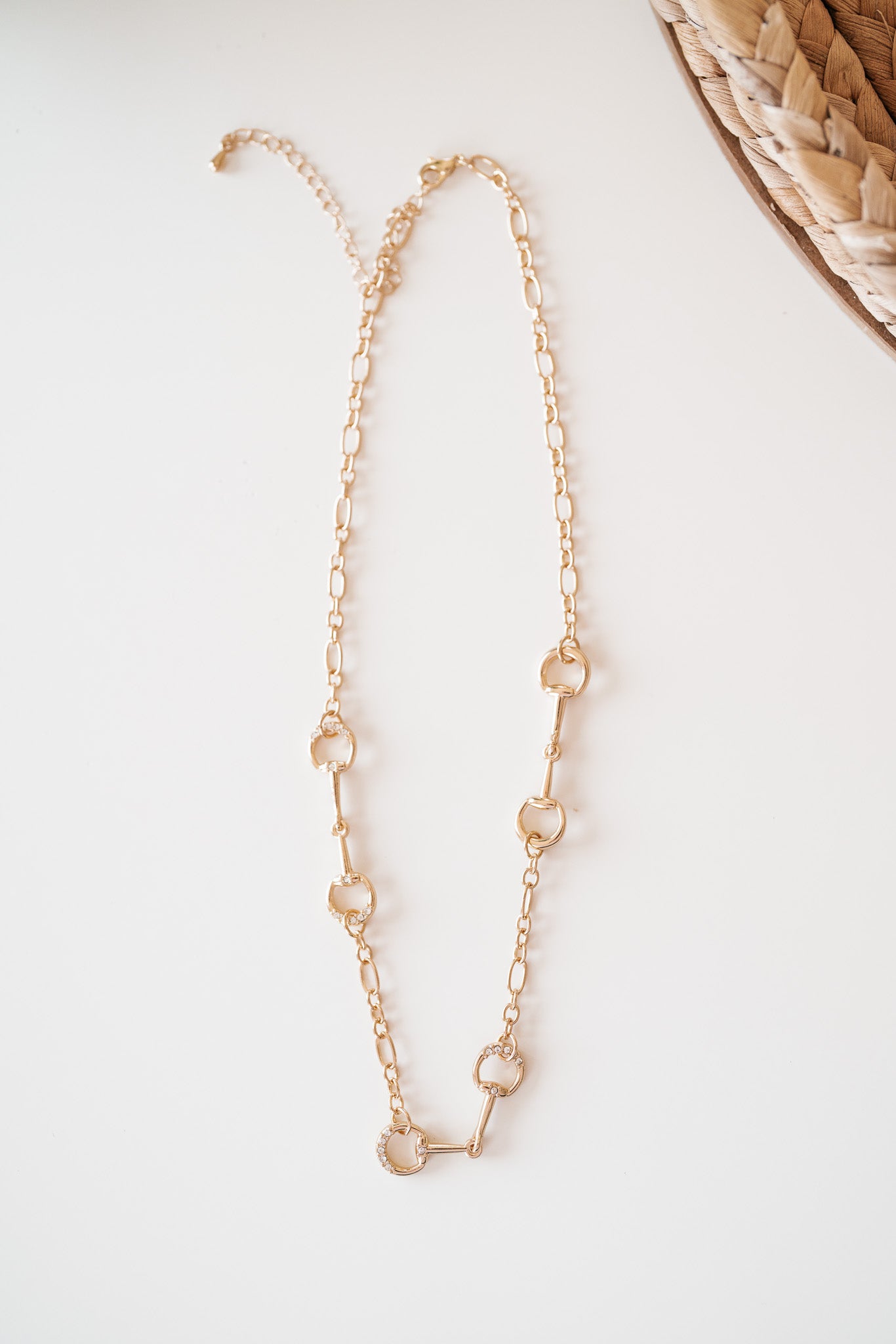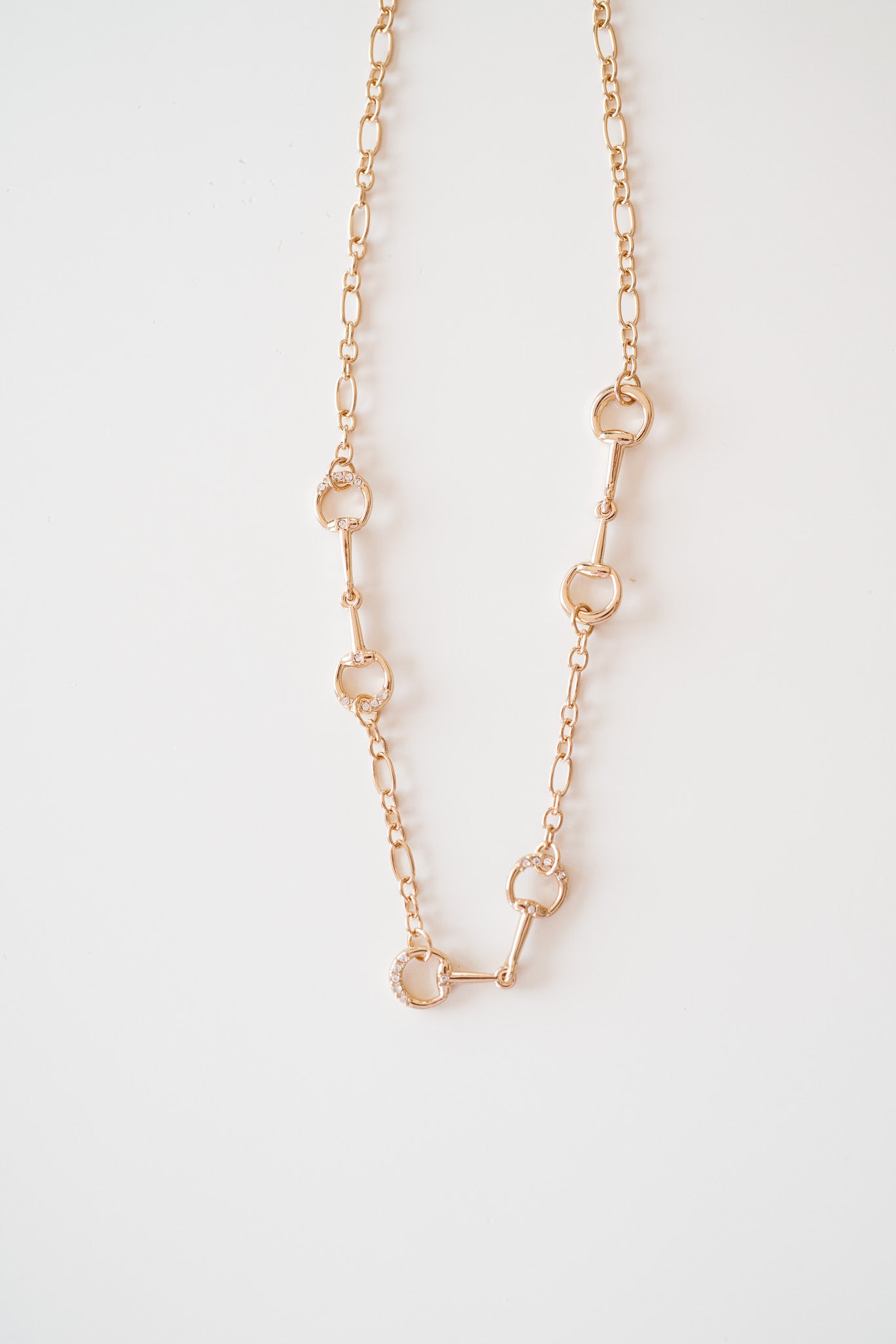 Love a necklace that feels classic with a modern twist? This gold bit-inspired link necklace features delicately shaped equestrian-style connectors and a lightweight chain that instantly elevates any look. With a subtle touch of sparkle on a few of the links, it’s the perfect piece for layering or wearing solo for a refined, everyday finish. Chic, versatile, and effortlessly polished.