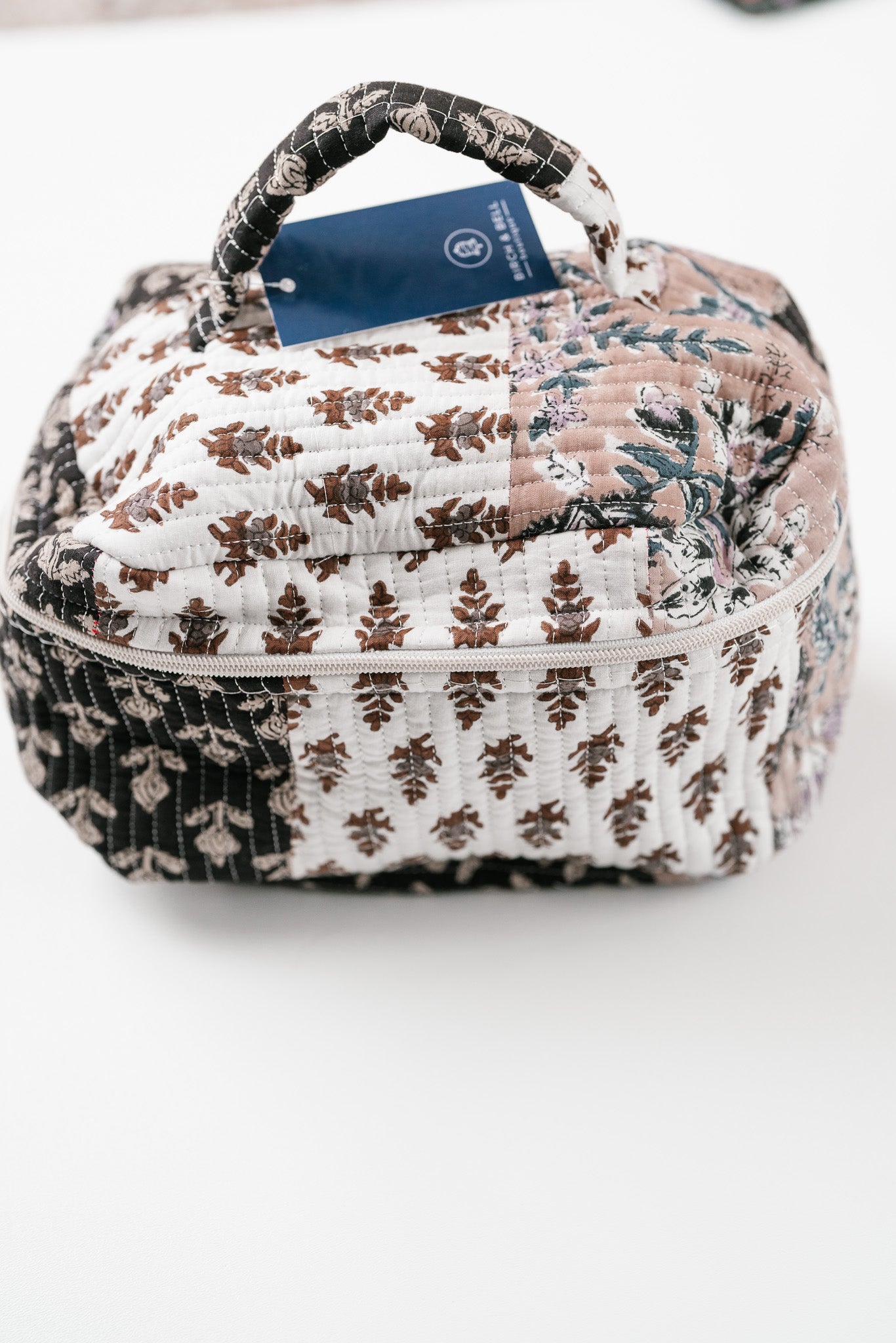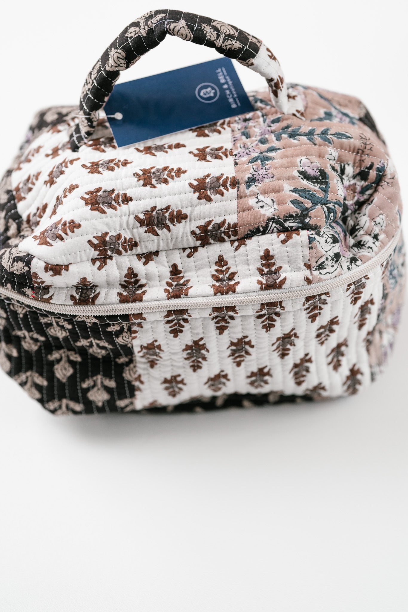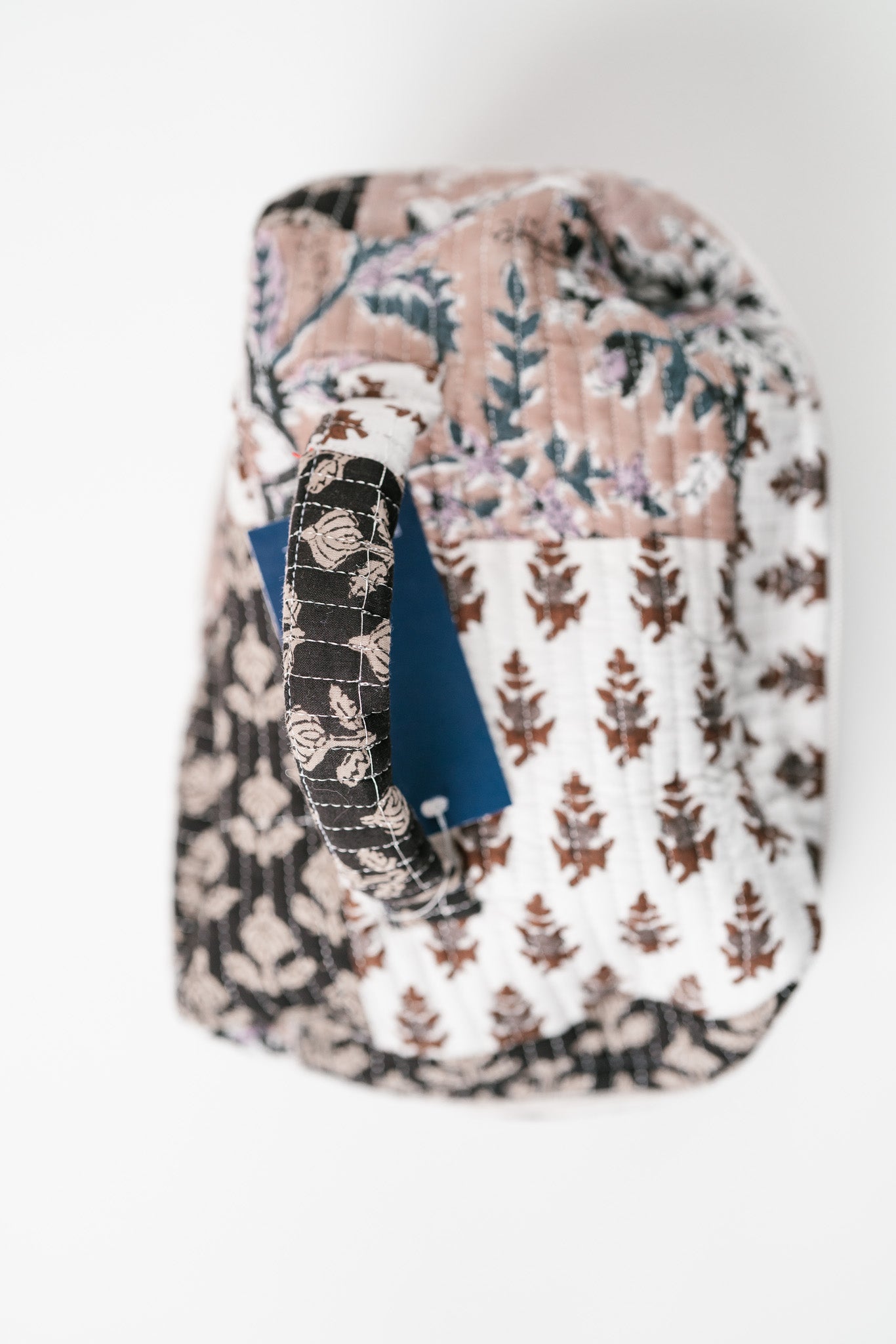 Stay organized in style with this charming quilted makeup bag. Featuring earthy neutral tones with delicate floral patterns, this bag exudes feminine elegance. The structured design includes a spacious interior perfect for holding cosmetics, toiletries, or travel essentials. A convenient top handle and smooth zipper closure make it easy to grab and go, while the quilted texture adds a cozy, handcrafted touch. Whether for daily use or as a travel companion, this makeup bag is as practical as it is pretty!