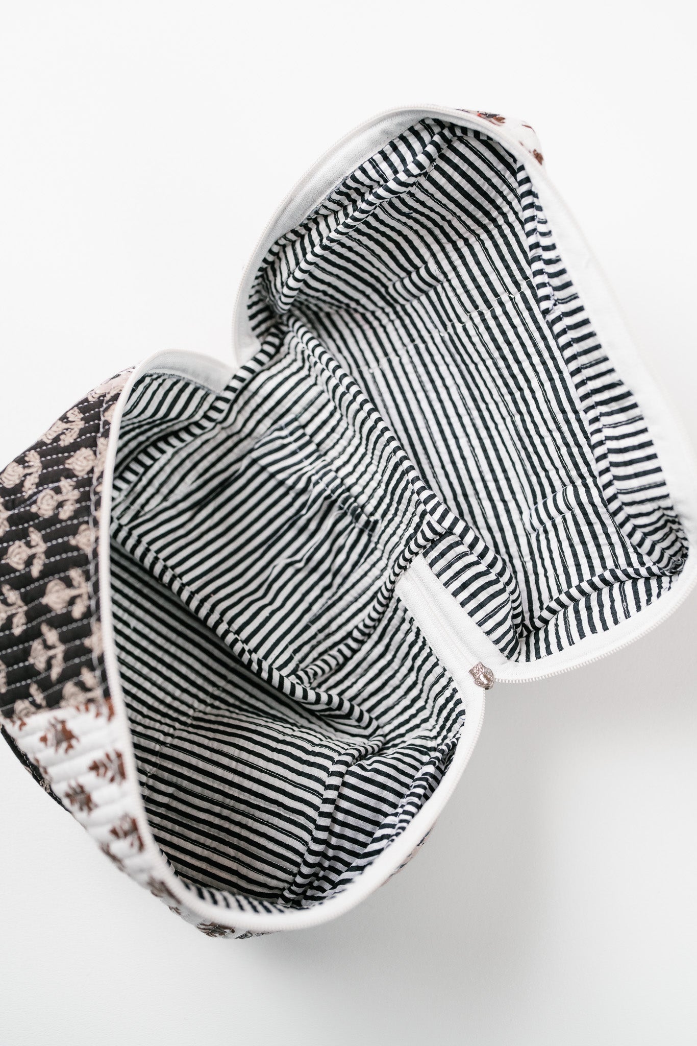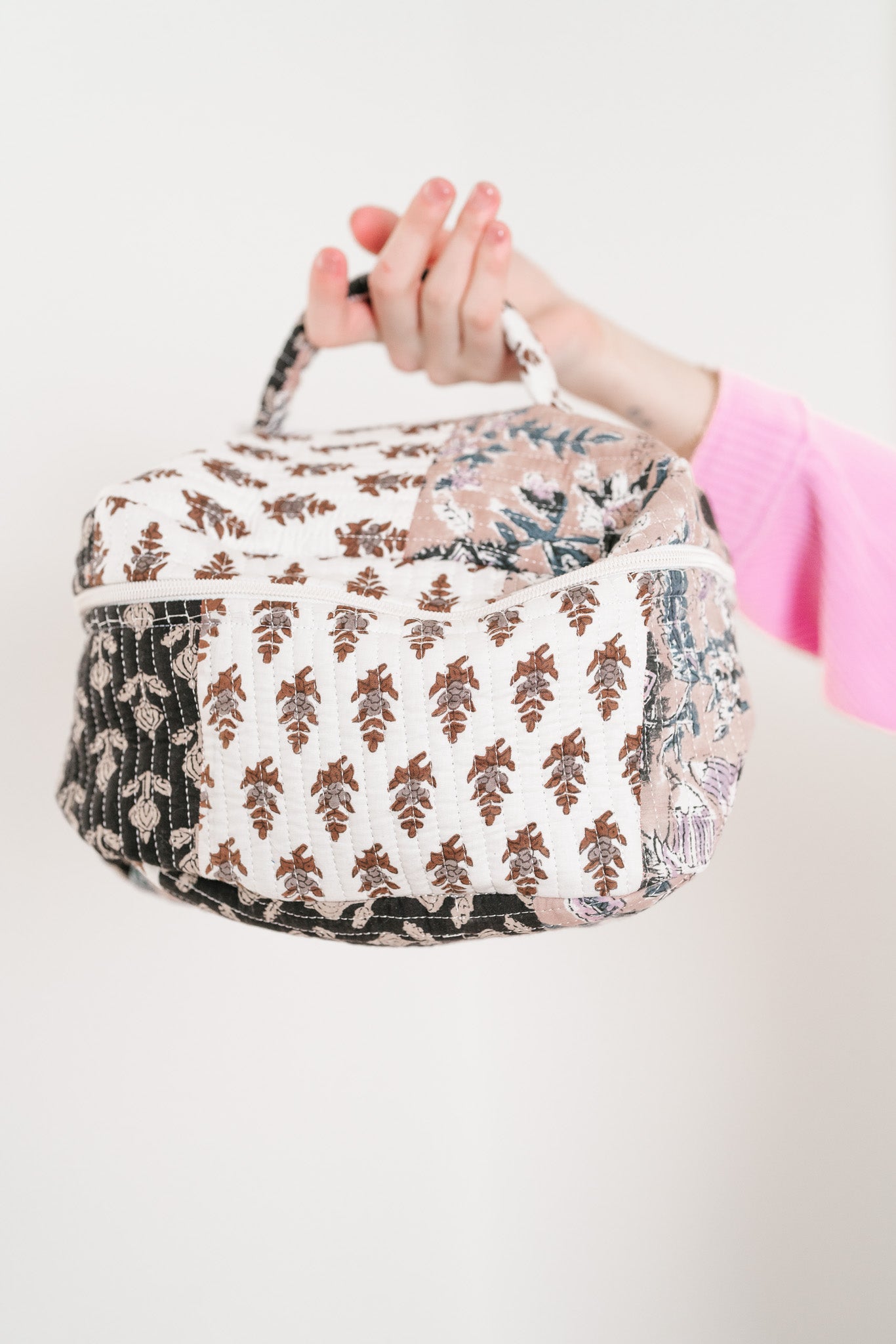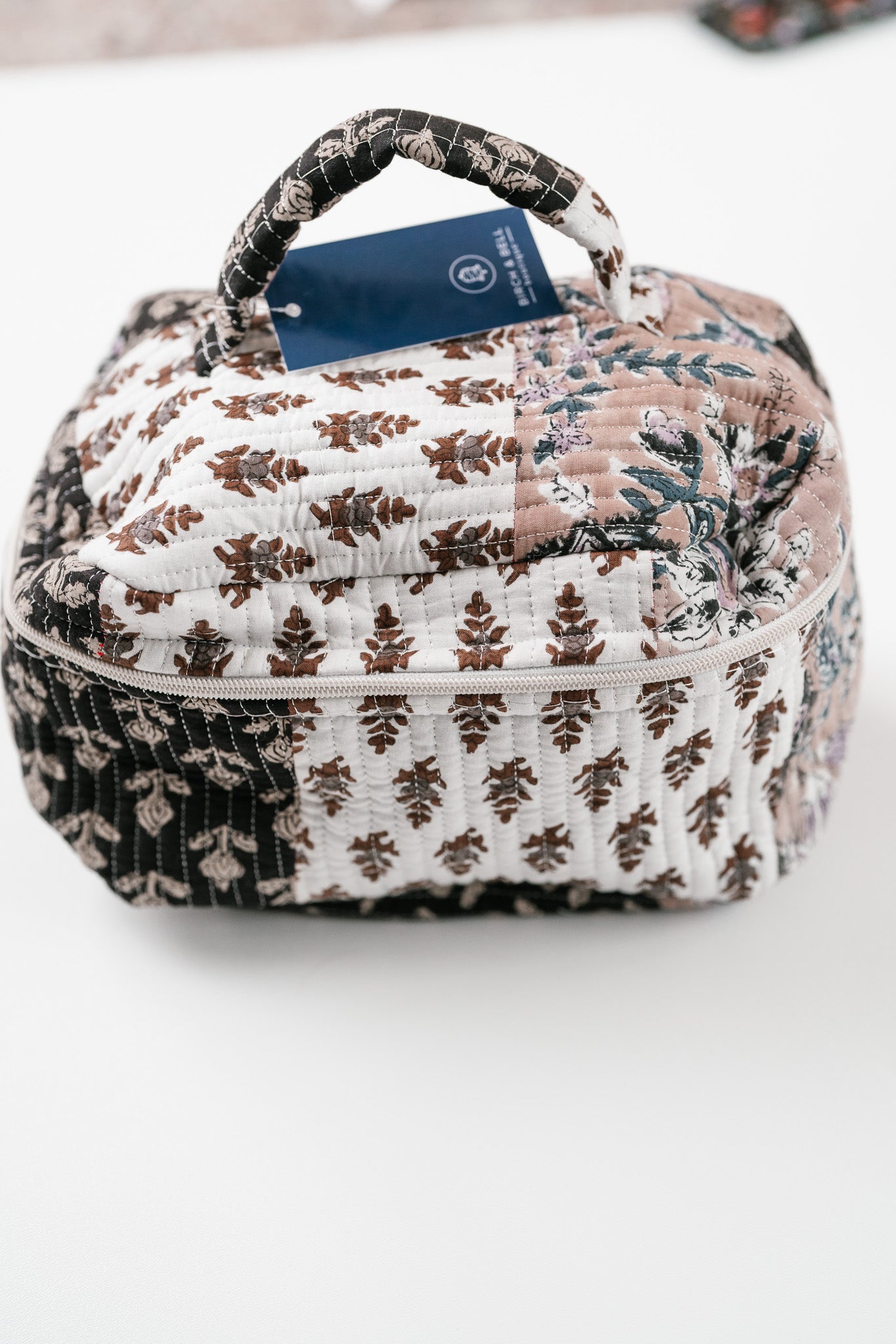 Stay organized in style with this charming quilted makeup bag. Featuring earthy neutral tones with delicate floral patterns, this bag exudes feminine elegance. The structured design includes a spacious interior perfect for holding cosmetics, toiletries, or travel essentials. A convenient top handle and smooth zipper closure make it easy to grab and go, while the quilted texture adds a cozy, handcrafted touch. Whether for daily use or as a travel companion, this makeup bag is as practical as it is pretty!
