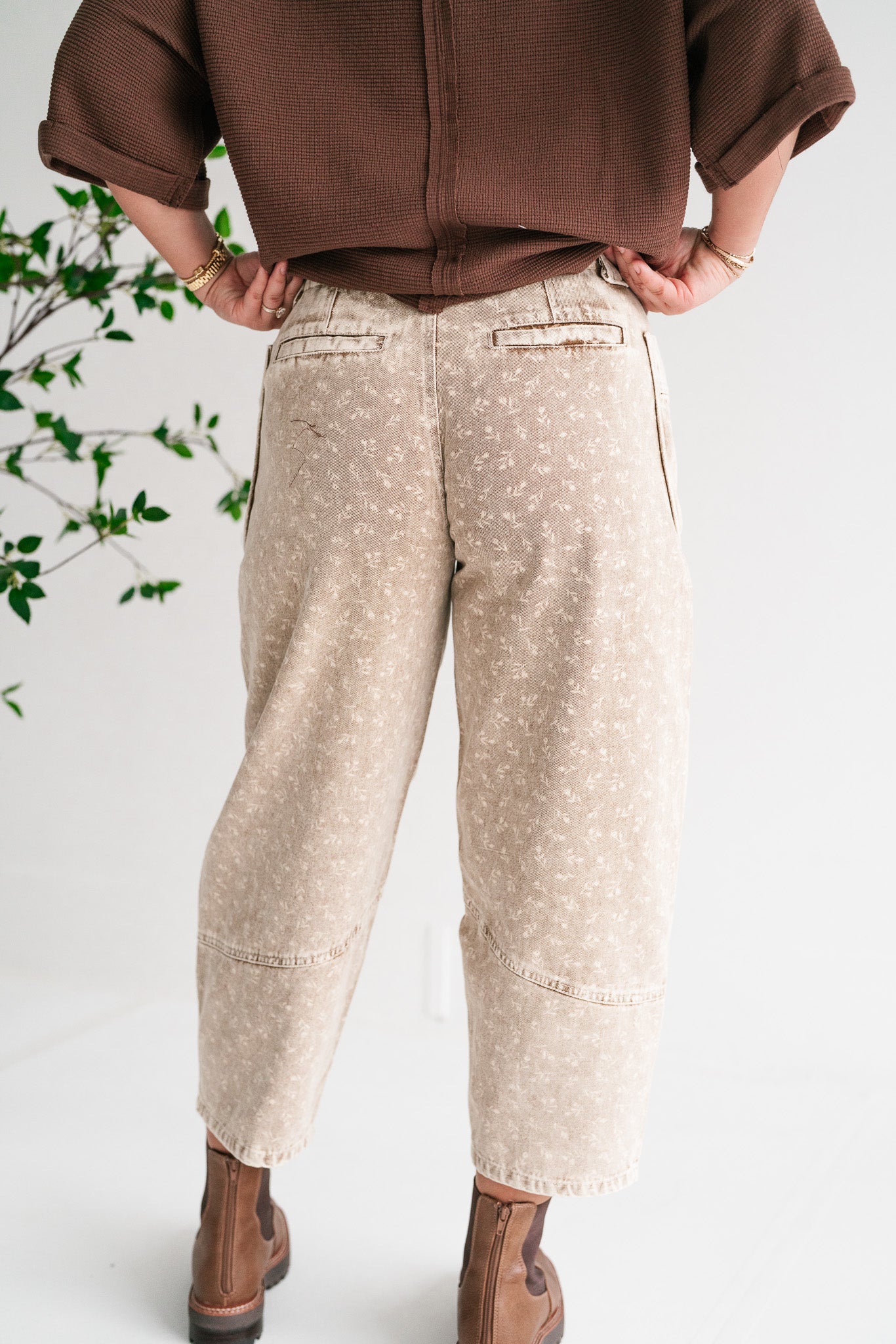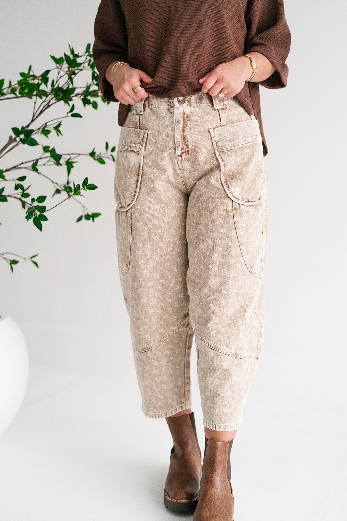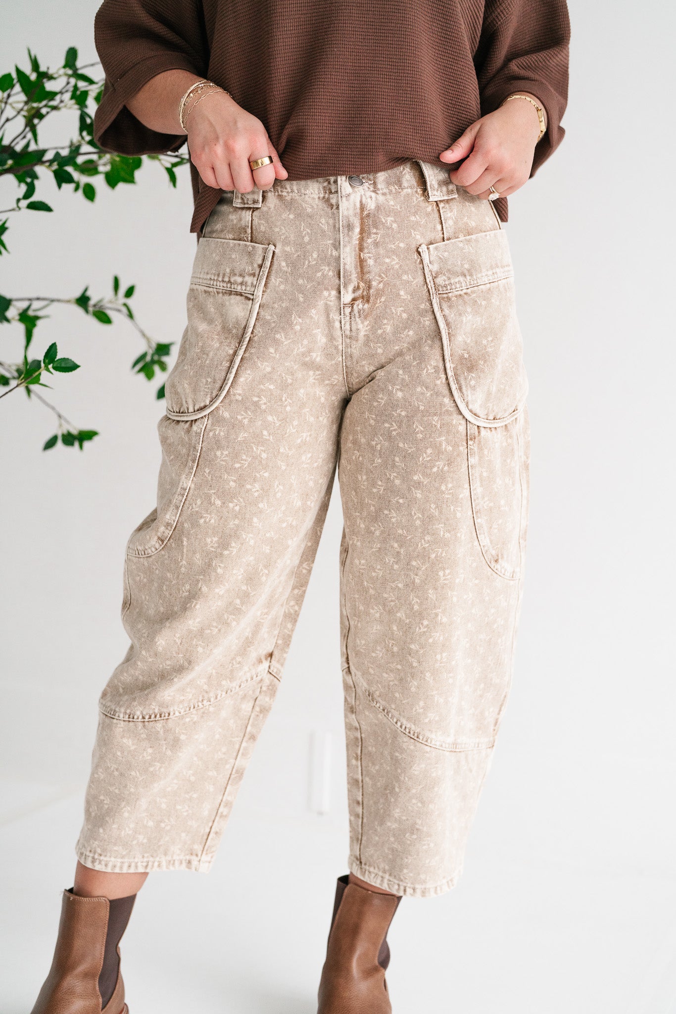 Step out in effortless style with our unique Field Notes Floral Barrel Pant . These eye-catching culottes blend vintage-inspired aesthetics with modern utility, featuring a beautifully faded beige wash adorned with a subtle all-over floral print. Perfect for those who appreciate comfort without compromising on a distinctive look, they offer a relaxed fit that's ideal for everyday wear or your next adventure. These cargo barrel capris are designed for both style and functionality, boasting generous oversized utility pockets on the front that add a trendy, practical element. Crafted from a durable yet comfortable fabric, they provide breathability and ease of movement, making them a versatile addition to your wardrobe. Pair them with a simple tee for a casual bohemian vibe or dress them up with a stylish blouse and sandals.