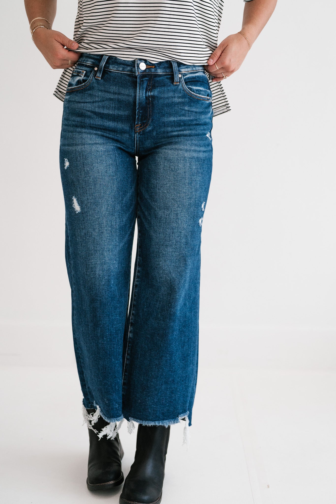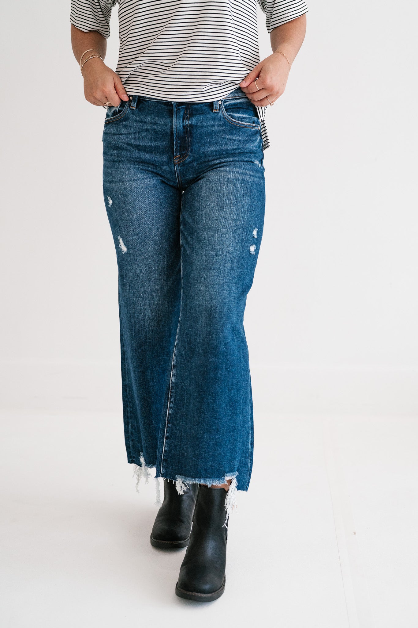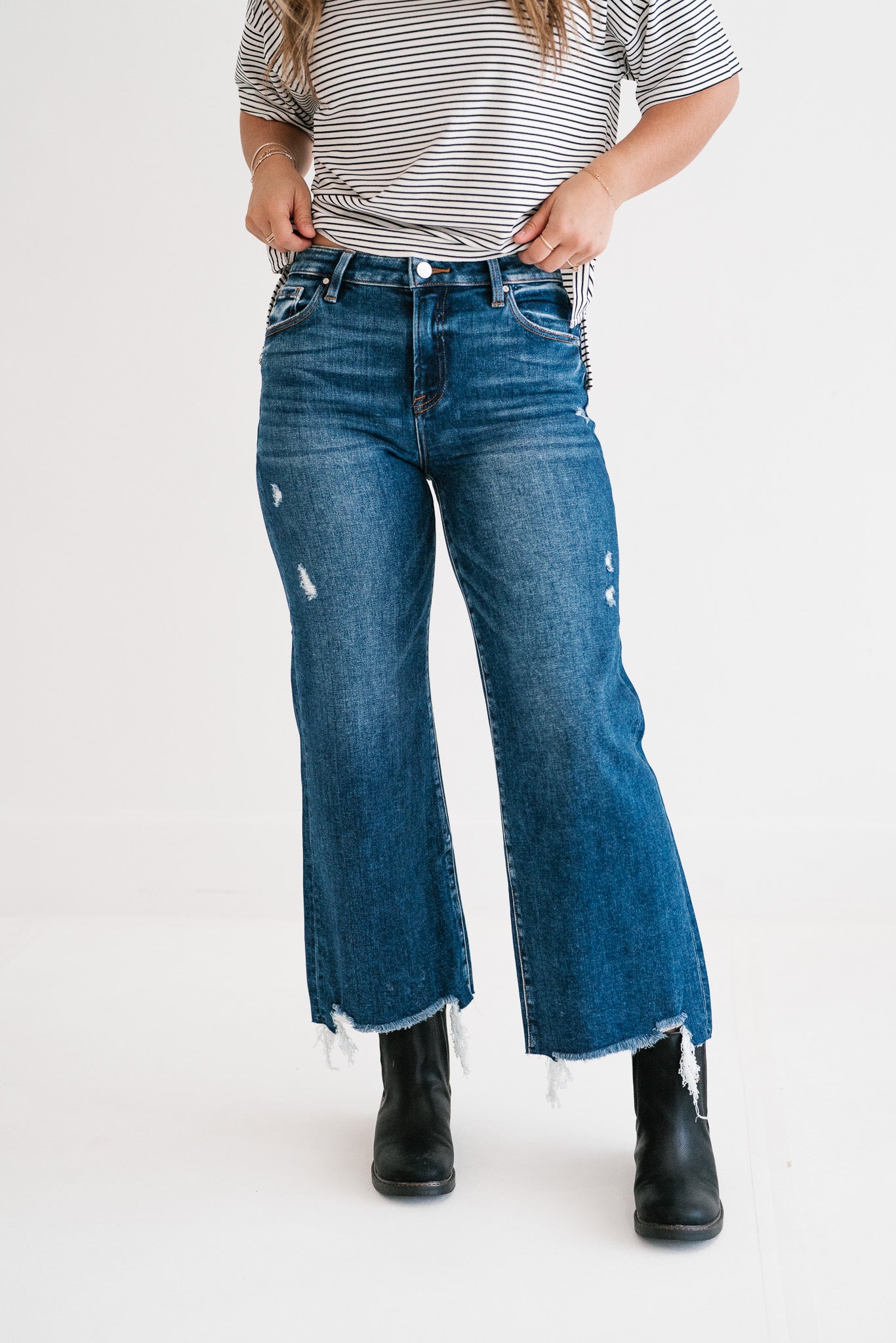 Unleash your inner style icon with the Risen Heidi Dark Wash Distressed High-Rise Raw Hem Wide Leg Crop Jeans. Designed for the modern trendsetter, these jeans blend classic denim appeal with contemporary edgy details, offering both unparalleled comfort and a fashion-forward silhouette. Perfect for elevating your everyday look or making a statement on a casual night out. Crafted from premium, soft denim, these jeans feature a flattering high-rise waist that cinches you in, while the wide-leg crop cut provides a relaxed yet chic fit. Subtle distressing on the thighs adds a touch of rebellion, perfectly complemented by the on-trend raw, frayed hem that gives them a unique, lived-in character. The versatile dark wash makes them easy to pair with anything in your wardrobe. Experience the perfect fusion of comfort and cool. Whether you dress them up with heels and a blouse or keep it casual with sneakers and a tee, these Risen jeans are a must-have addition that promises to be a go-to piece for seasons to come, offering endless styling possibilities.