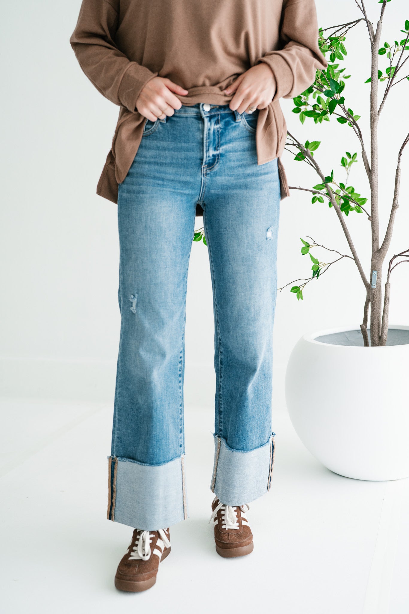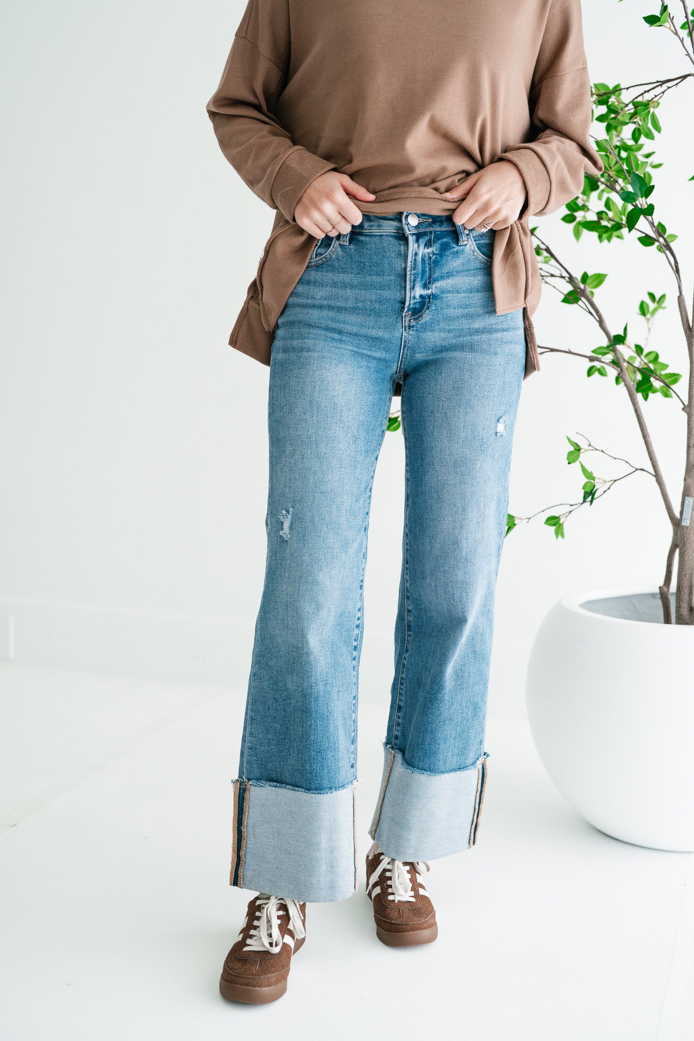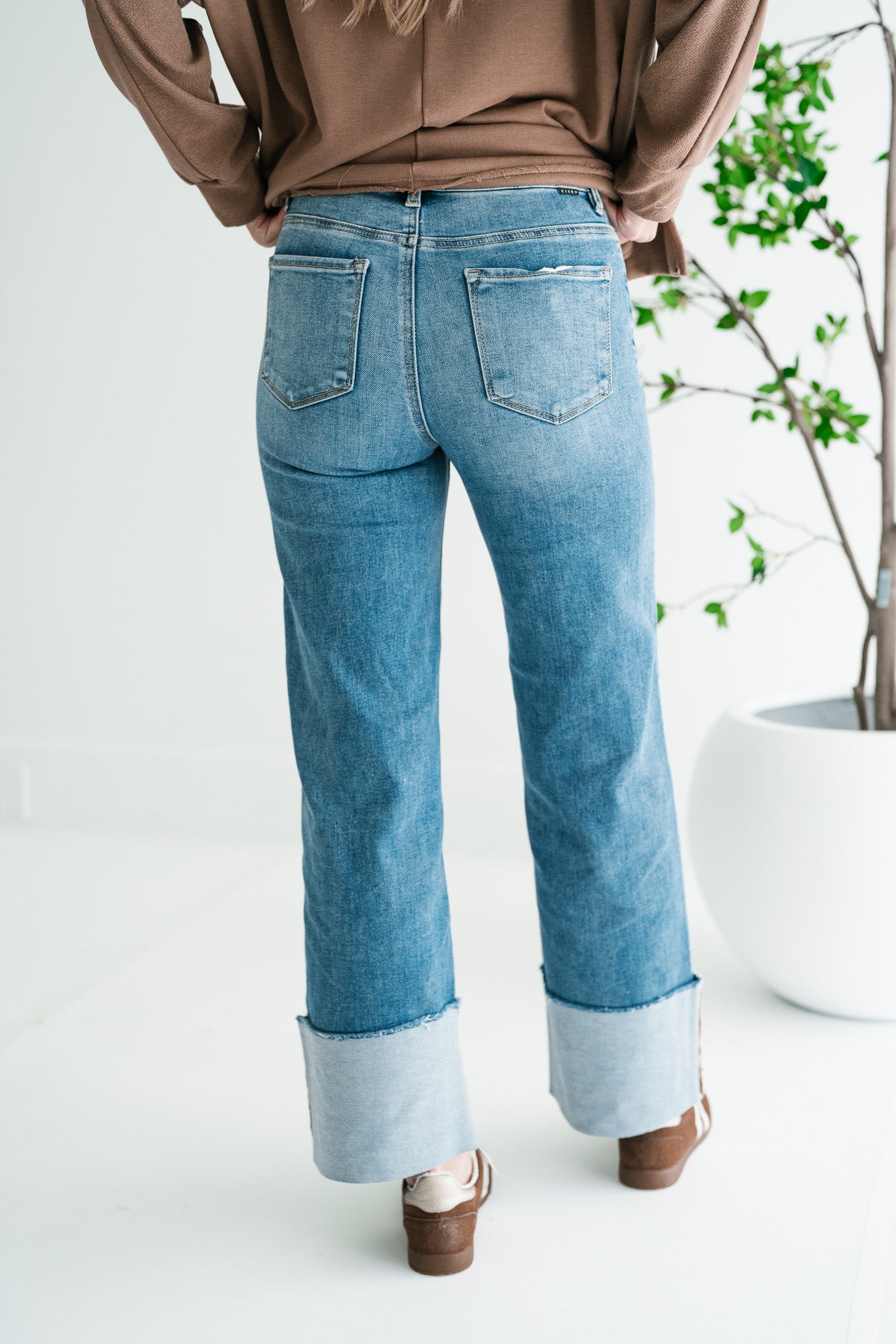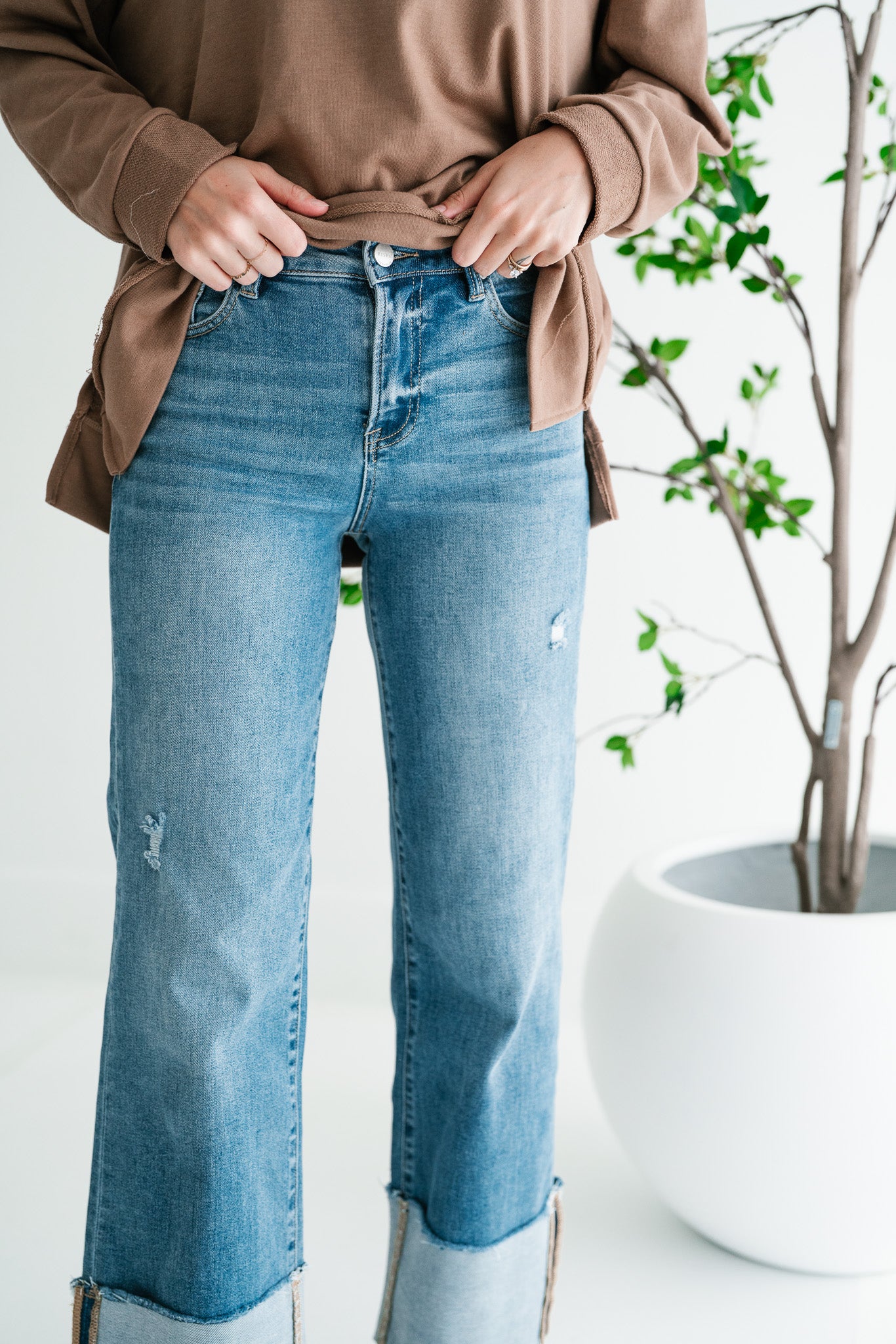 Step out in effortless style with the Risen Zienna Jeans Women's Distressed Wide Leg Cropped Cuffed Denim. These on-trend jeans offer the perfect blend of vintage charm and modern sophistication, designed for the fashion-forward woman seeking both comfort and flair. Crafted from premium medium-wash denim, these jeans feature subtle distressing and whiskering for an authentic, lived-in look. The flattering wide-leg silhouette provides a relaxed yet chic fit, while the expertly cuffed hem reveals a unique, contrasting stripe detail, adding an unexpected touch of elegance to your casual ensemble. Whether you're pairing them with sneakers for a casual day out or dressing them up with heels and a blouse for an evening gathering, these versatile Risen jeans are a wardrobe essential. Embrace superior comfort and undeniable style that transitions seamlessly from season to season.