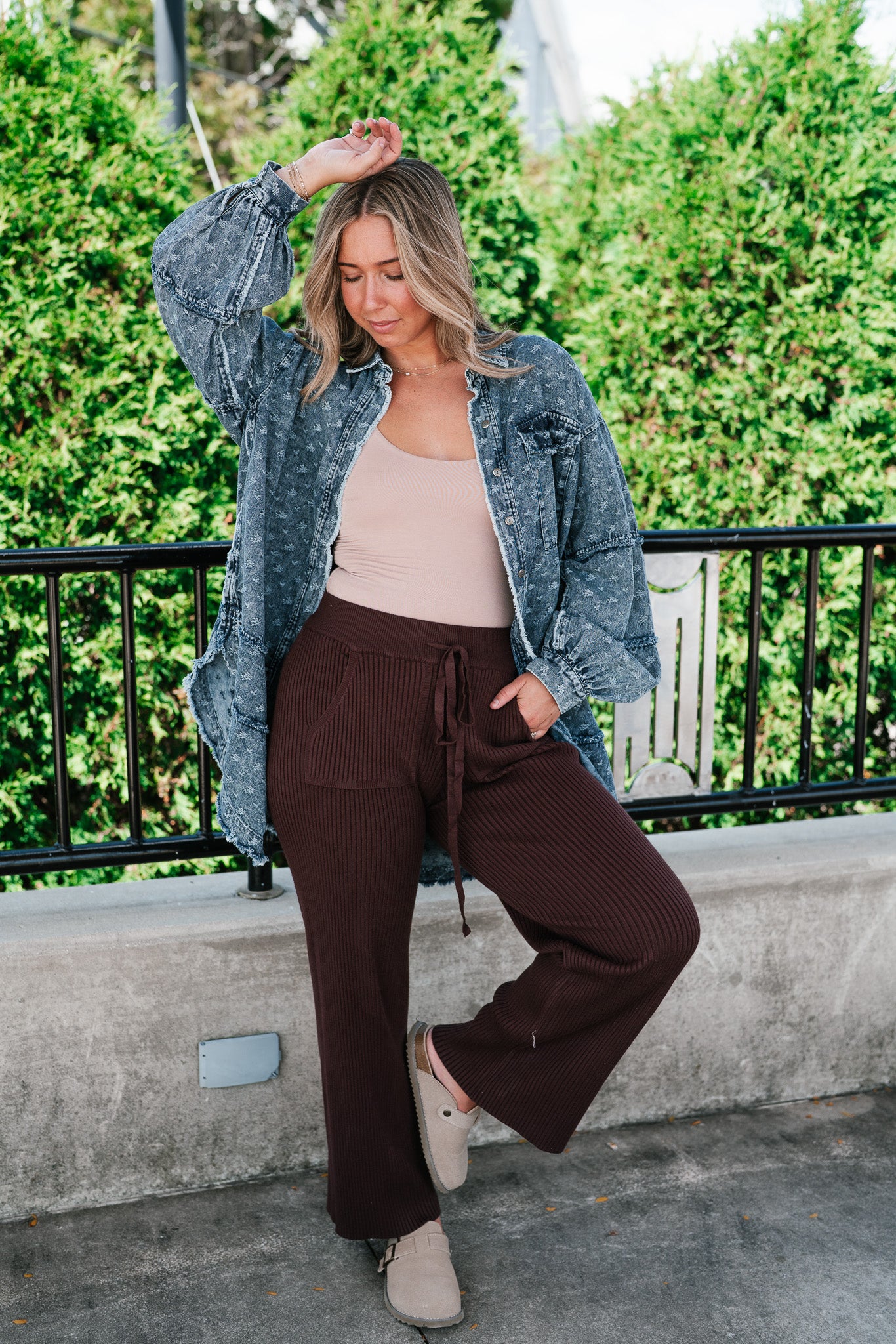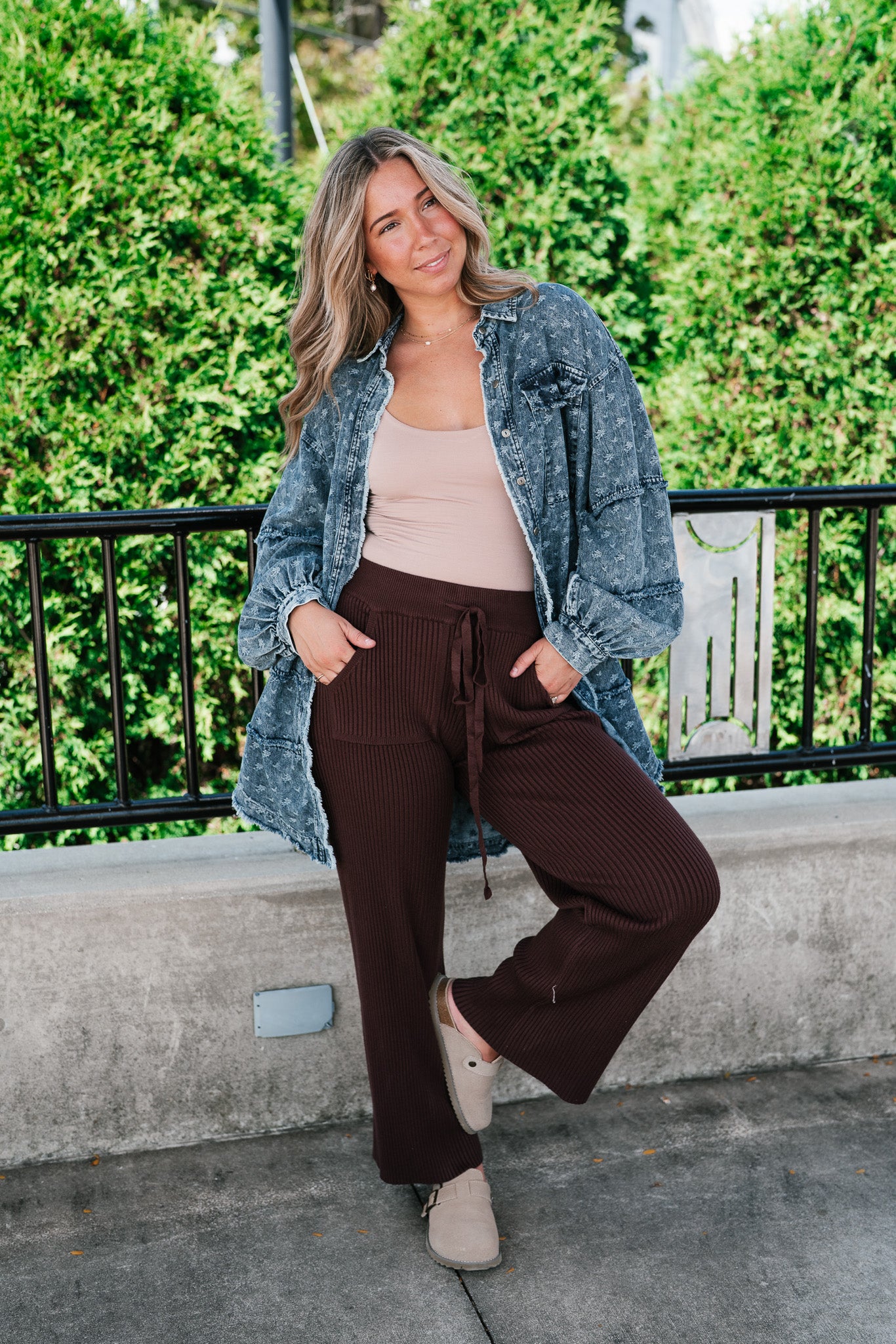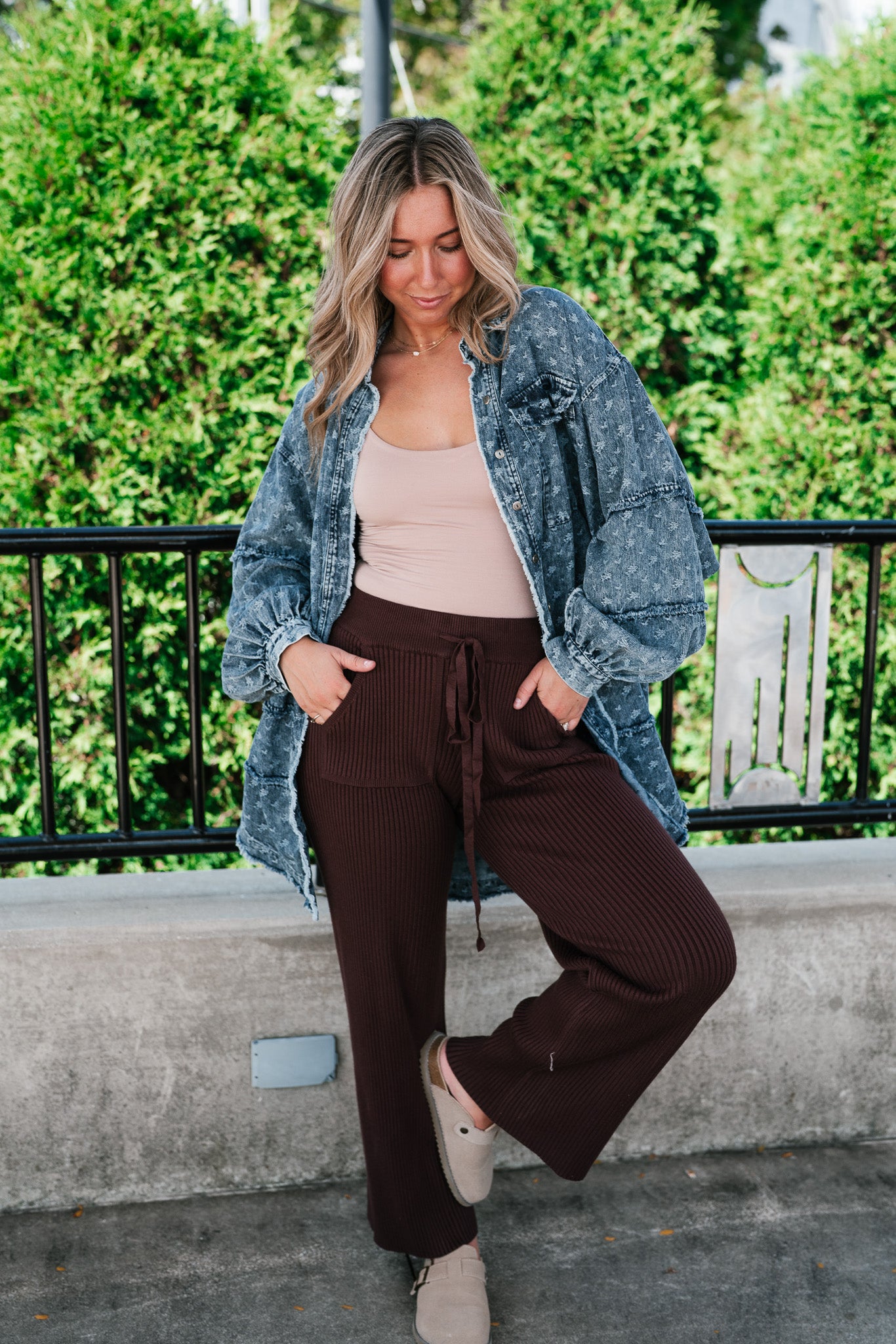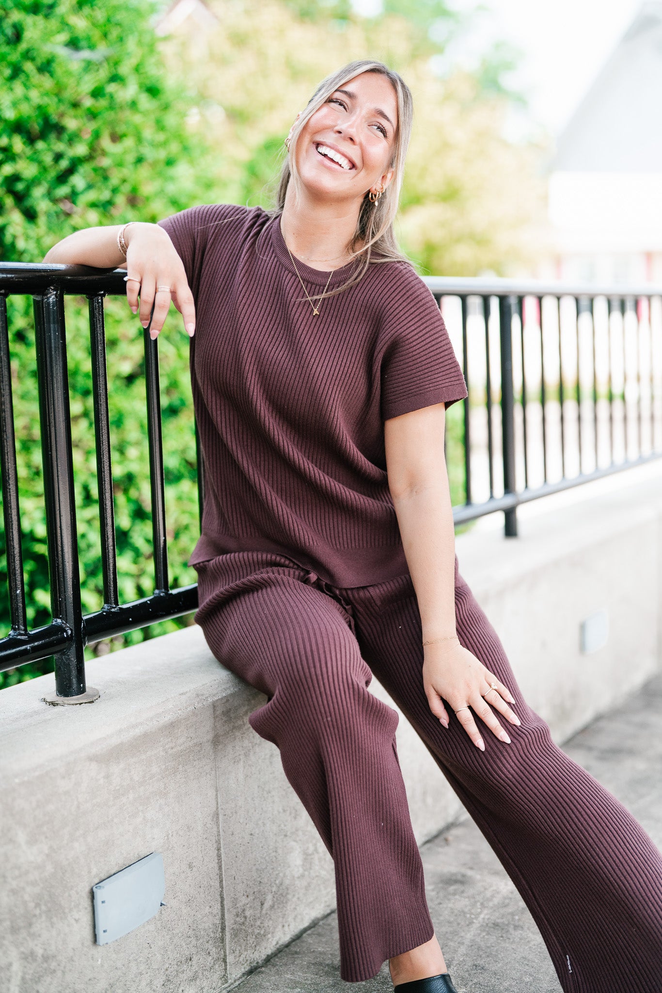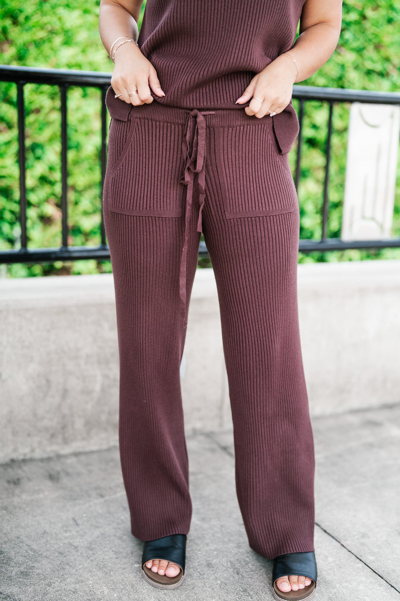 Comfort Breeze Ribbed Wide Leg Pant - Brown will elevate your loungewear collection.