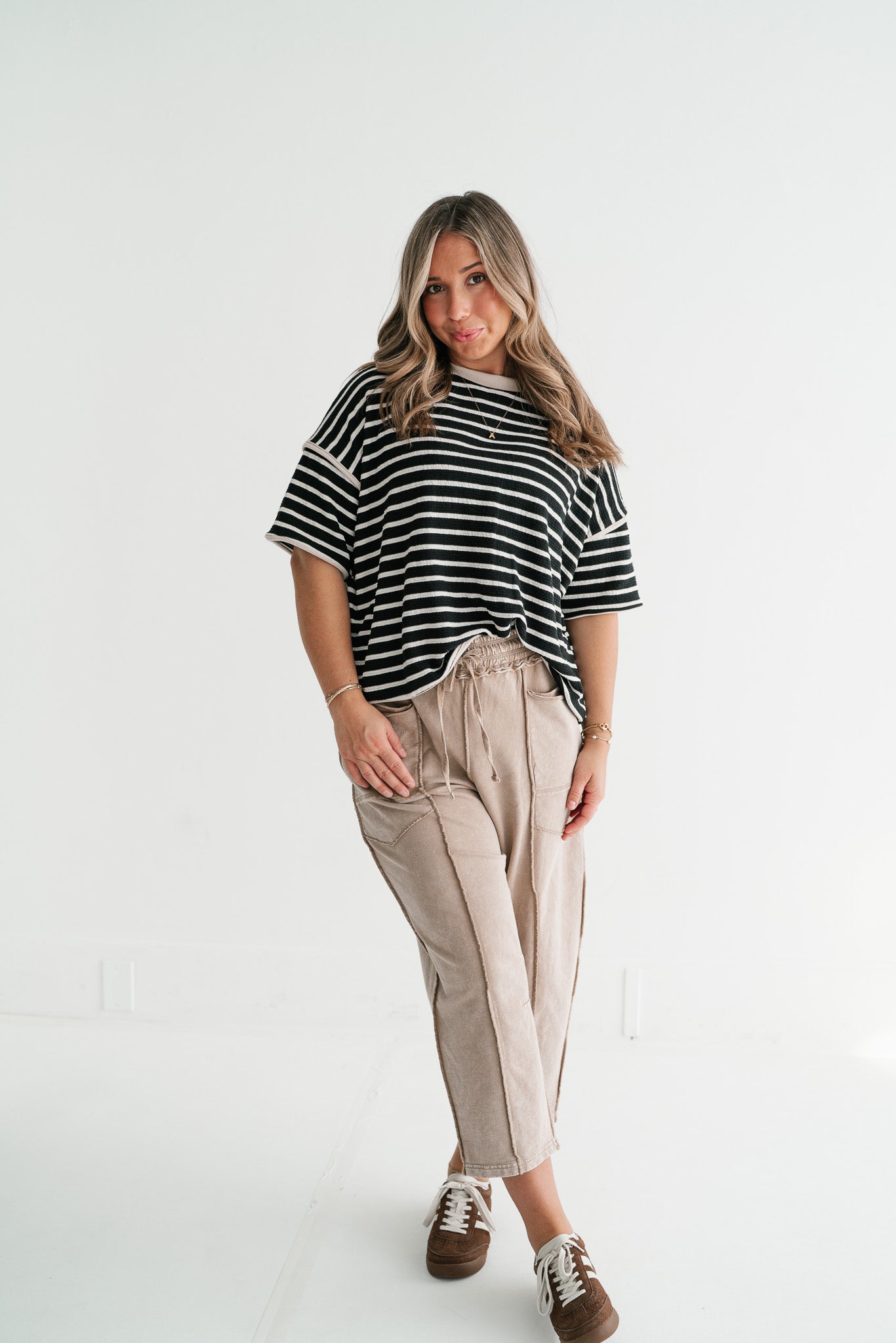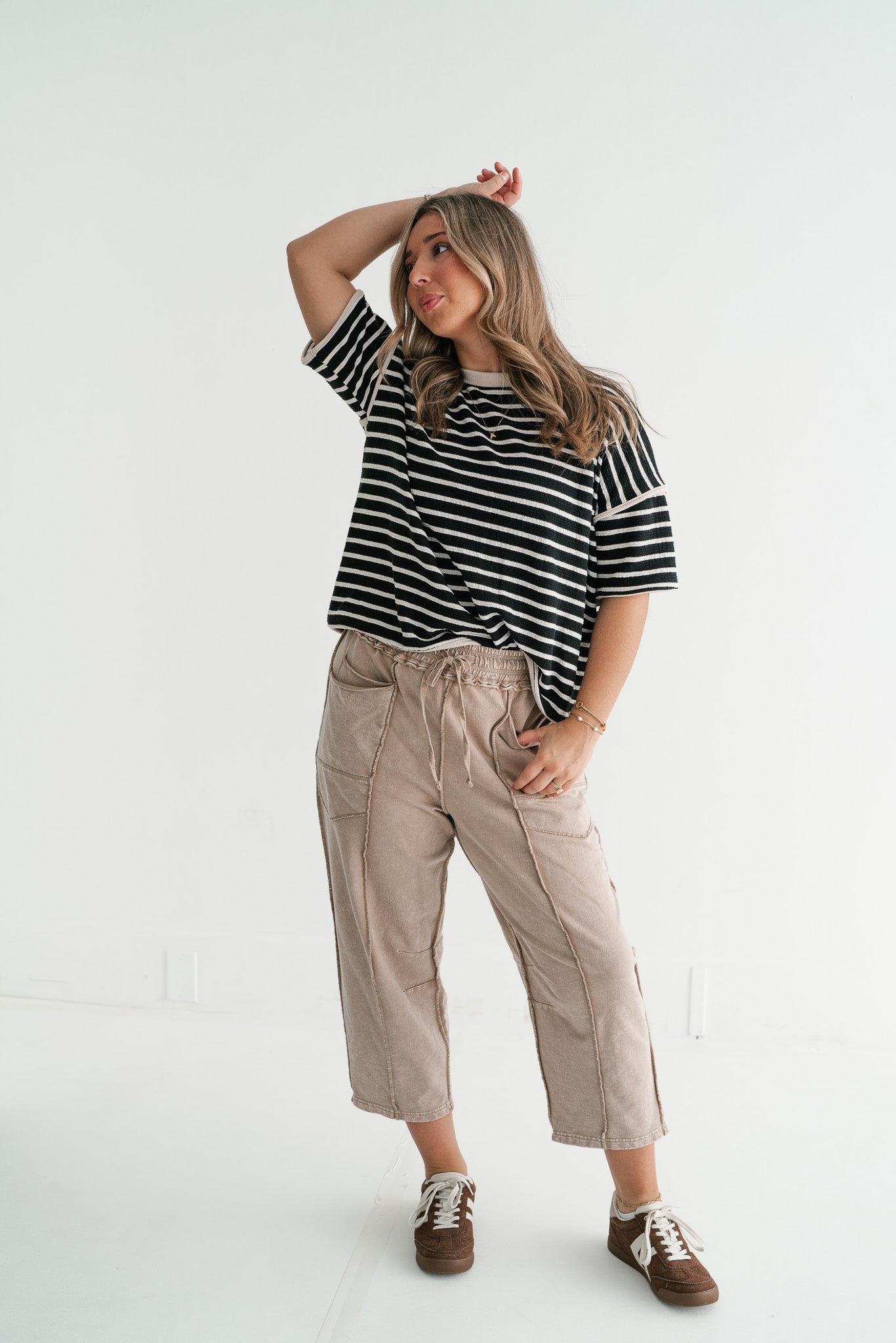 Embrace effortless style with our must-have Oversized Daybreak Striped Knit Top. This piece beautifully merges classic sophistication with modern comfort, featuring timeless  horizontal stripes that offer a versatile foundation for any outfit. Its relaxed, roomy fit drapes elegantly, making it an ideal choice for a casual yet polished look that can take you from day to night with ease. Indulge in the luxurious feel of the soft, textured ribbed knit fabric, designed for ultimate comfort and breathability. The thoughtful addition of a delicate colored trim on the crew neck, short sleeves, and hem elevates the top, adding a subtle touch of warmth and refinement. This top is perfect for transitional weather, offering just the right amount of coverage while remaining lightweight enough for layering or stand-alone wear.