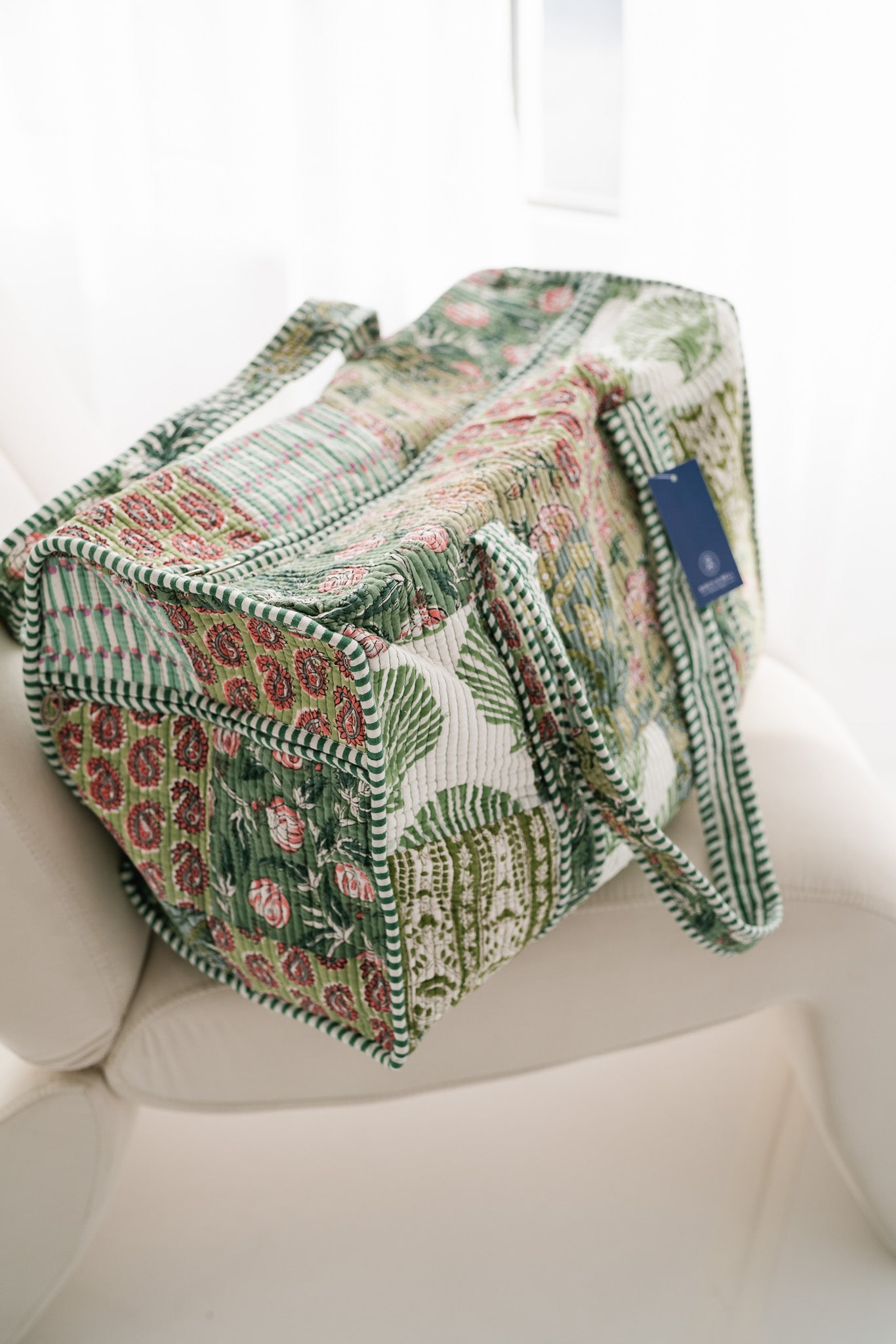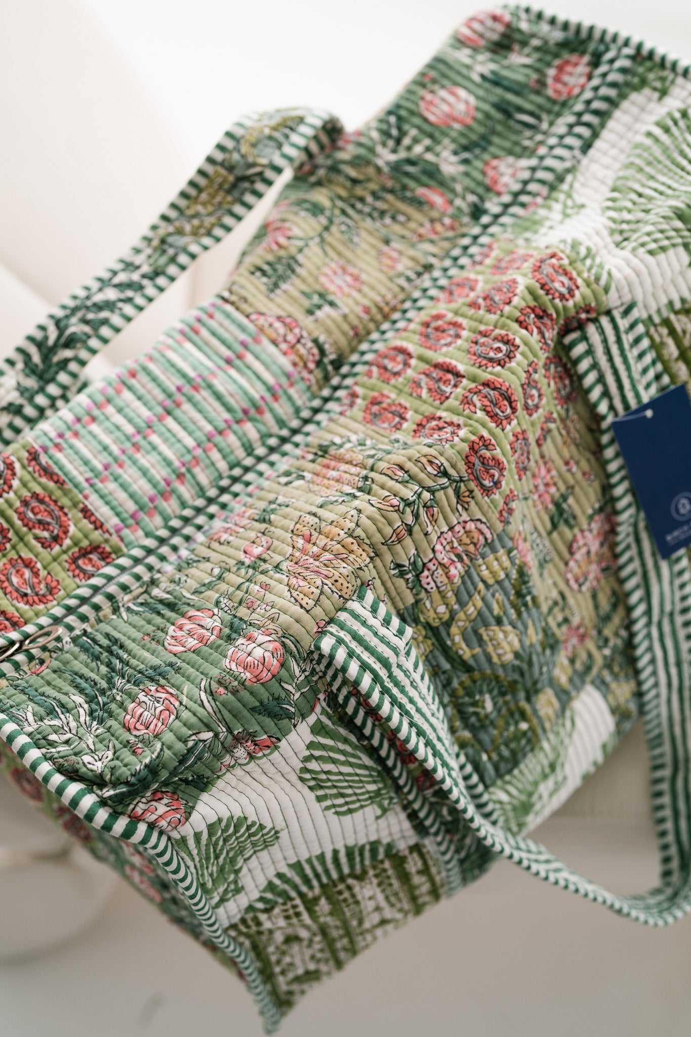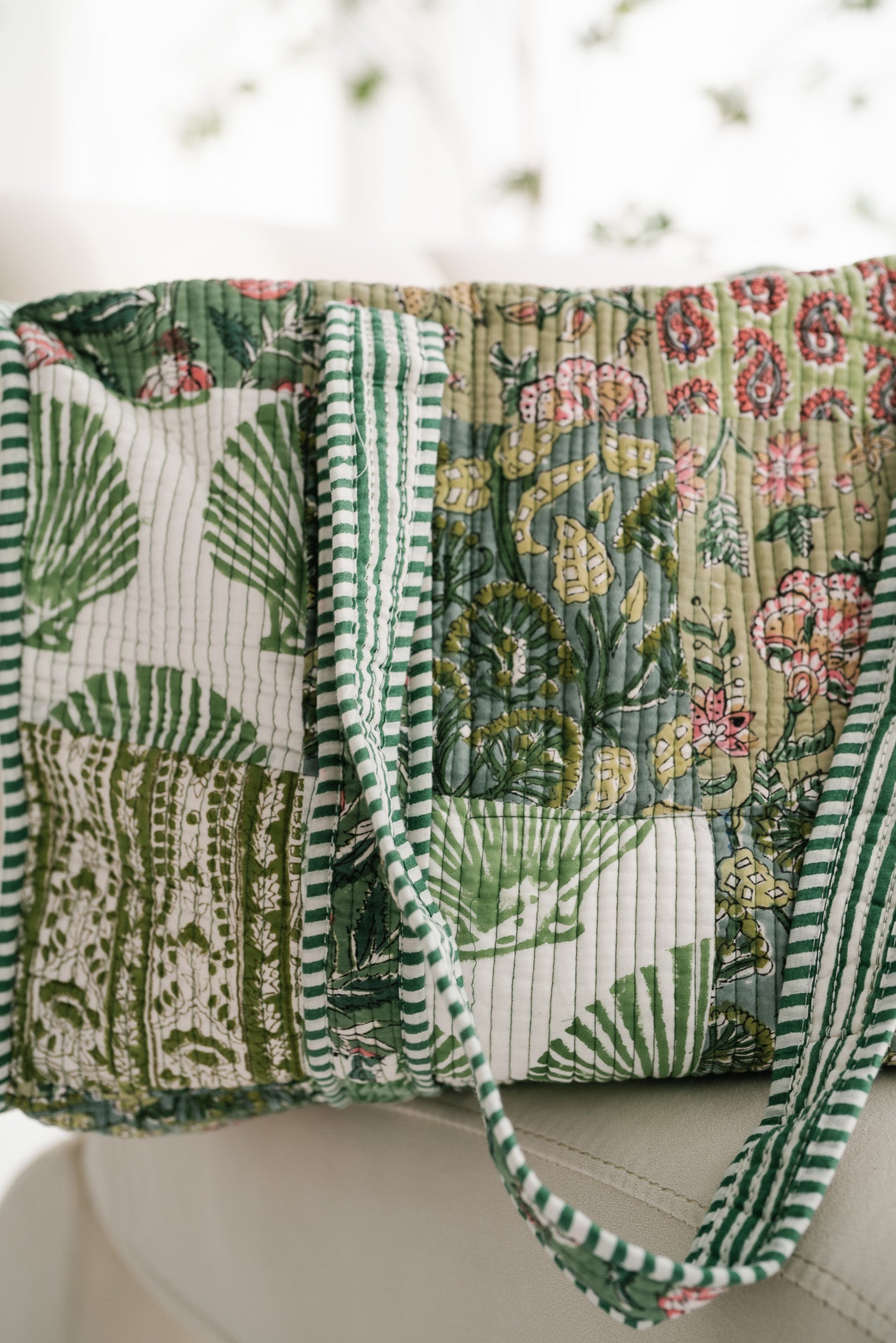 • Embrace effortless style with our exquisite Patchwork Duffle Bag. Handcrafted with care, this unique accessory features a captivating floral and botanical patterns, arranged in a charming patchwork design. Each stitch tells a story of artisanal craftsmanship, making this tote a truly one-of-a-kind statement piece that celebrates bohemian charm and timeless elegance. Designed for both beauty and practicality, this spacious duffle bag is your perfect companion for everyday adventures. Whether you're heading to the market, a casual brunch, or a weekend getaway, its generous interior comfortably holds all your essentials. The comfortable shoulder straps ensure easy carrying, while the soft, quilted cotton fabric provides a lightweight yet durable structure. Add a touch of handcrafted artistry to your ensemble. This versatile duffle seamlessly blends functionality with a distinct aesthetic, making it an ideal choice for those who appreciate unique fashion and a relaxed, free-spirited vibe. Elevate your accessory collection with this charming and versatile piece.