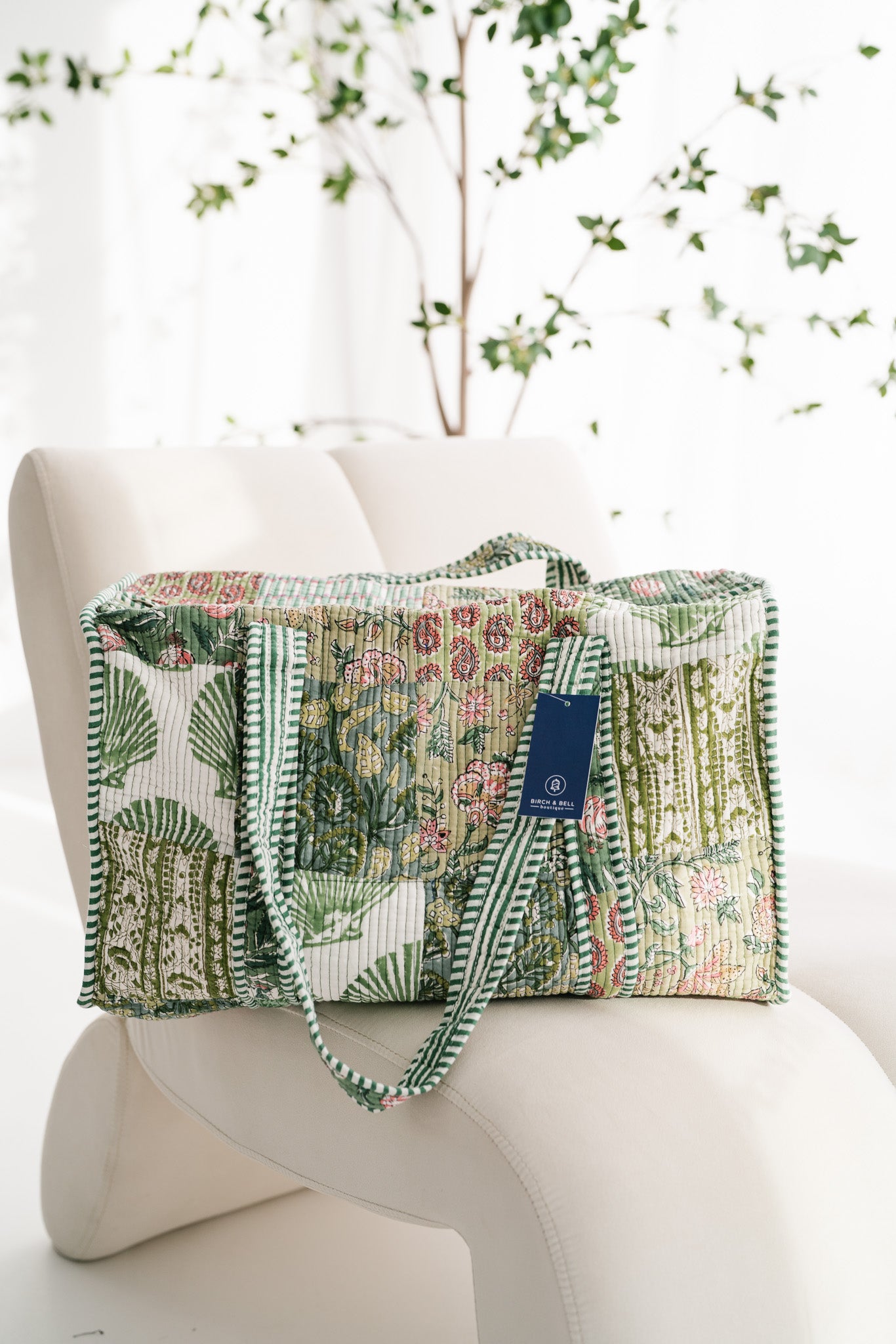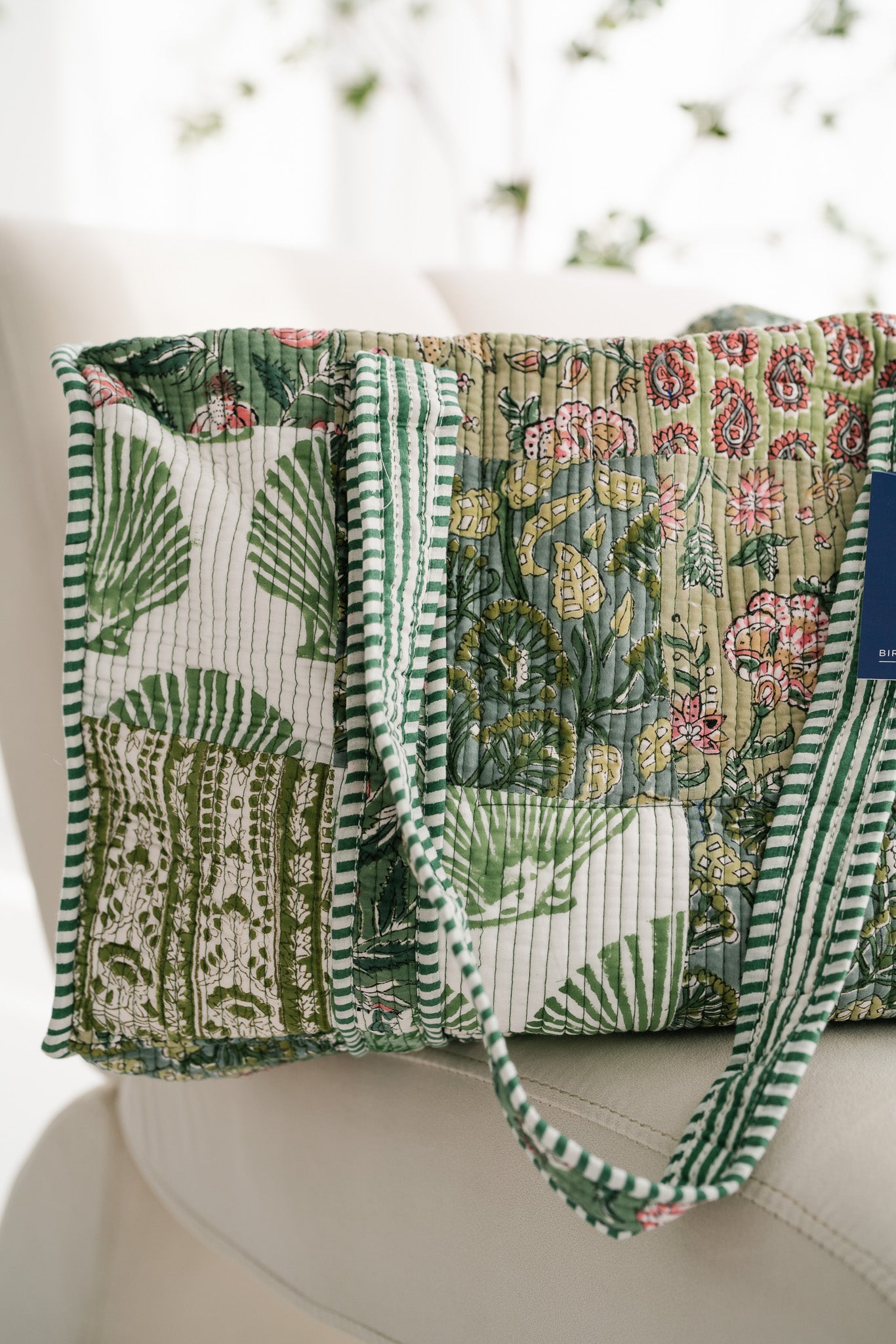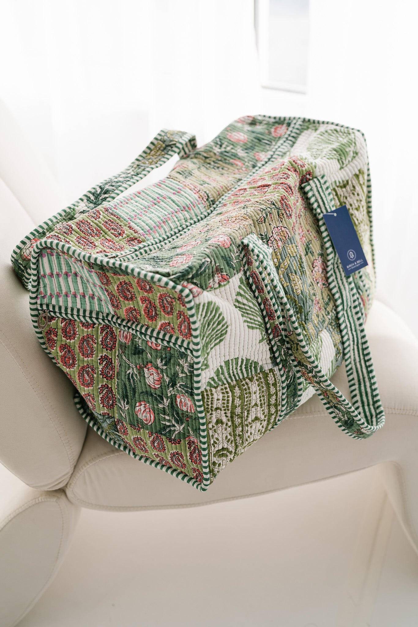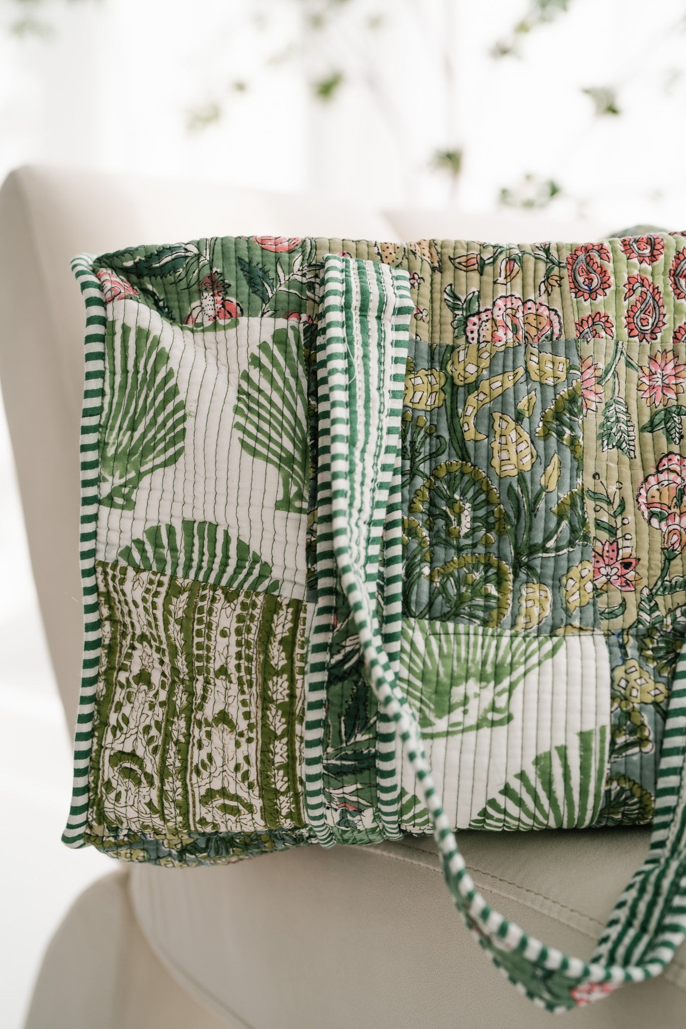 • Embrace effortless style with our exquisite Patchwork Duffle Bag. Handcrafted with care, this unique accessory features a captivating floral and botanical patterns, arranged in a charming patchwork design. Each stitch tells a story of artisanal craftsmanship, making this tote a truly one-of-a-kind statement piece that celebrates bohemian charm and timeless elegance. Designed for both beauty and practicality, this spacious duffle bag is your perfect companion for everyday adventures. Whether you're heading to the market, a casual brunch, or a weekend getaway, its generous interior comfortably holds all your essentials. The comfortable shoulder straps ensure easy carrying, while the soft, quilted cotton fabric provides a lightweight yet durable structure. Add a touch of handcrafted artistry to your ensemble. This versatile duffle seamlessly blends functionality with a distinct aesthetic, making it an ideal choice for those who appreciate unique fashion and a relaxed, free-spirited vibe. Elevate your accessory collection with this charming and versatile piece.