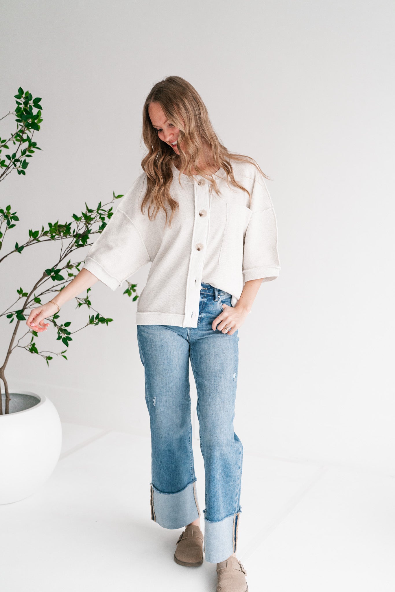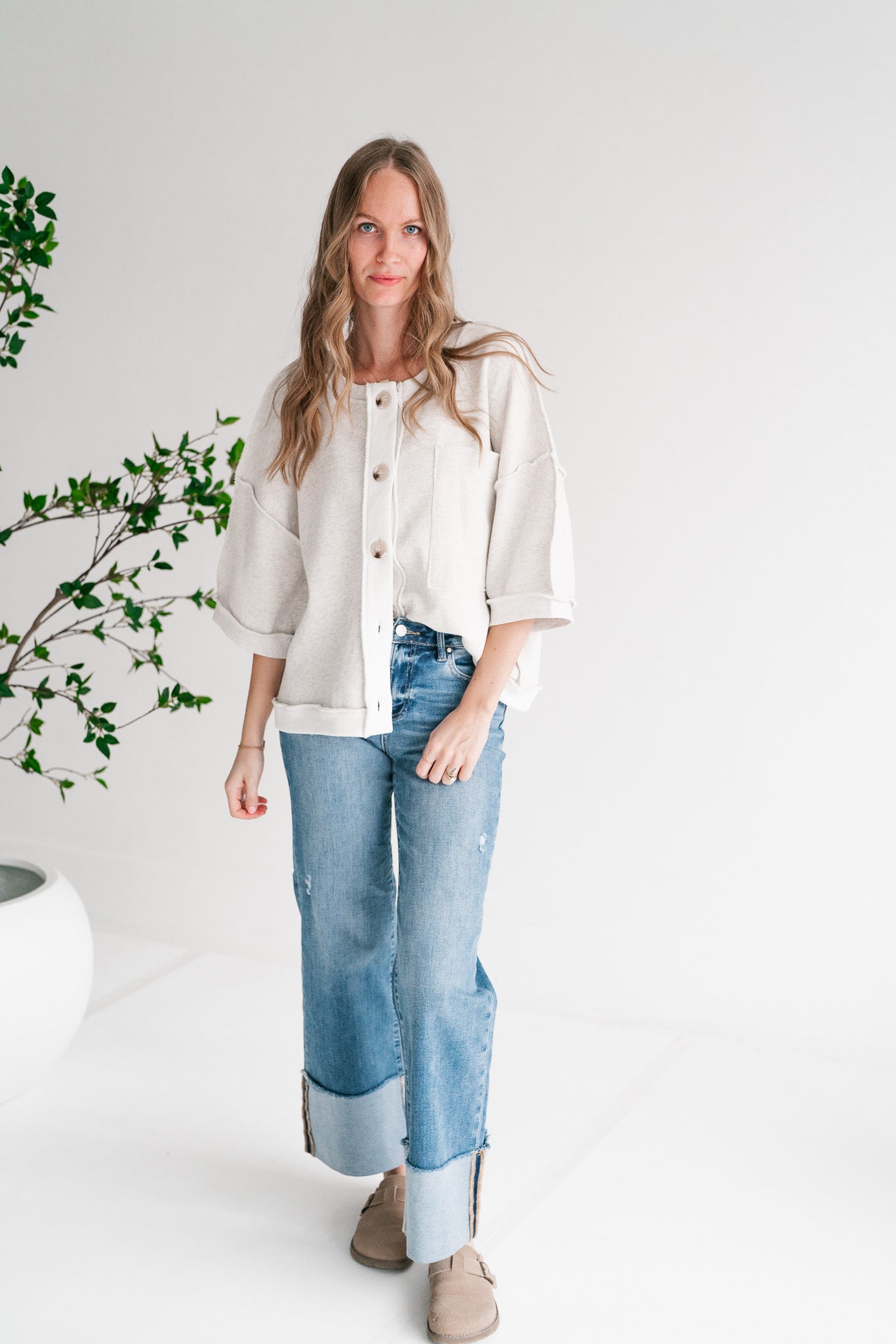 Embrace effortless style and unparalleled comfort with our Raw Edge Button-Front Cardigan. Crafted from a soft, textured fabric resembling a waffle knit, this top offers a wonderfully cozy feel perfect for any season. Its relaxed, oversized silhouette and wide sleeves ensure a comfortable fit that drapes beautifully, making it an essential addition to your casual wardrobe.This cardigan stands out with its distinctive raw edge detailing along the seams and hem, adding a touch of contemporary chic to its laid-back design. The functional button-front closure allows for versatile styling – wear it open as a light layer or buttoned up as a stylish top. A charming single patch pocket on the front completes the look, providing a subtle utility detail.Whether you're lounging at home, running errands, or meeting friends for a casual outing, this versatile piece transitions seamlessly. Pair it with your favorite jeans, leggings, or even over a simple dress for an instantly elevated yet comfortable ensemble. Experience the perfect blend of fashion-forward design and ultimate coziness.