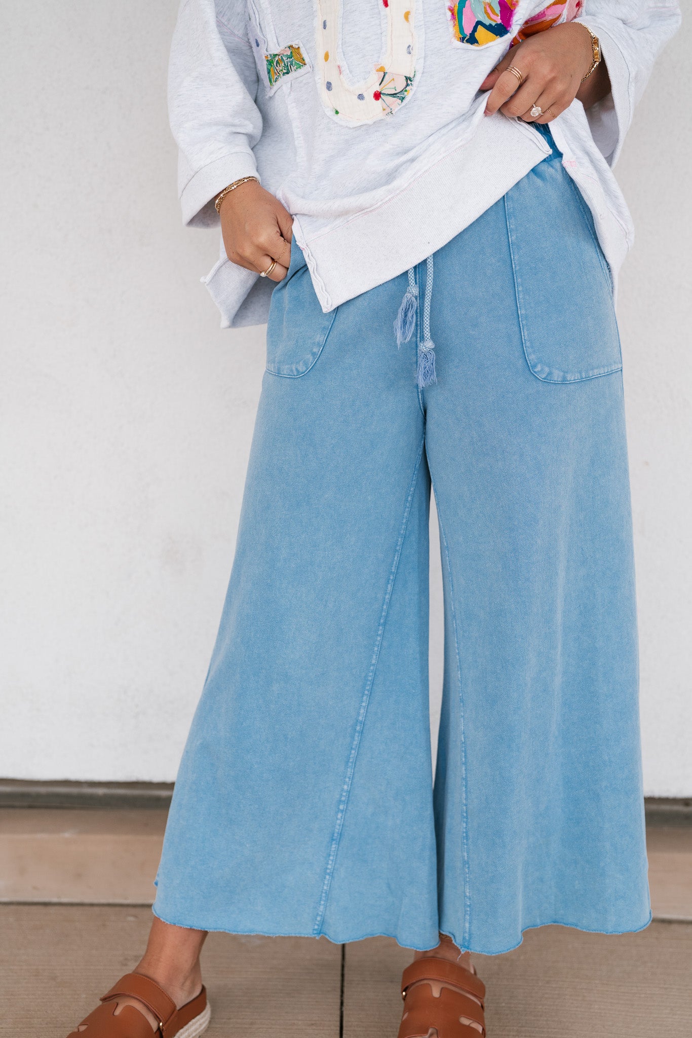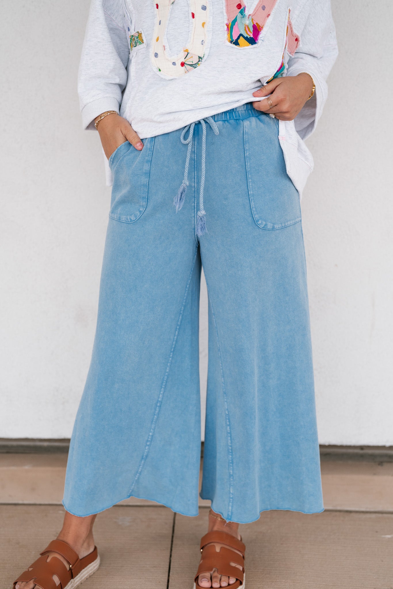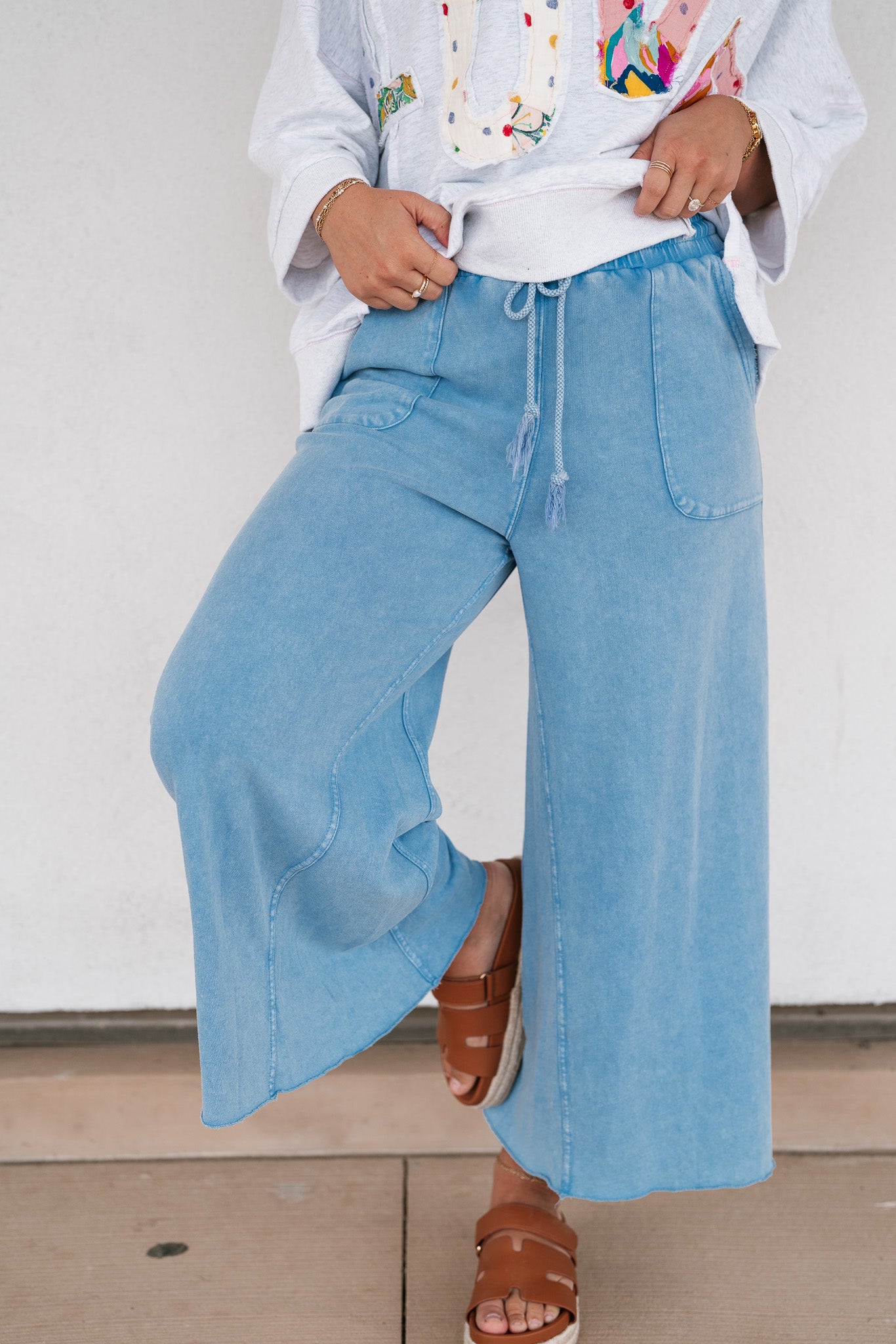Elevate your casual wardrobe with our Can't Be Matched Mineral Wash Wide Leg Pants - Blue. Designed for effortless style and all-day comfort, these standout pants feature a vintage-inspired mineral wash finish that gives each pair a unique look. The flattering high-rise fit elongates your silhouette, while the wide leg cut offers breezy movement and a modern edge. Crafted from soft, breathable fabric, these versatile pants transition seamlessly from day to night. Pair them with a tucked-in tee, cropped sweater, or flowy blouse for endless styling possibilities. Whether you're lounging at home, running errands, or heading out for a weekend brunch, these pants will quickly become your go-to essential.