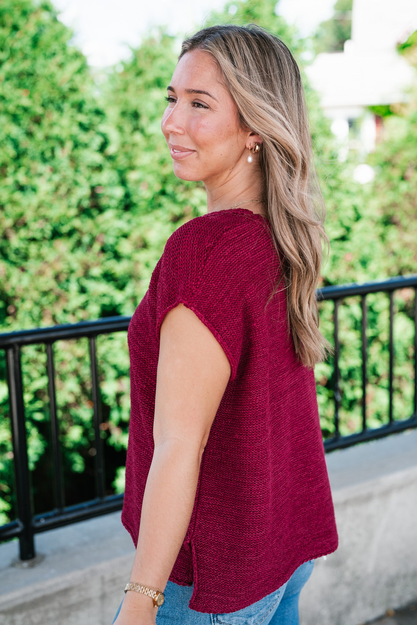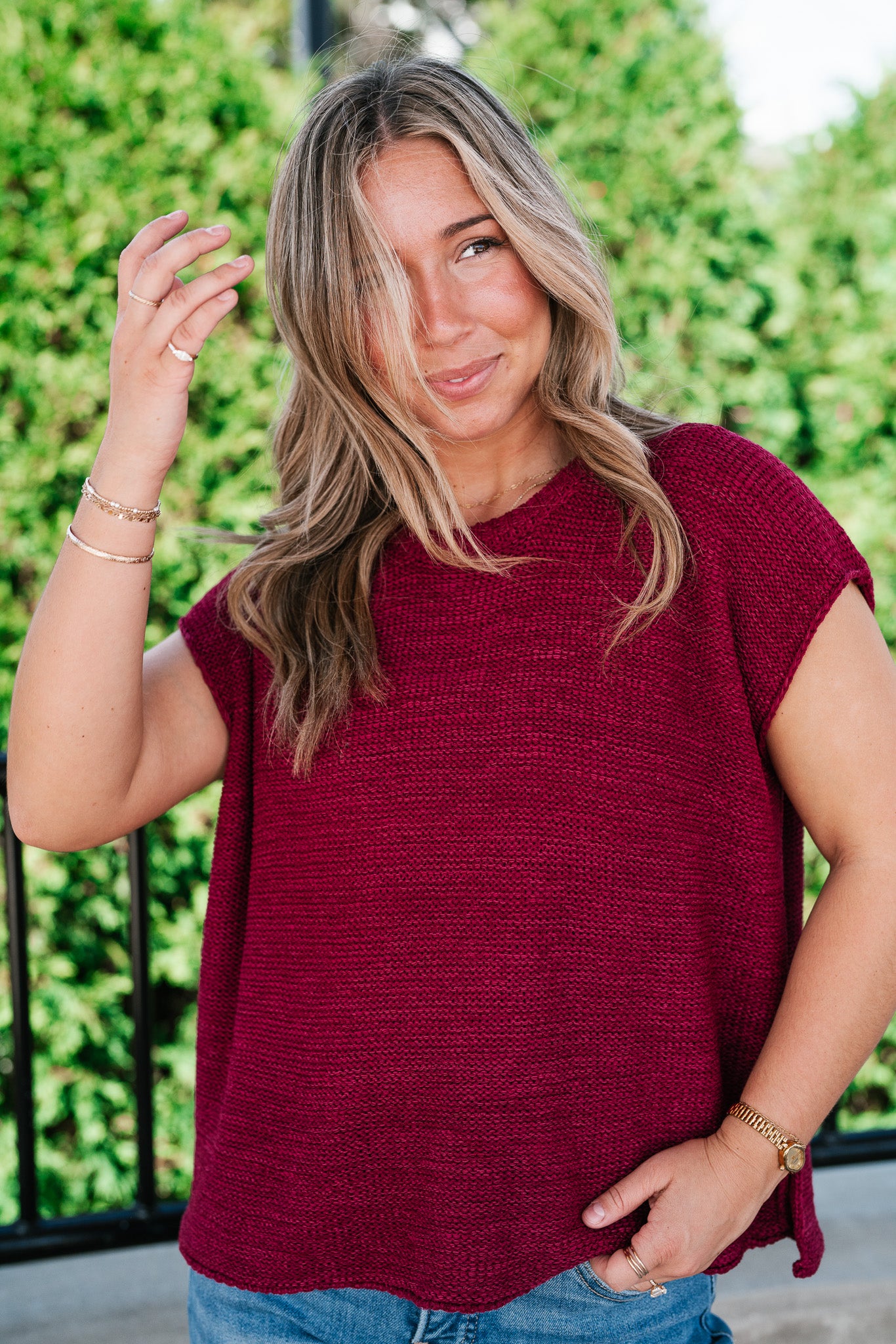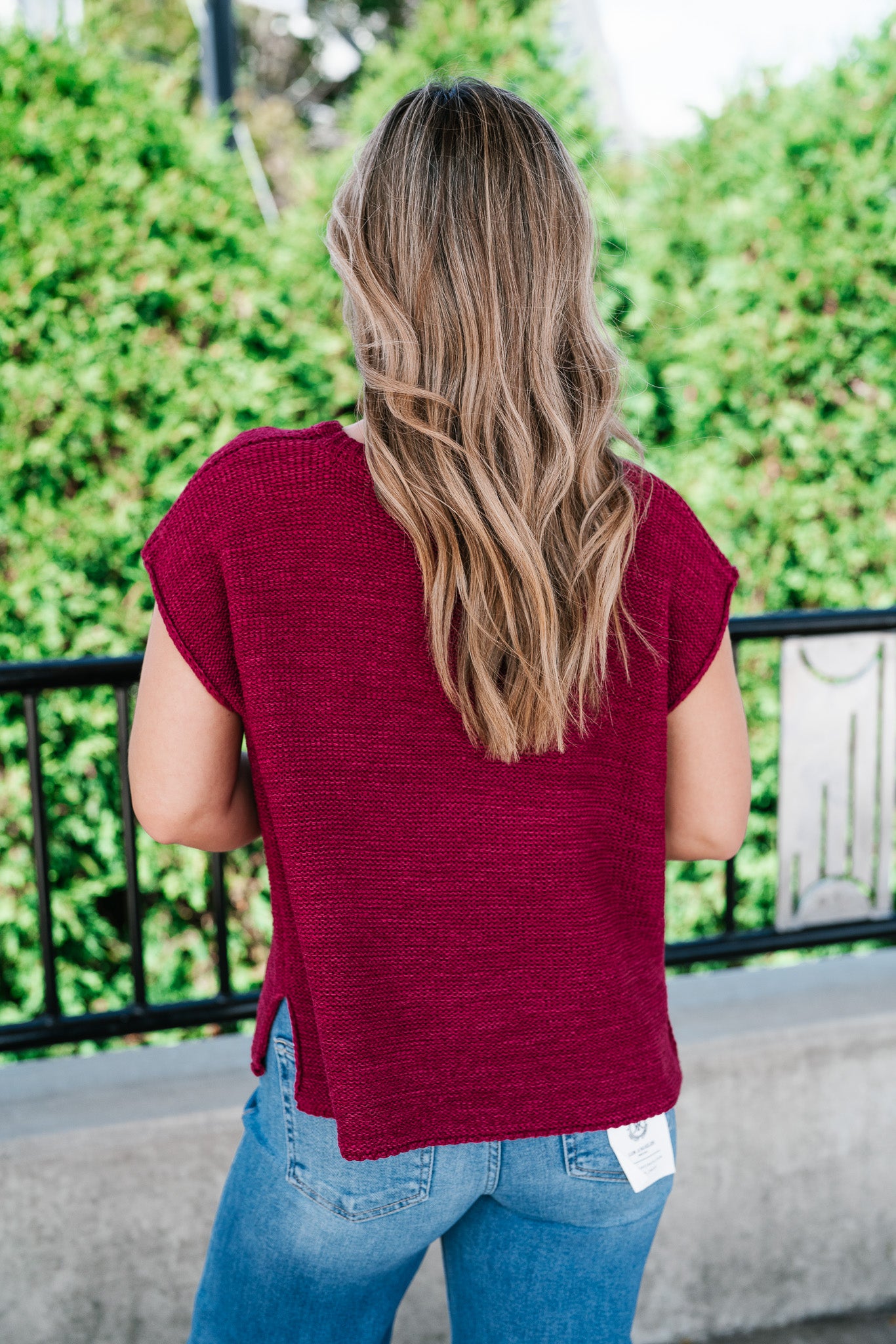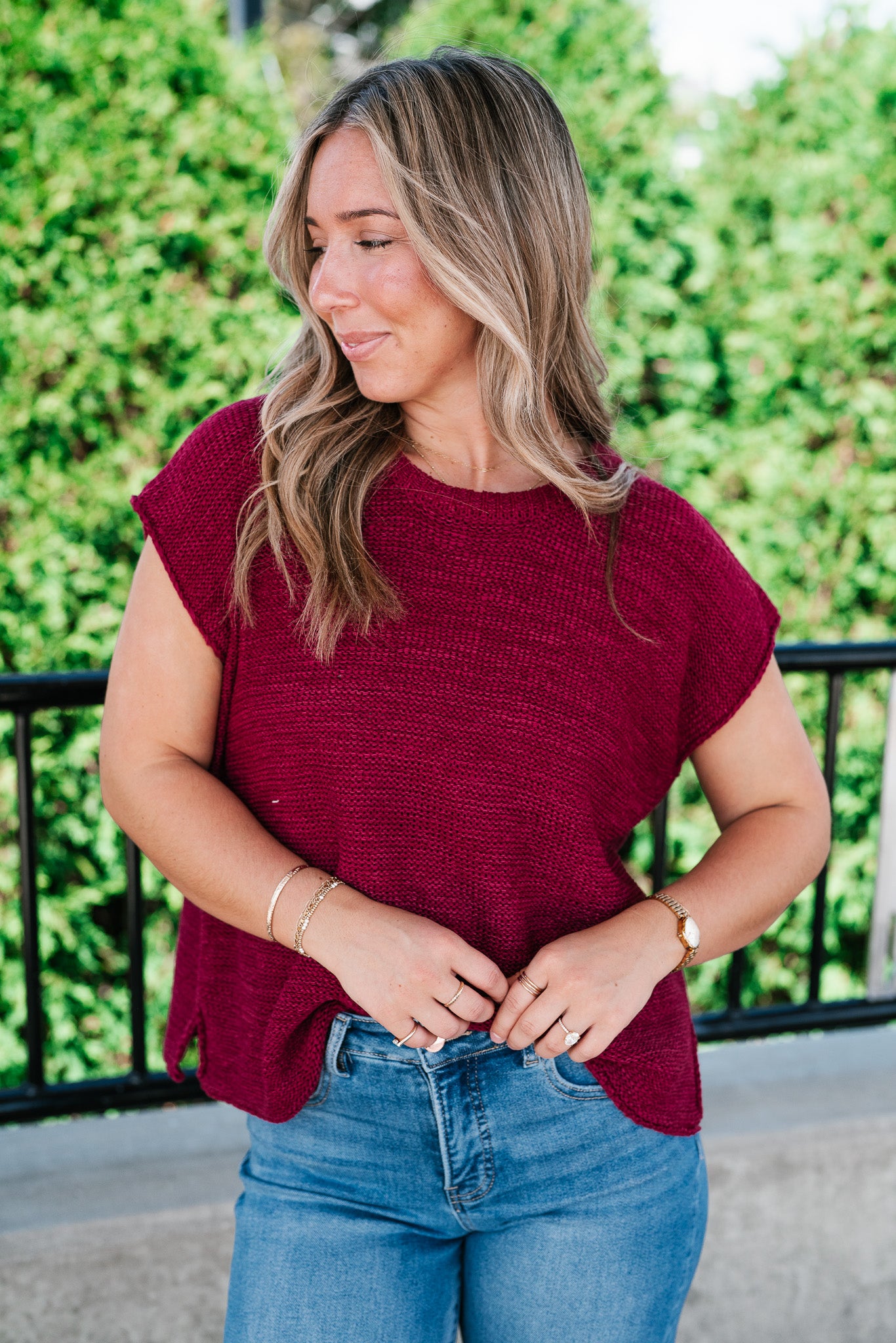Crafted in a rich wine hue, this sleeveless sweater tank features a lightweight knit and a flowy, relaxed silhouette. The crew neckline and side slits give it an easy, modern feel—perfect for wearing on its own during warmer days or layered under a cardigan or jacket as the seasons change. Whether you’re headed to brunch, work, or a casual night out, this versatile piece brings comfort and polish to every look.