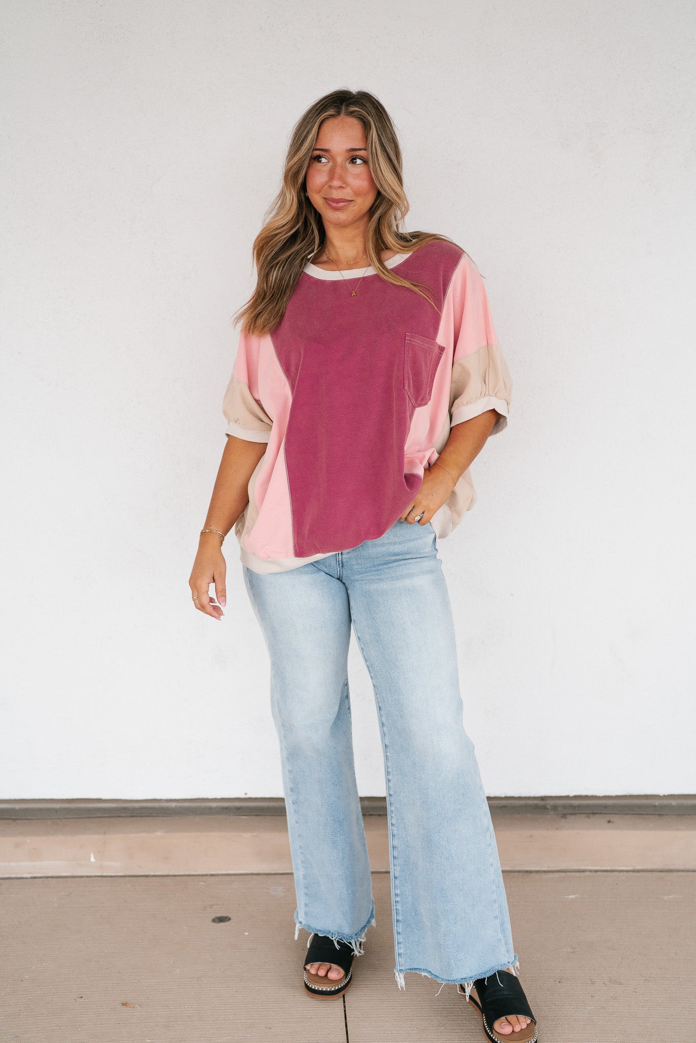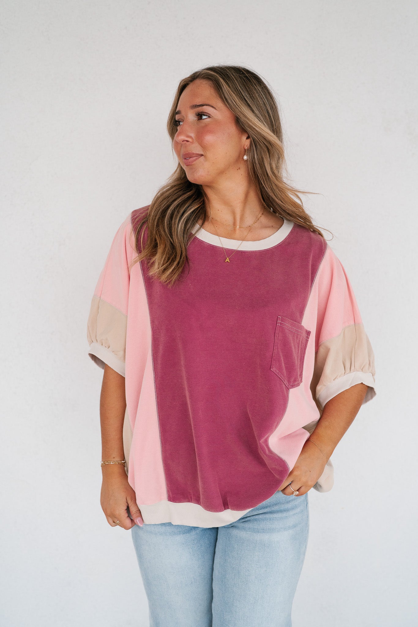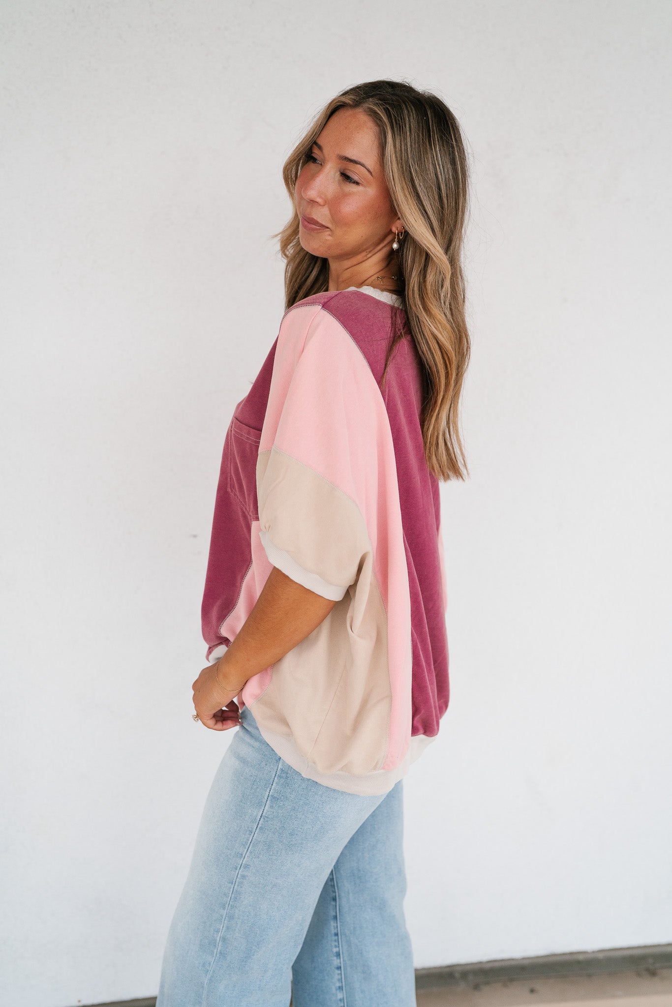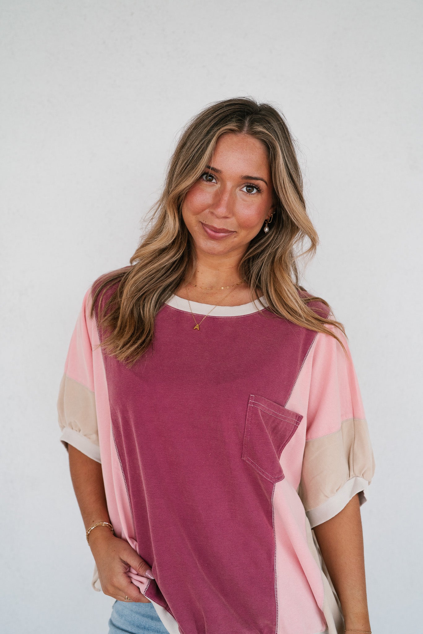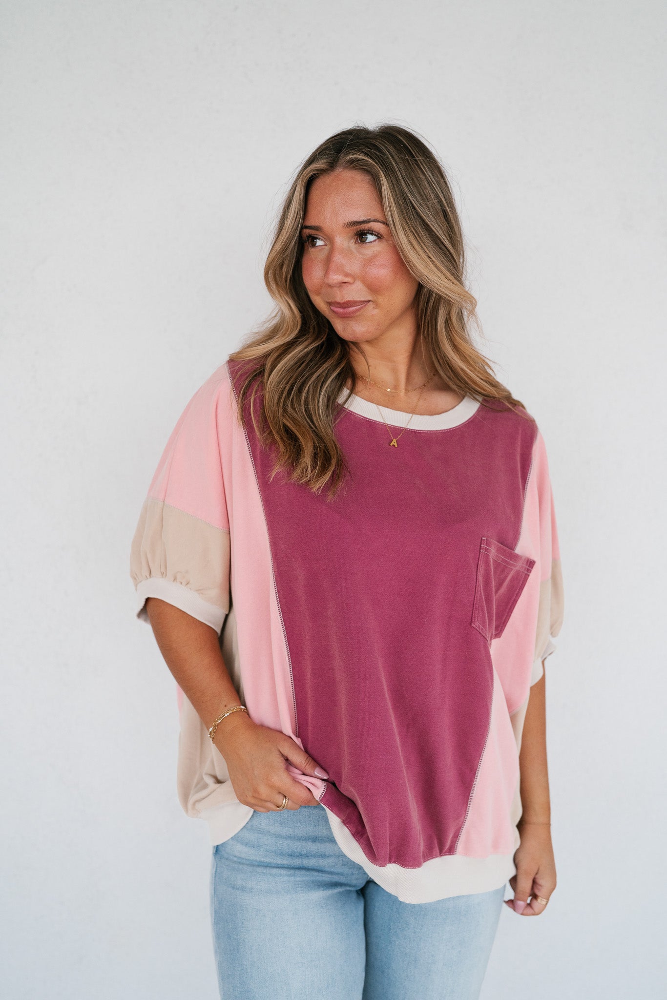 Add a modern twist to your casual wardrobe with our Georgia Color Block Top in Berry. Featuring a relaxed fit, soft brushed fabric, and stylish neutral-toned color blocking, this top blends cozy comfort with everyday style. The dropped shoulders and subtle stitching details create an effortlessly laid-back look you’ll love for everything from coffee runs to weekend plans. Pair it with your favorite jeans, leggings, or shorts for a versatile outfit that always feels put together.