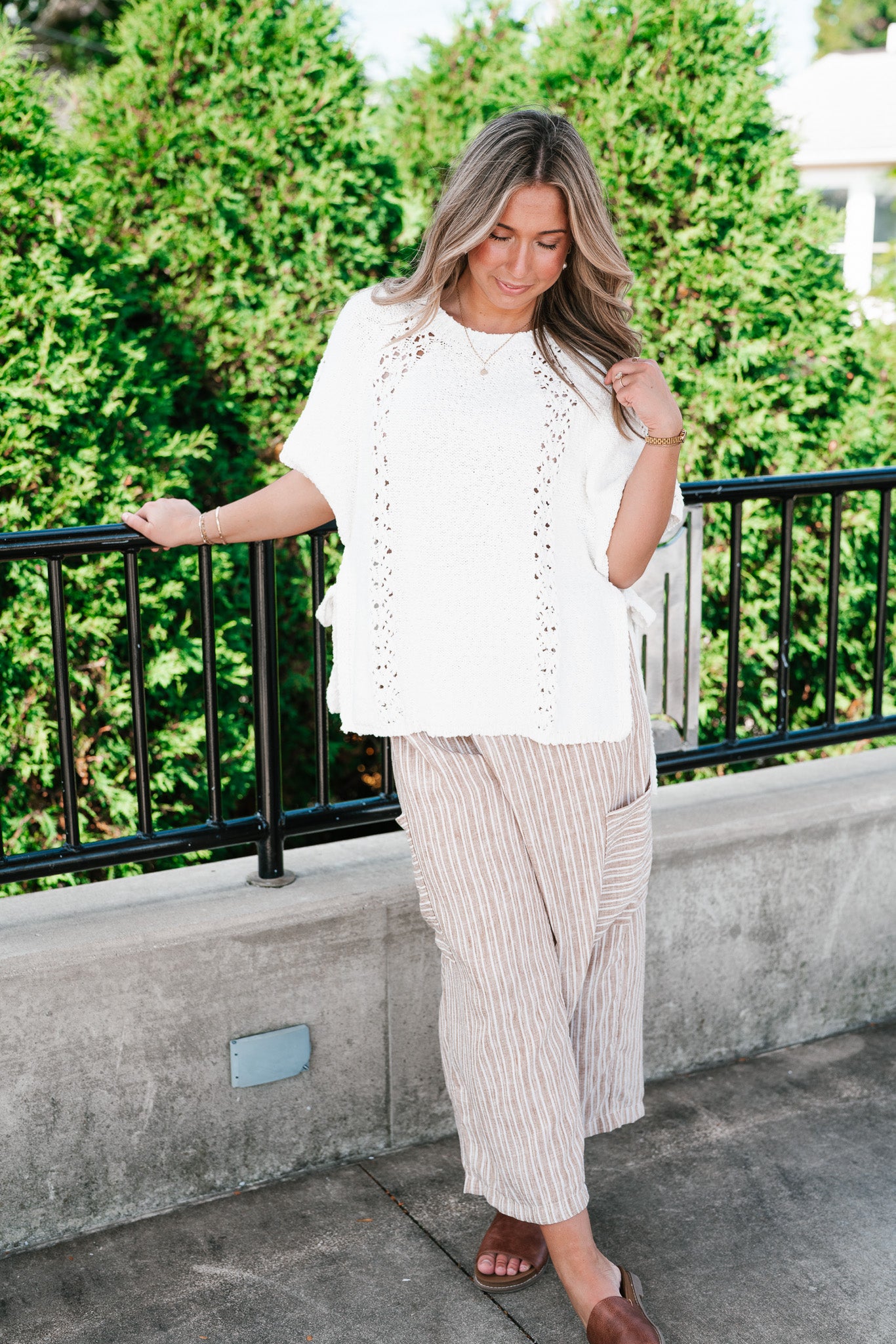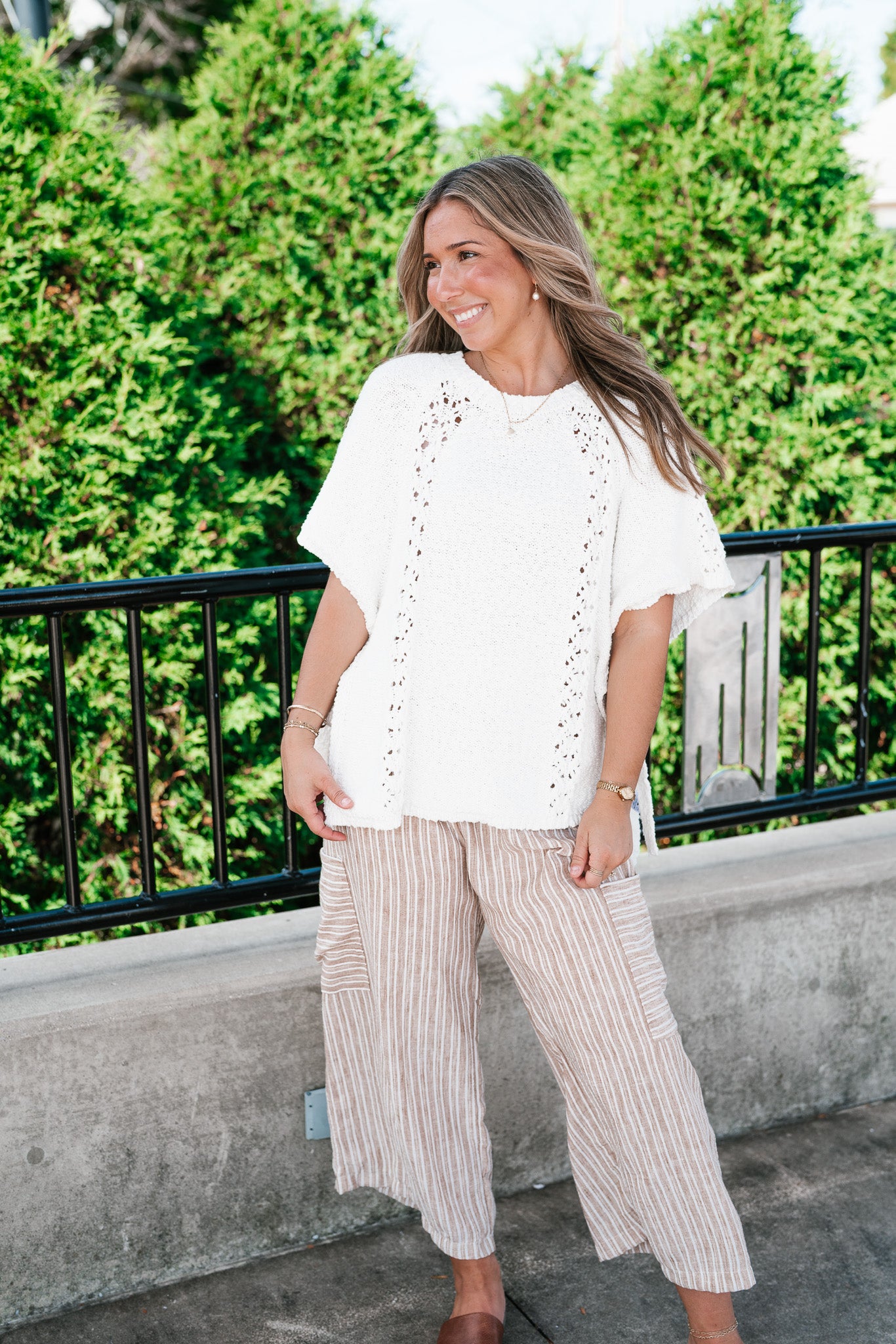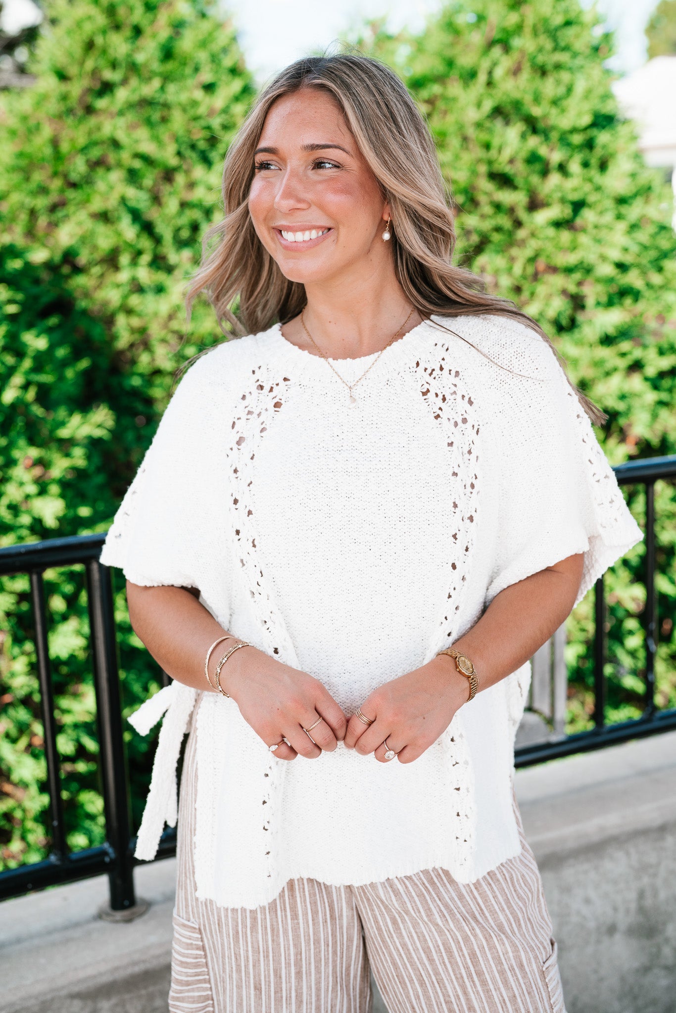 This textured sweater top is crafted with soft knit fabric and features delicate openwork detailing along the sleeves and sides for a light, airy finish. Functional side ties add an extra touch of charm, making this piece as versatile as it is stylish. In its crisp white hue, this knit pairs effortlessly with everything from denim to skirts, bringing a fresh, elevated feel to both casual and dressy looks. A relaxed silhouette and short sleeves make it perfect for year-round layering, ensuring it becomes a go-to favorite in your closet.