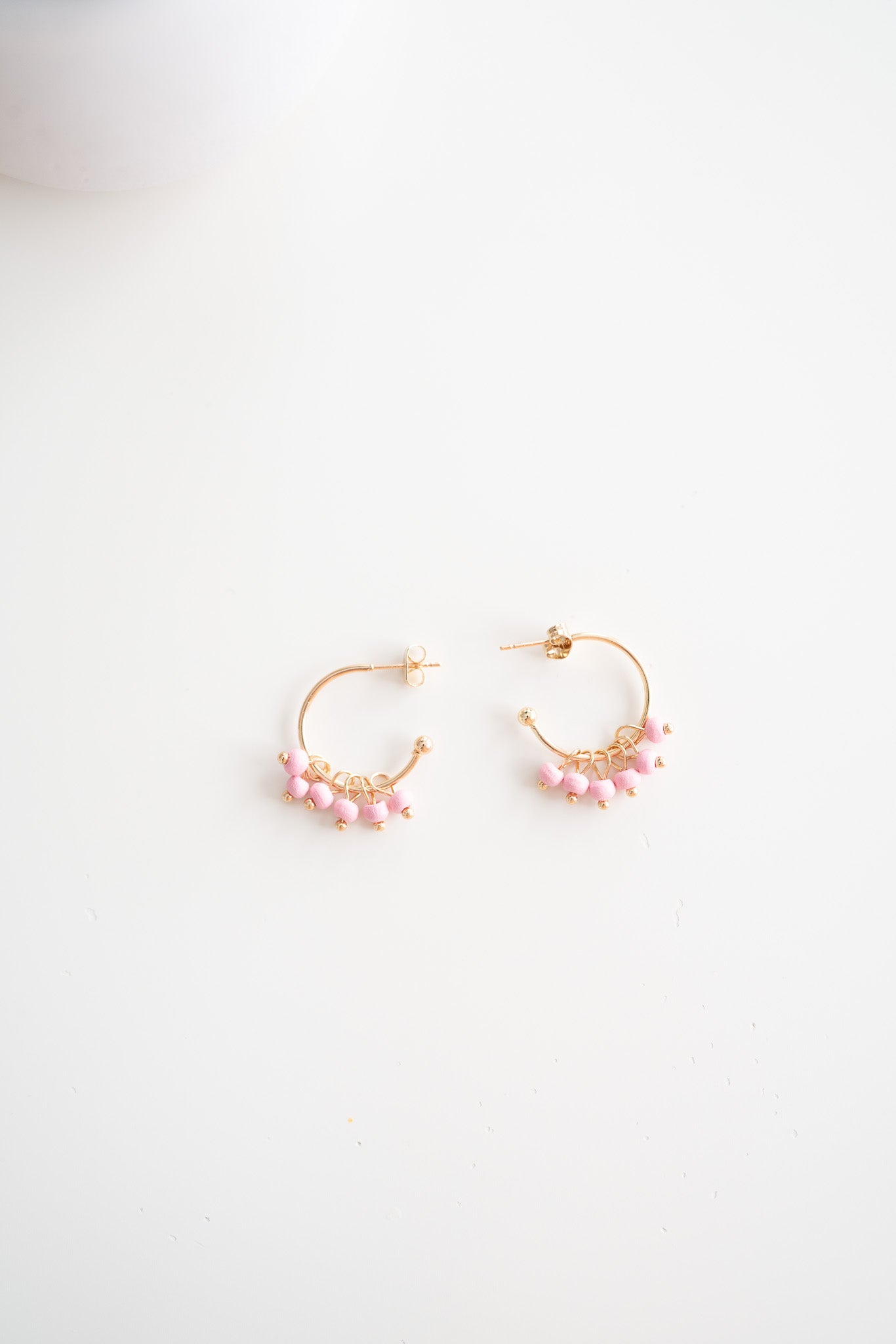 Gold Hoop earrings with pink dangle charm detail.
