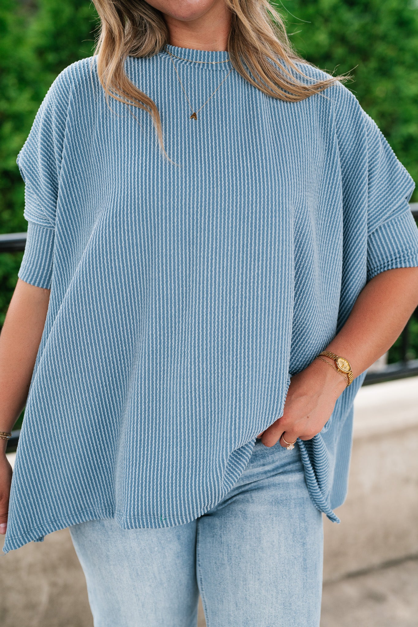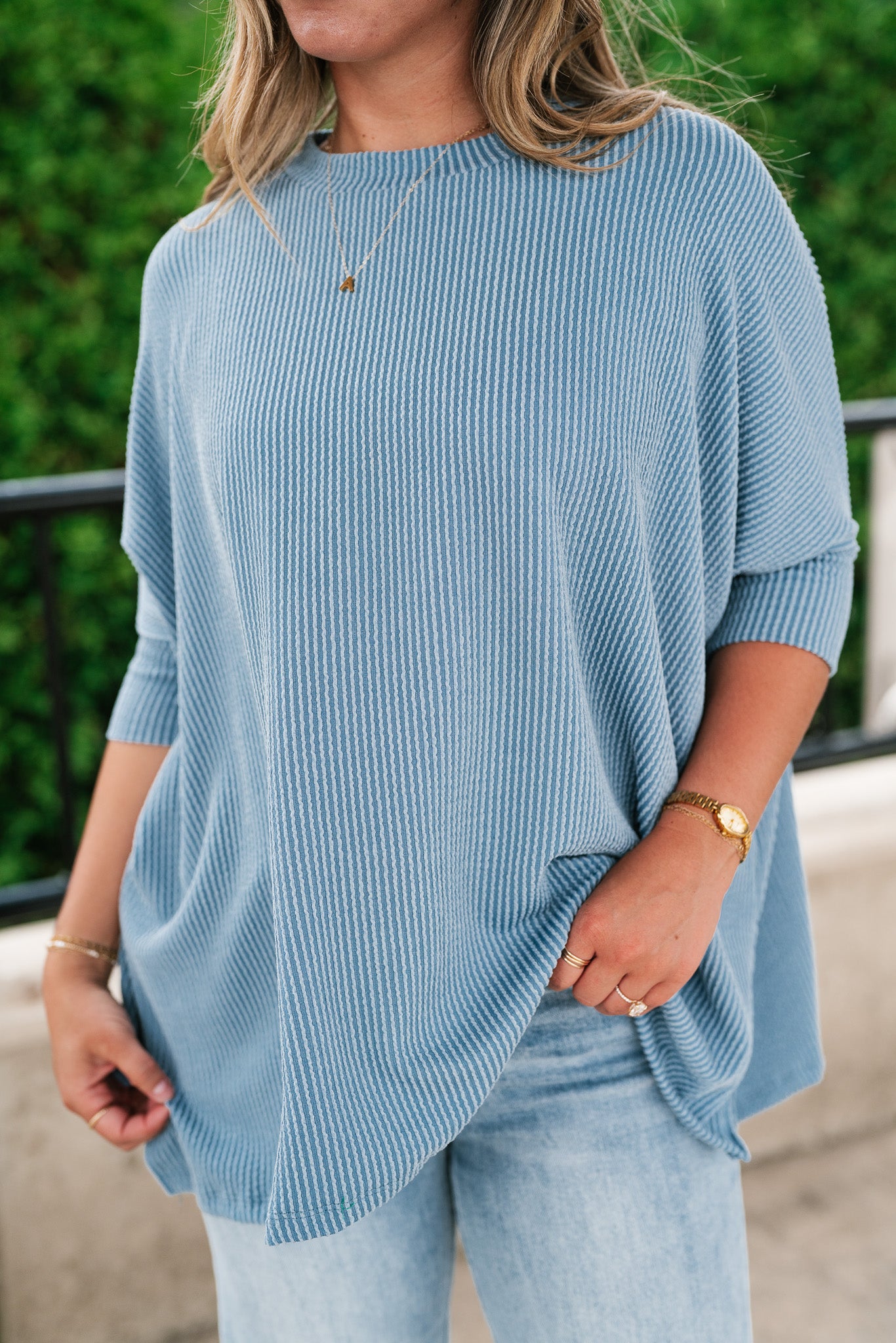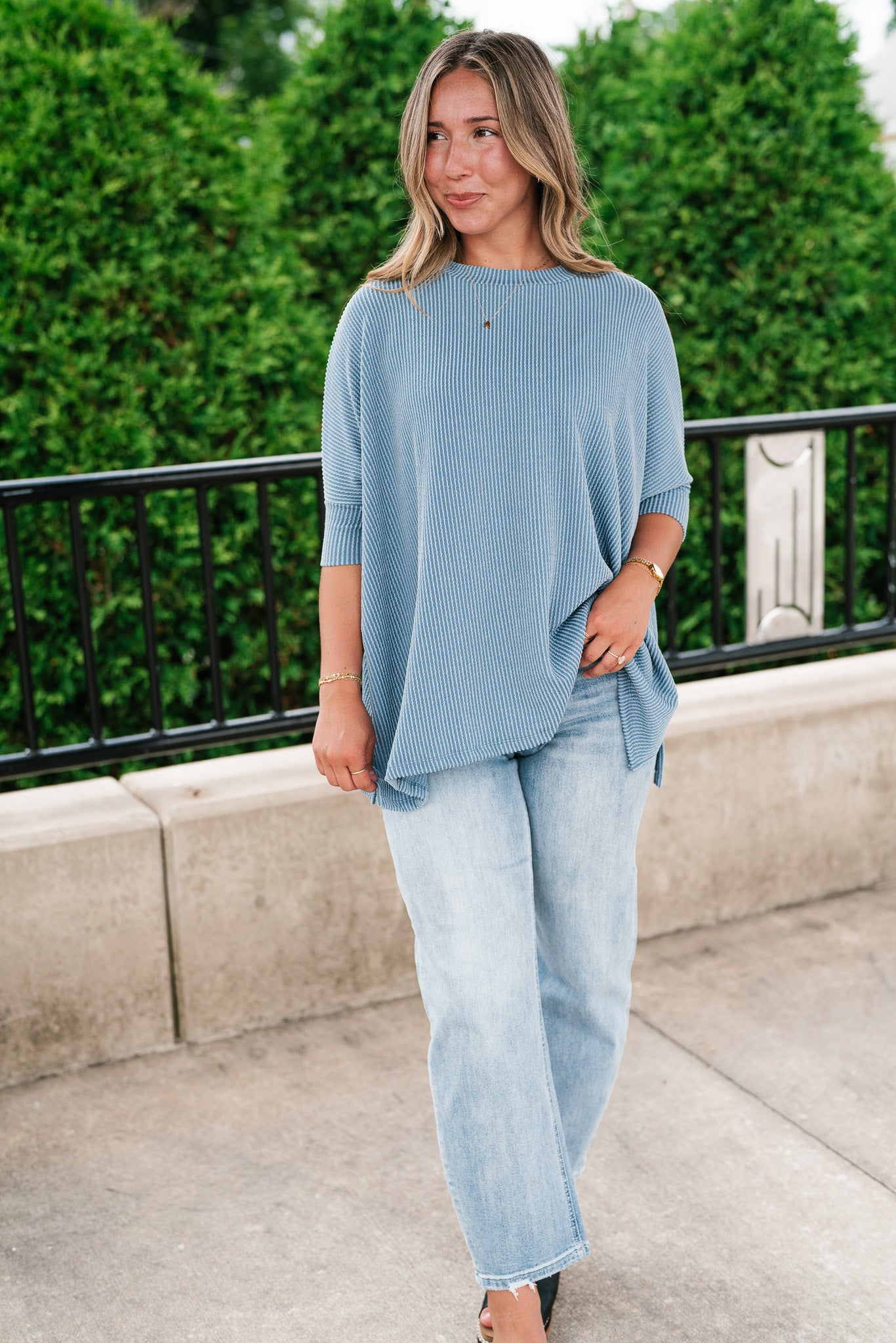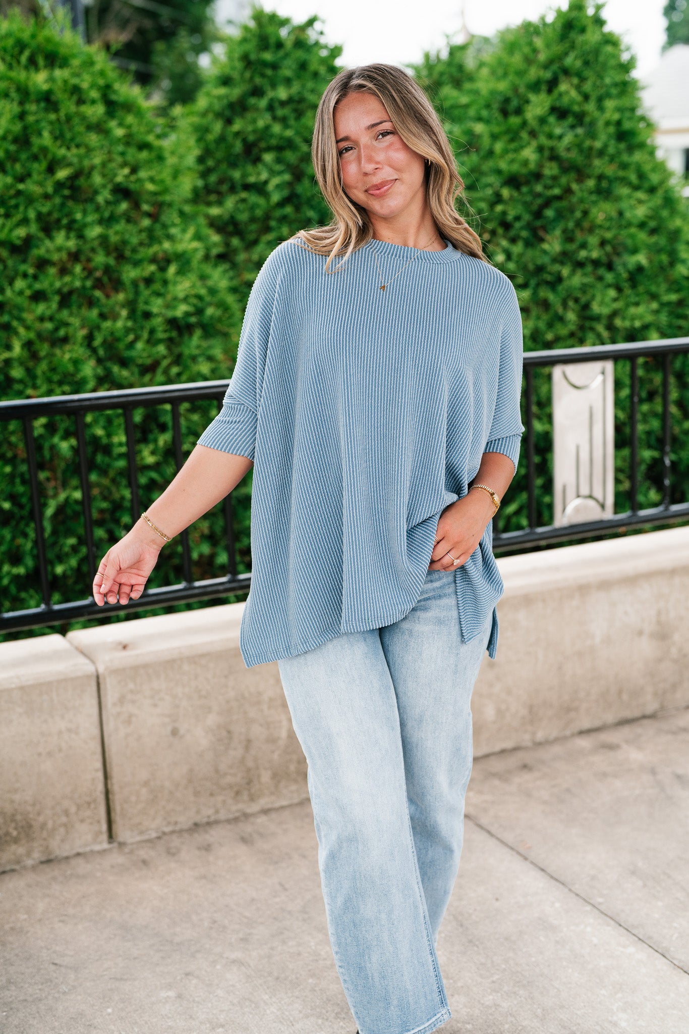 Effortlessly cozy and casually elevated, the Natalie Ribbed Oversized Tee brings that "easy like Sunday morning" vibe to your everyday wardrobe. With its oversized poncho silhouette, subtle drop sleeve, and soft ribbed texture, this dusty blue knit is perfect for layering over tanks, pairing with leggings, or styling with your favorite denim. A wide crew neckline and relaxed drape make this a go-to piece for transitional weather and laid-back days when comfort is key but style still matters. It’s that throw-on-and-go kind of essential your closet’s been waiting for.