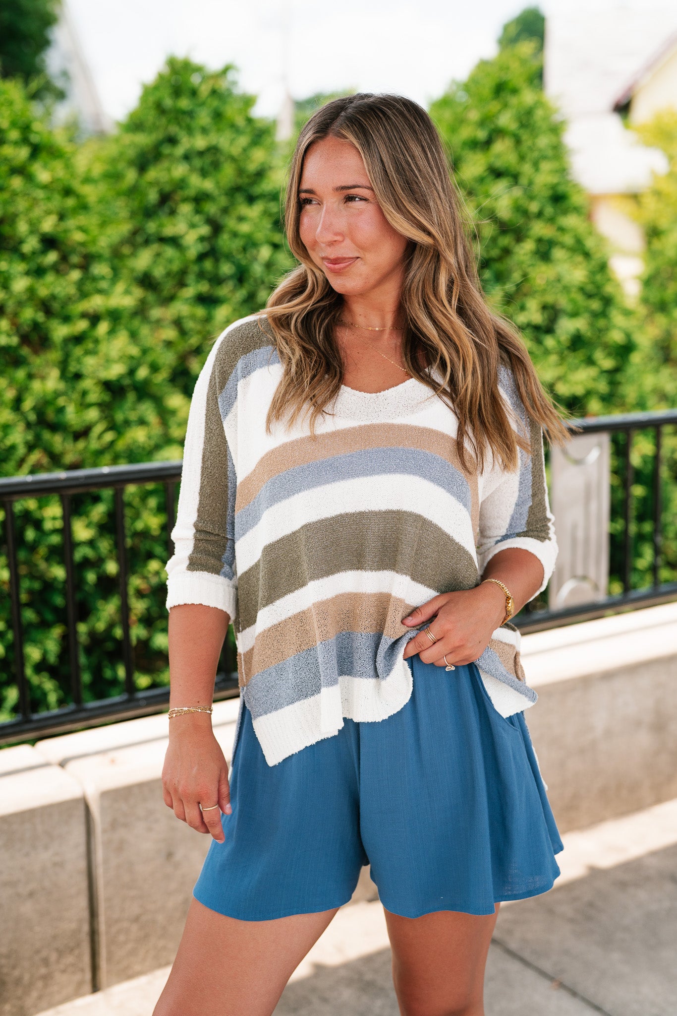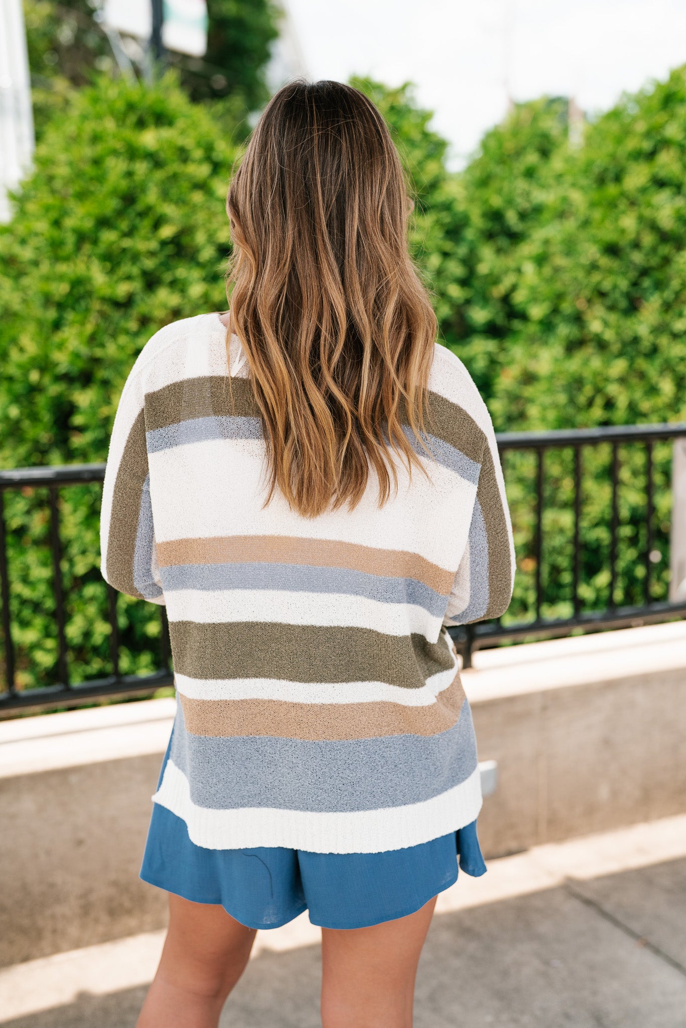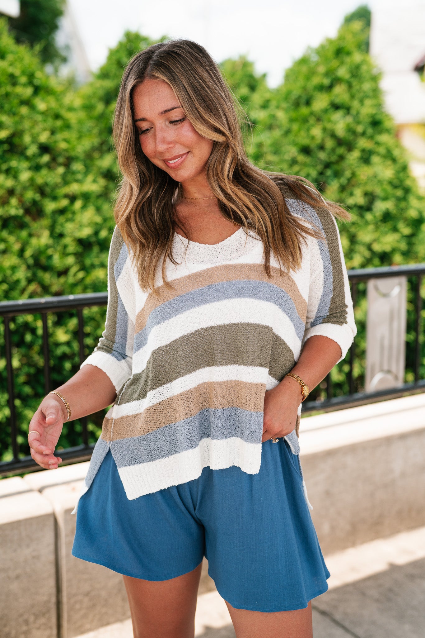 Cozy, colorful, and effortlessly relaxed—the Sailor Striped Knit Top brings an easygoing charm to your cold-weather wardrobe. Featuring a mix of muted stripes in earthy tones like olive, camel, ivory, and dusty blue, this sweater is designed with an oversized fit and flattering v-neckline. The drop shoulders and side slits create a flowy, flattering shape that pairs perfectly with denim, leggings, or layered over dresses for that comfy-chic look. Perfect for laid-back weekends, coffee runs, or curling up on cozy nights in.