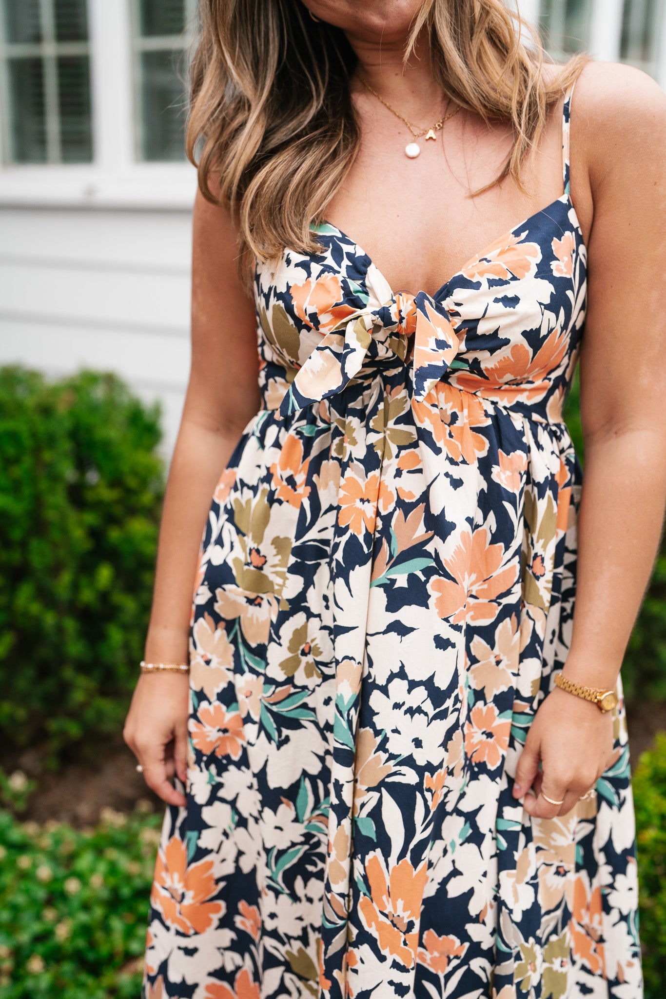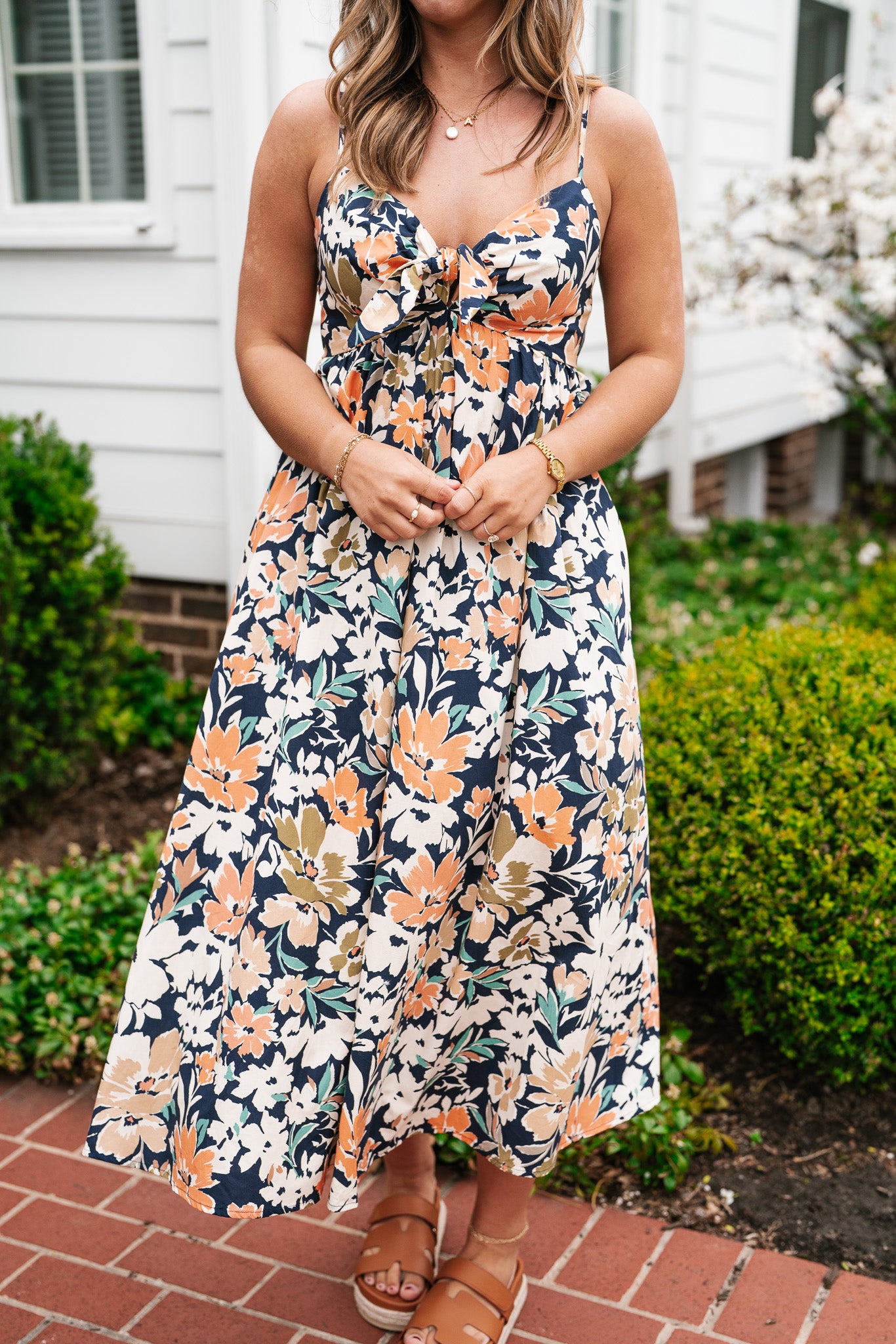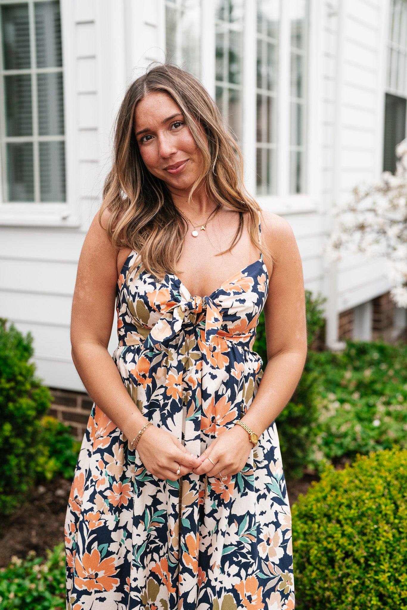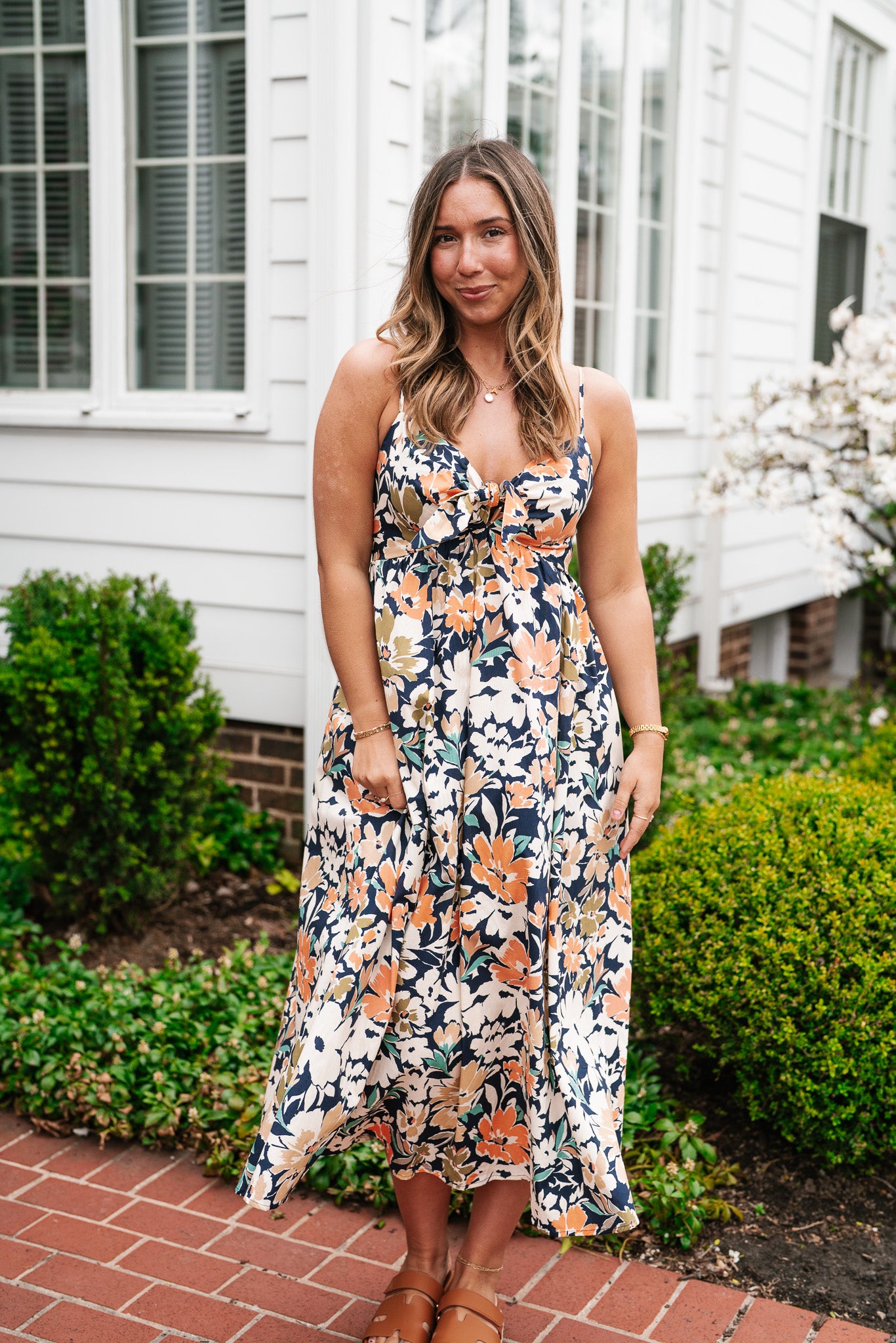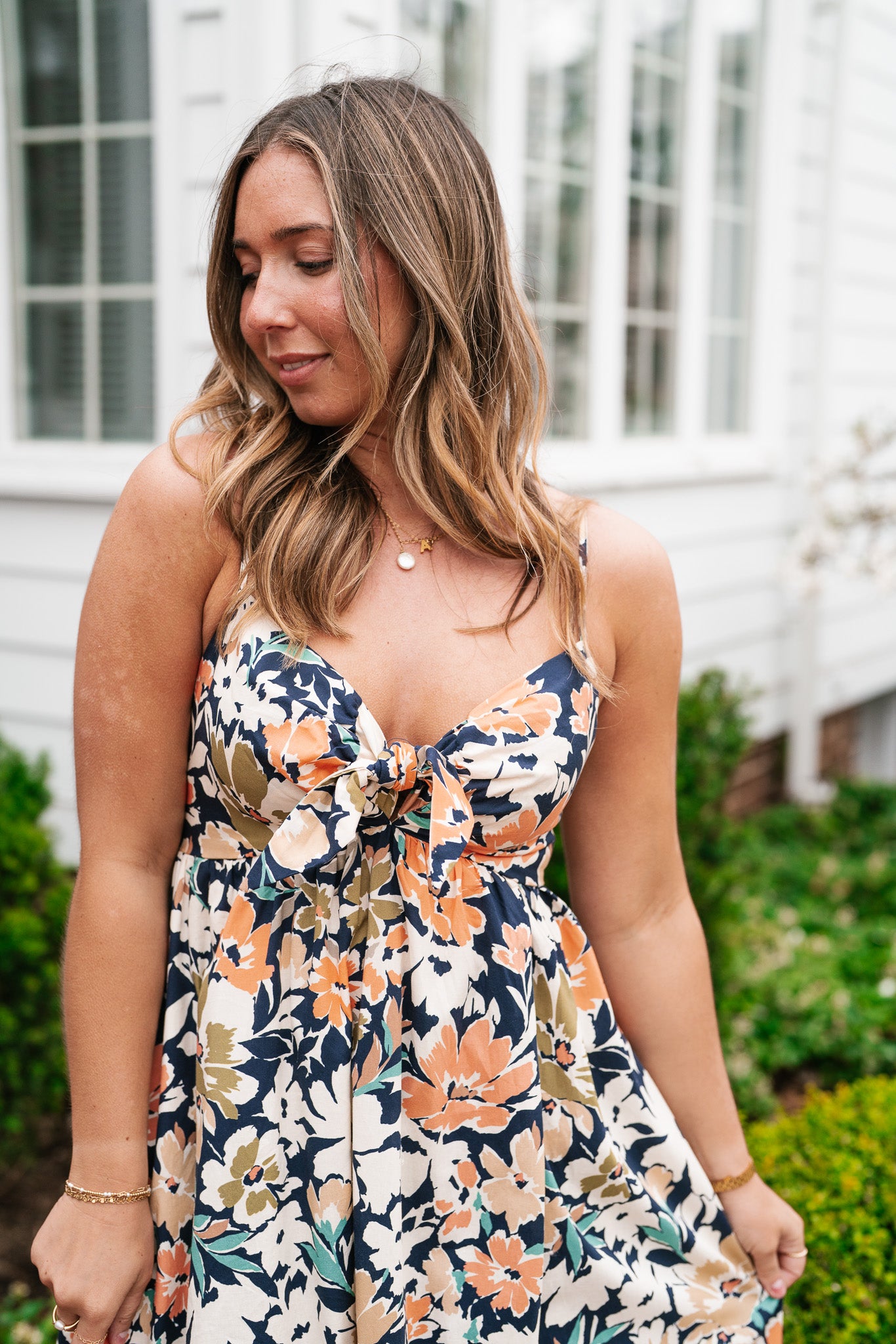 Bring effortless beauty to your wardrobe with the Siesta Sands Floral Tie Front Midi Dress — your go-to for warm-weather charm and timeless femininity. Featuring a delicate floral print in soft, sun-washed tones, this breezy midi dress is designed with a flattering tie-front bodice and a flowing skirt that moves beautifully with every step. The lightweight fabric keeps you cool and comfortable, while the midi length offers the perfect balance between casual and elegant. Whether you're headed to brunch, vacation, or a garden party, this dress captures the perfect blend of relaxed sophistication and romantic style.