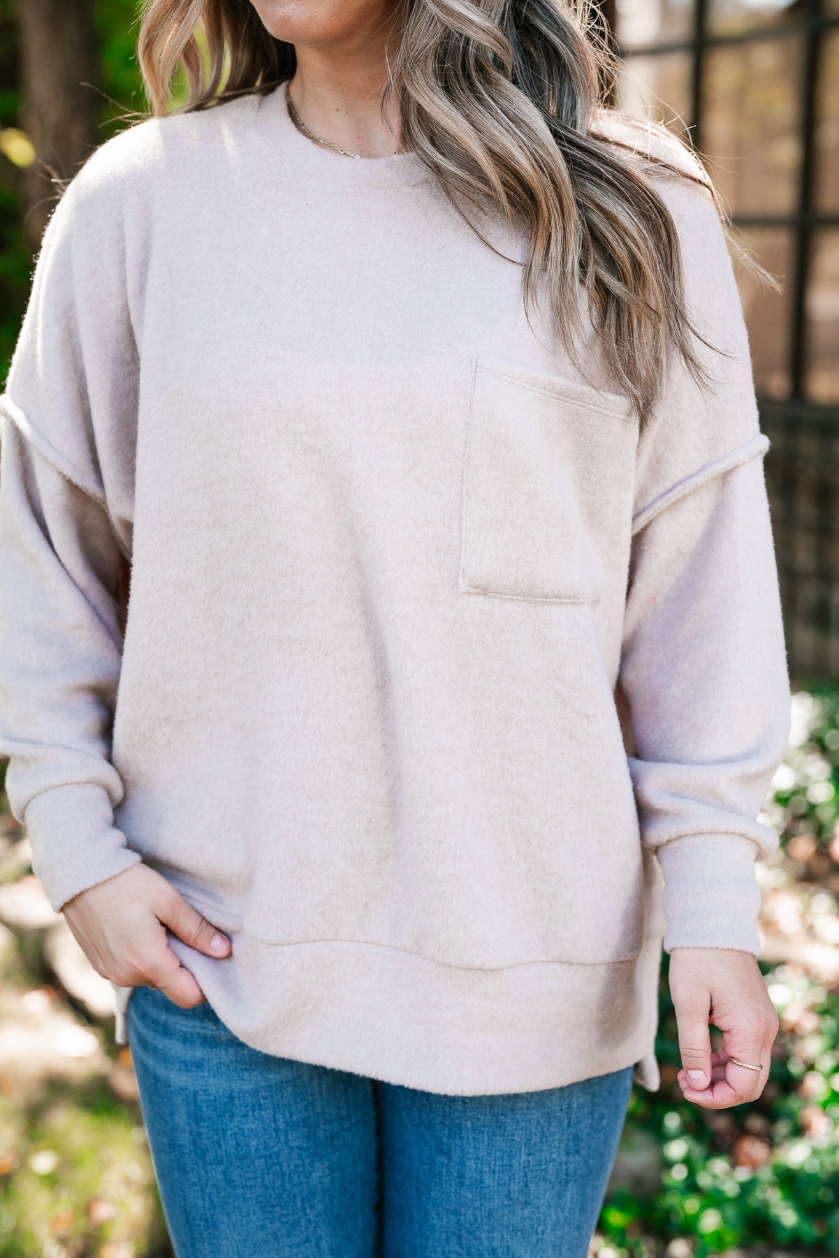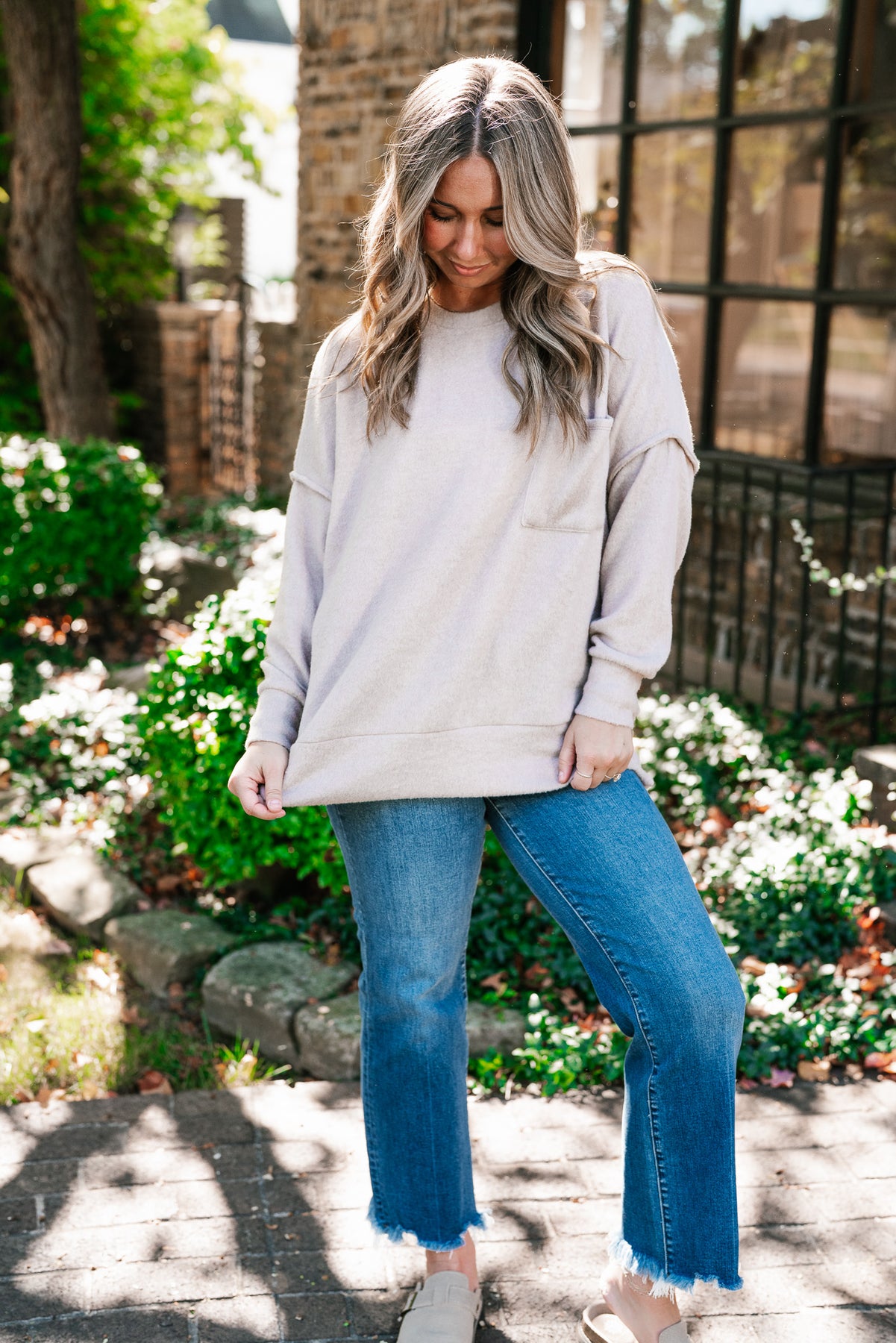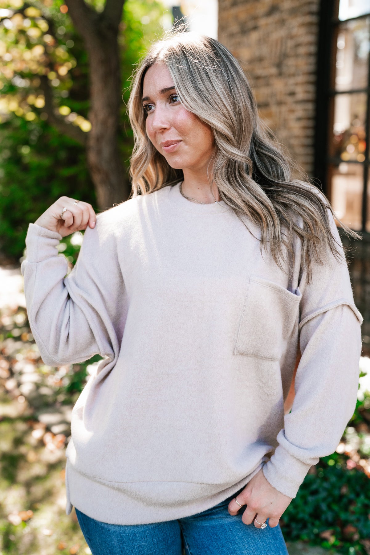 Designed in a soft neutral tone, this sweater features a slouchy oversized fit with drop shoulders, a classic crew neckline, and a front chest pocket that adds a touch of casual charm. The longer hemline makes it perfect for pairing with leggings or denim, giving you endless versatility whether you’re lounging at home, running errands, or heading out for a cozy weekend brunch.