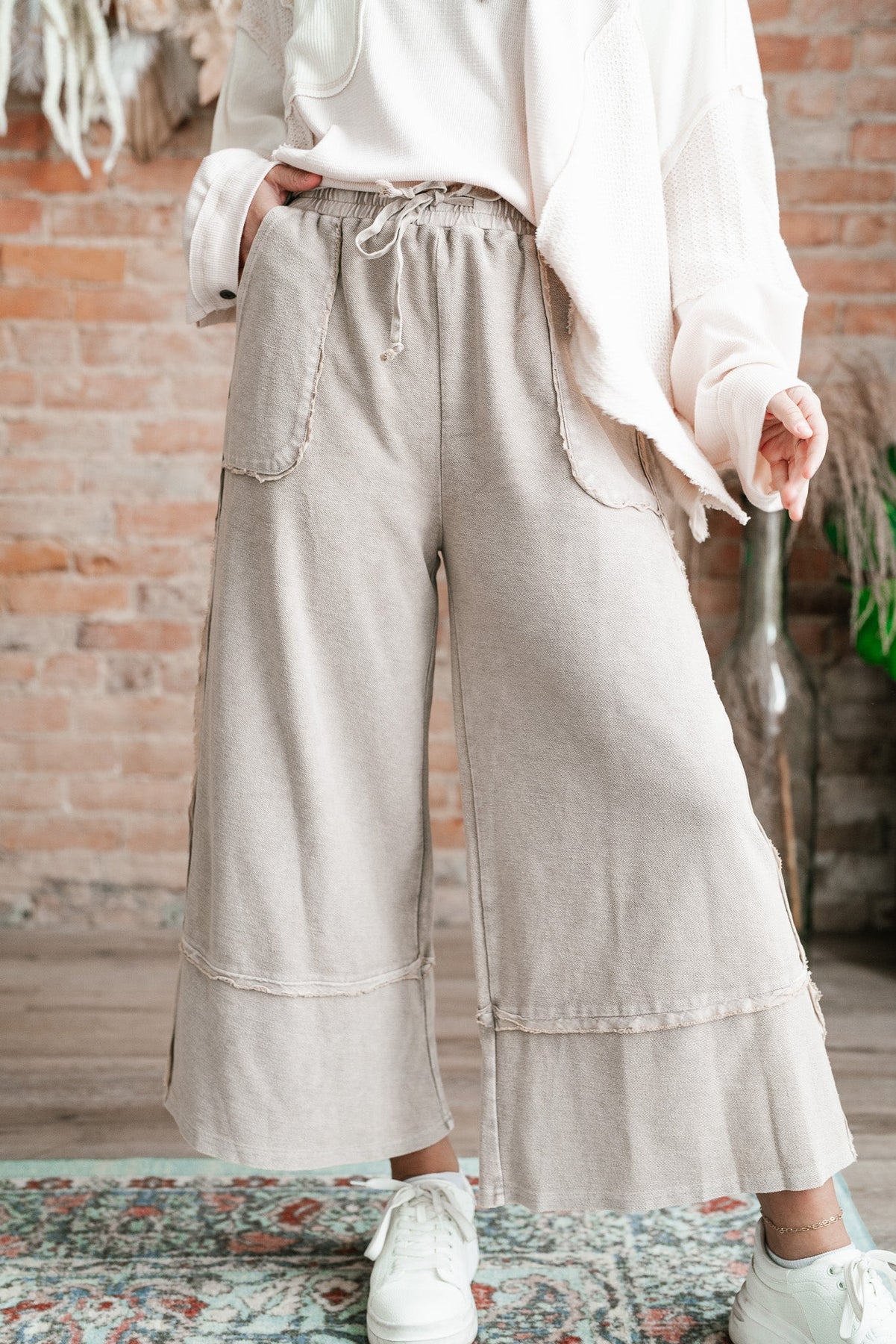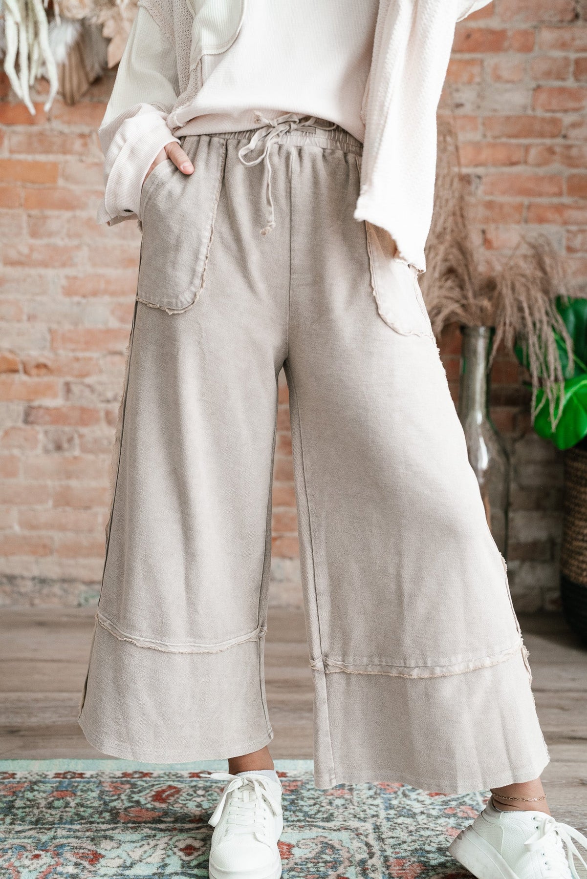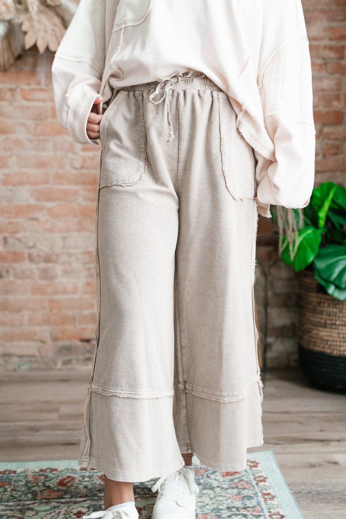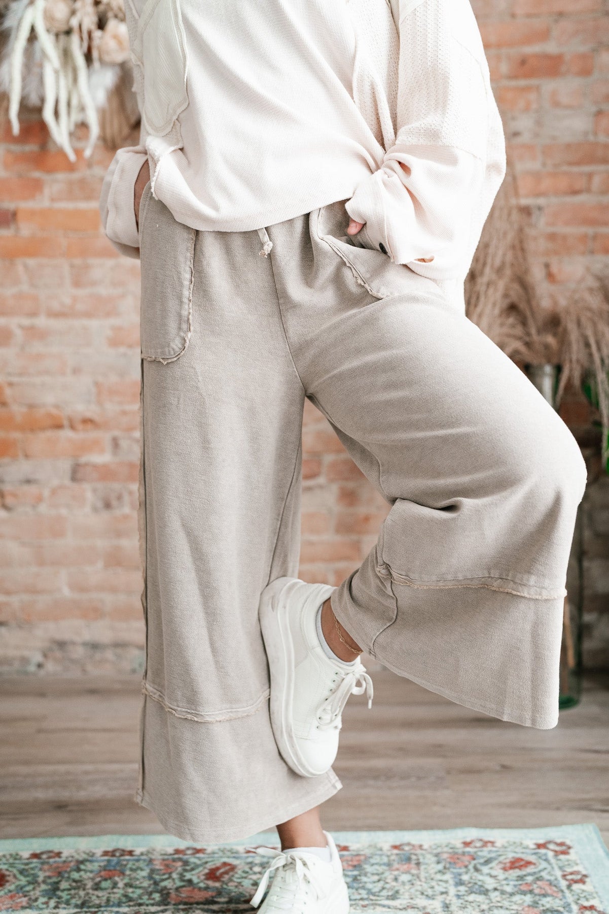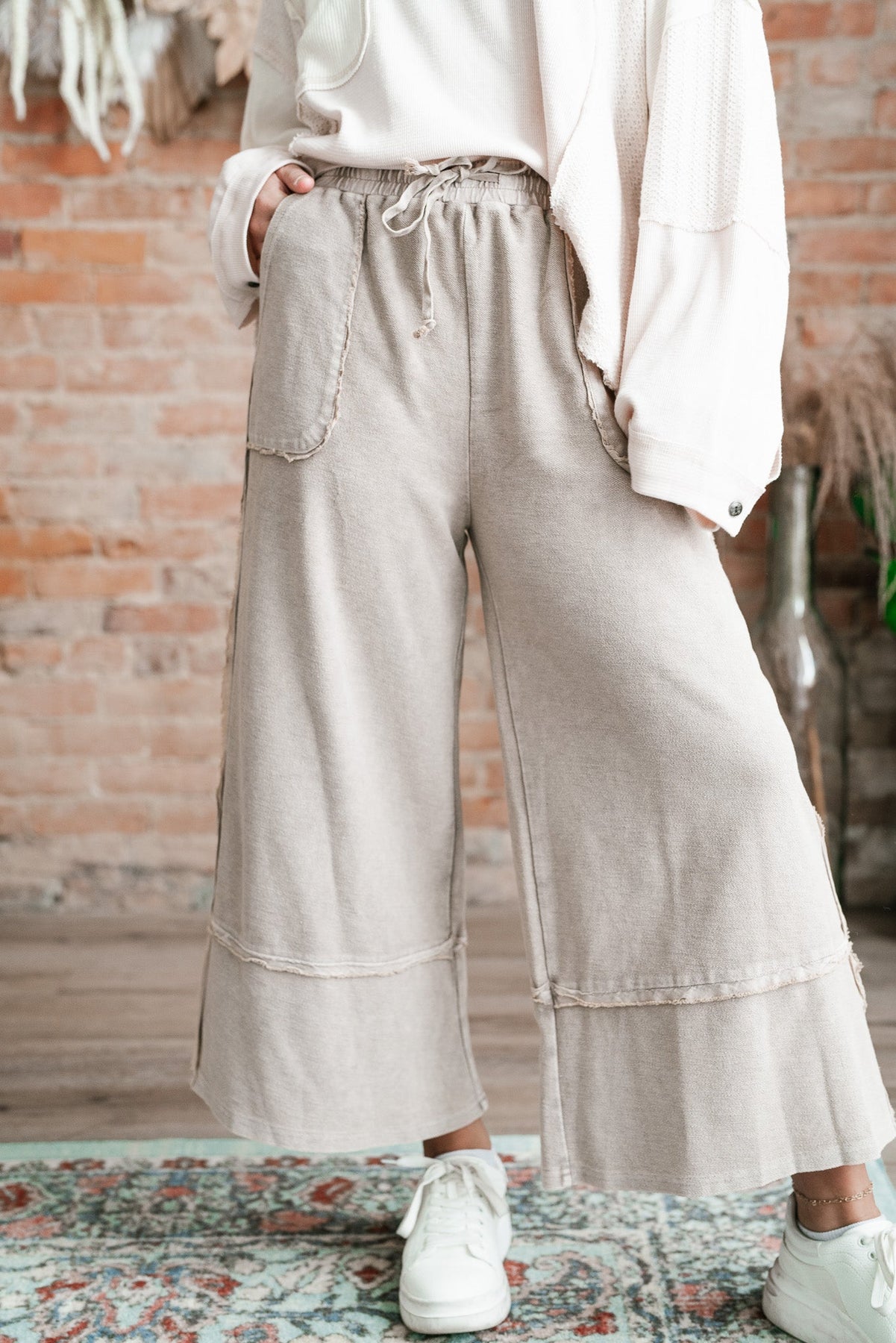 Who doesn't love a cute pair of pants?! The Can't Be Matched Mineral Wash Wide Leg Pants- Sand feature an adjustable draw-string waist, side pockets, a teal mineral washed fabric, and a relaxed wide leg fit. Style these pants with a fitted tank for a cute, complete look!