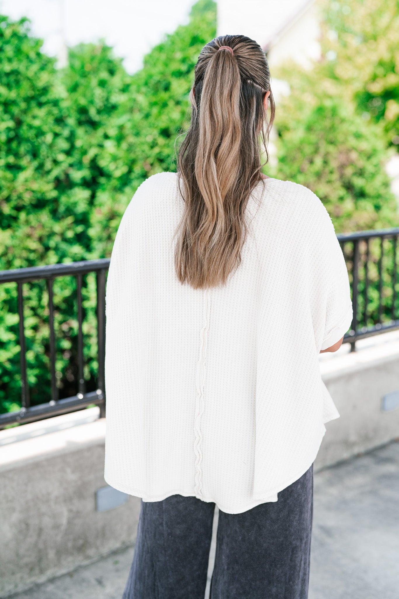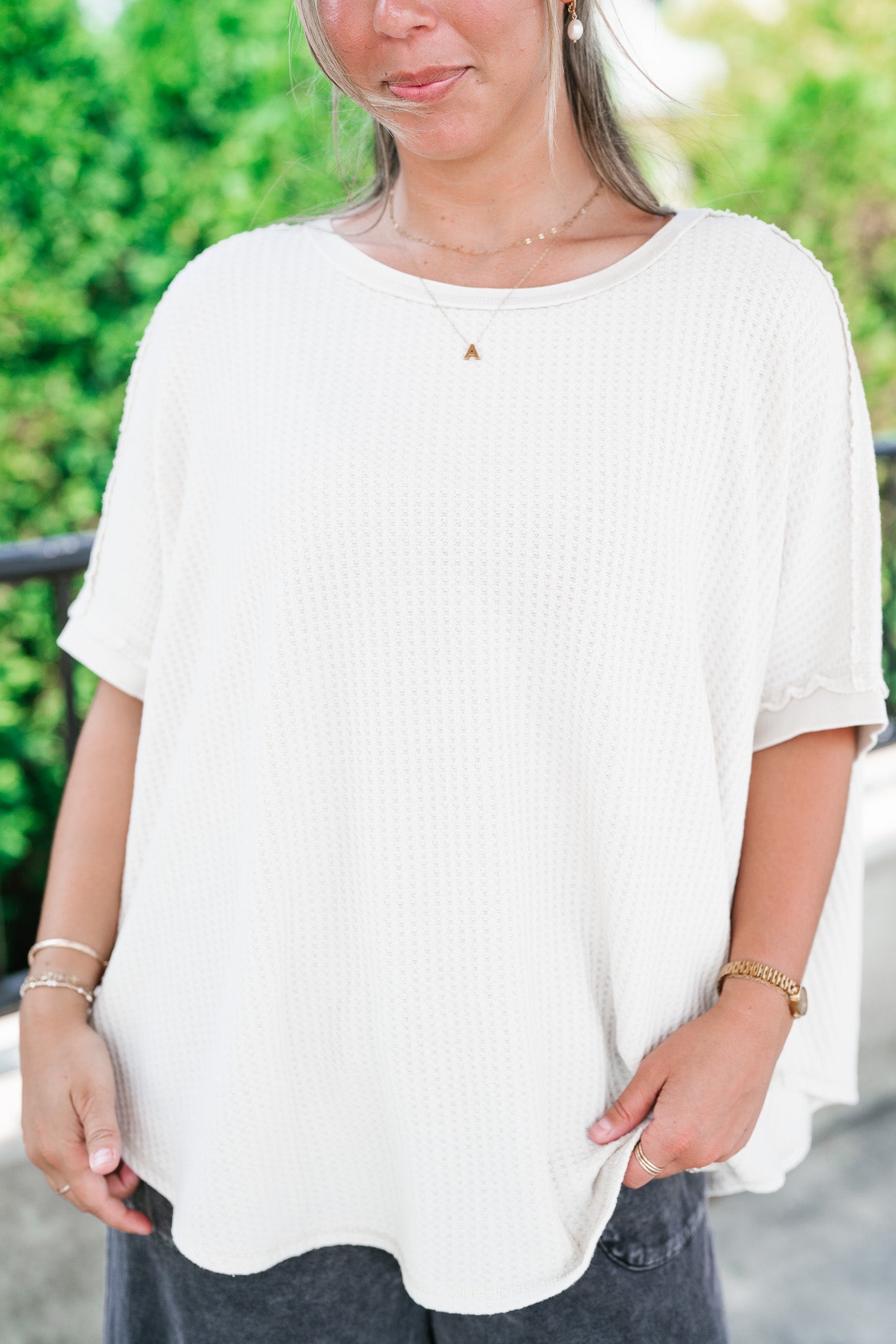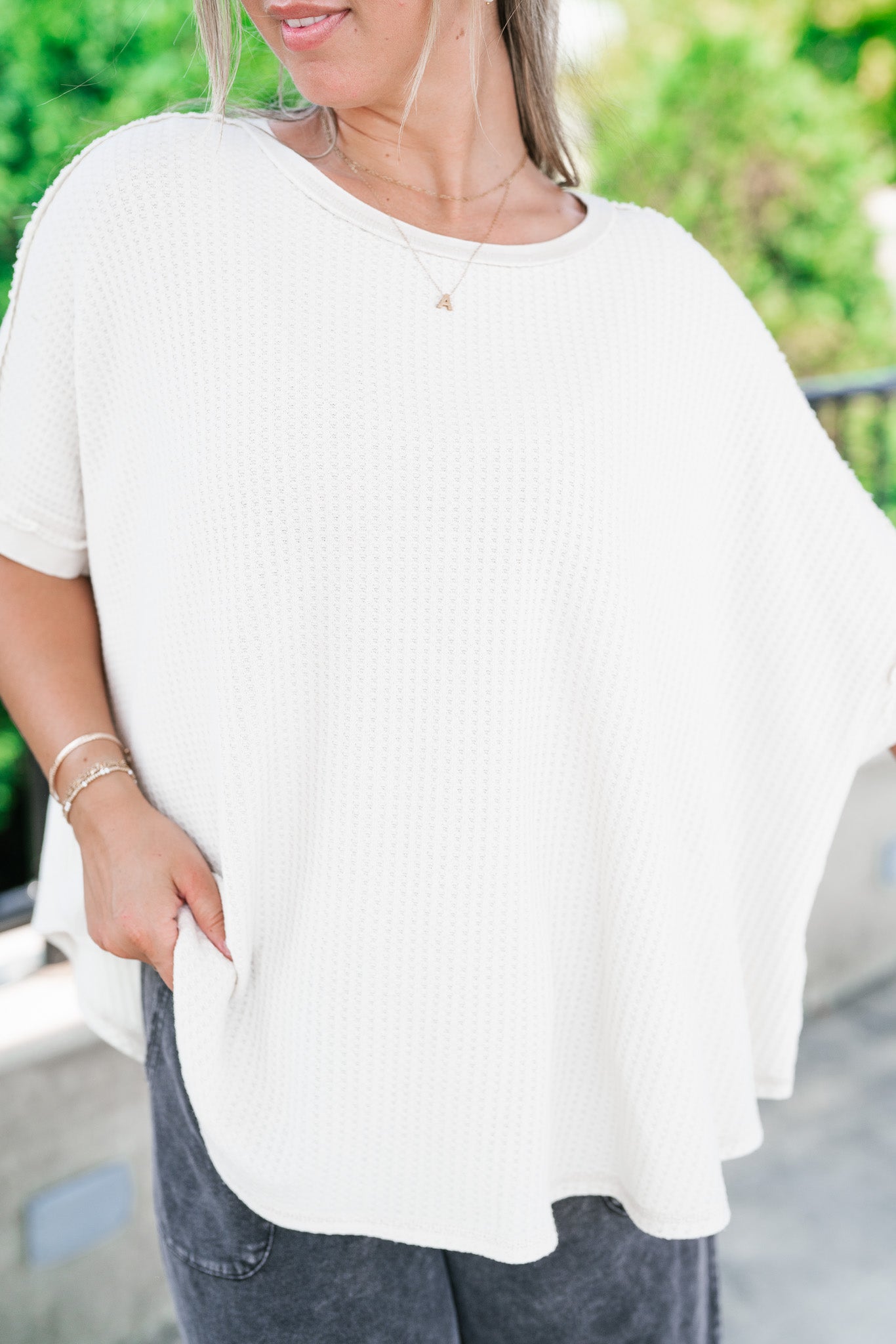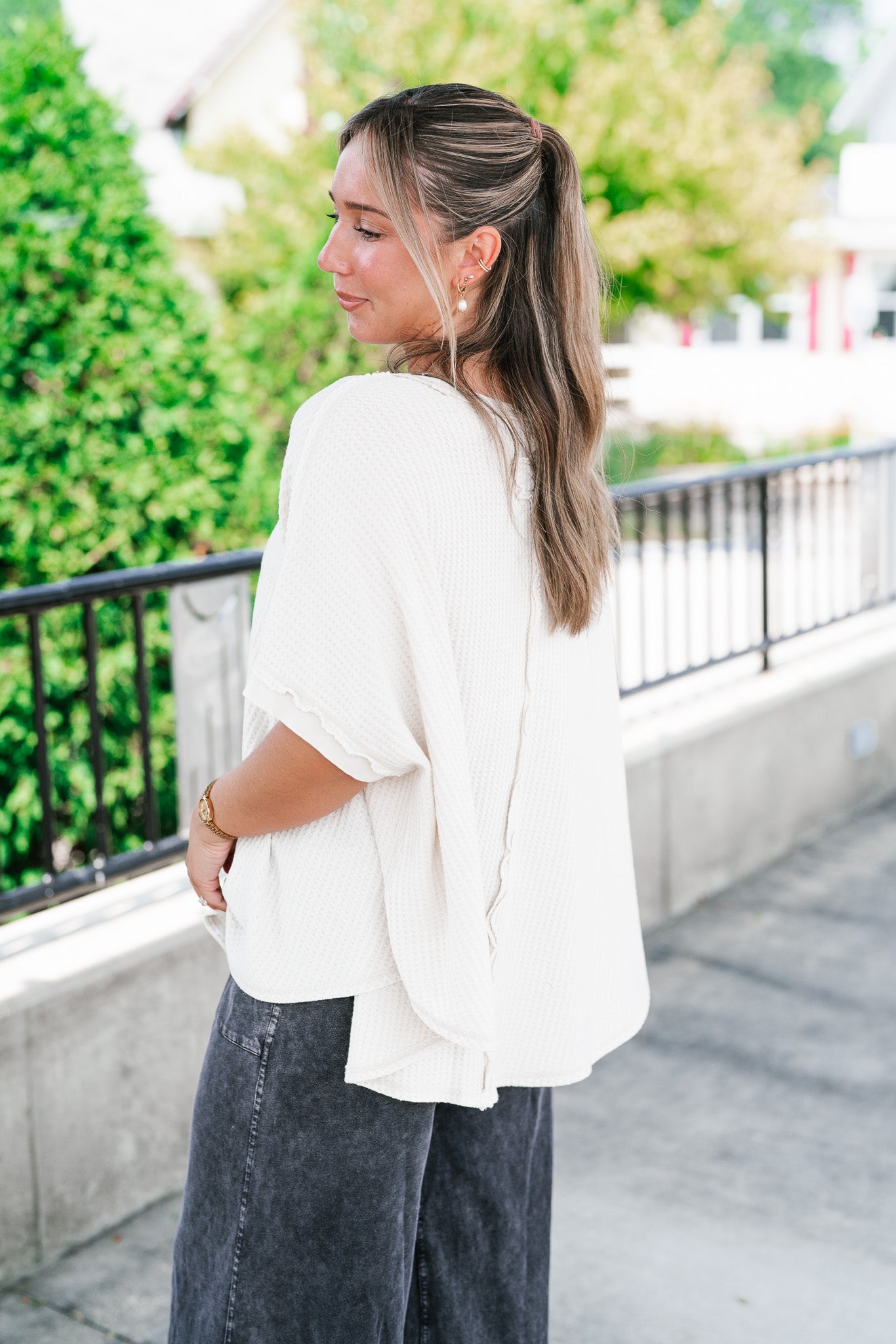 Wrap yourself in effortless comfort with our Cozy Dune Dolman Waffle Knit Top. This easygoing essential features a textured waffle knit fabric that adds depth and dimension to your look while keeping things ultra-soft and breathable. Designed with relaxed dolman sleeves and a boxy fit, it drapes beautifully for that laid-back, lived-in feel. Whether paired with denim, leggings, or layered under a jacket, this top is your go-to for cozy, casual days with a touch of style.