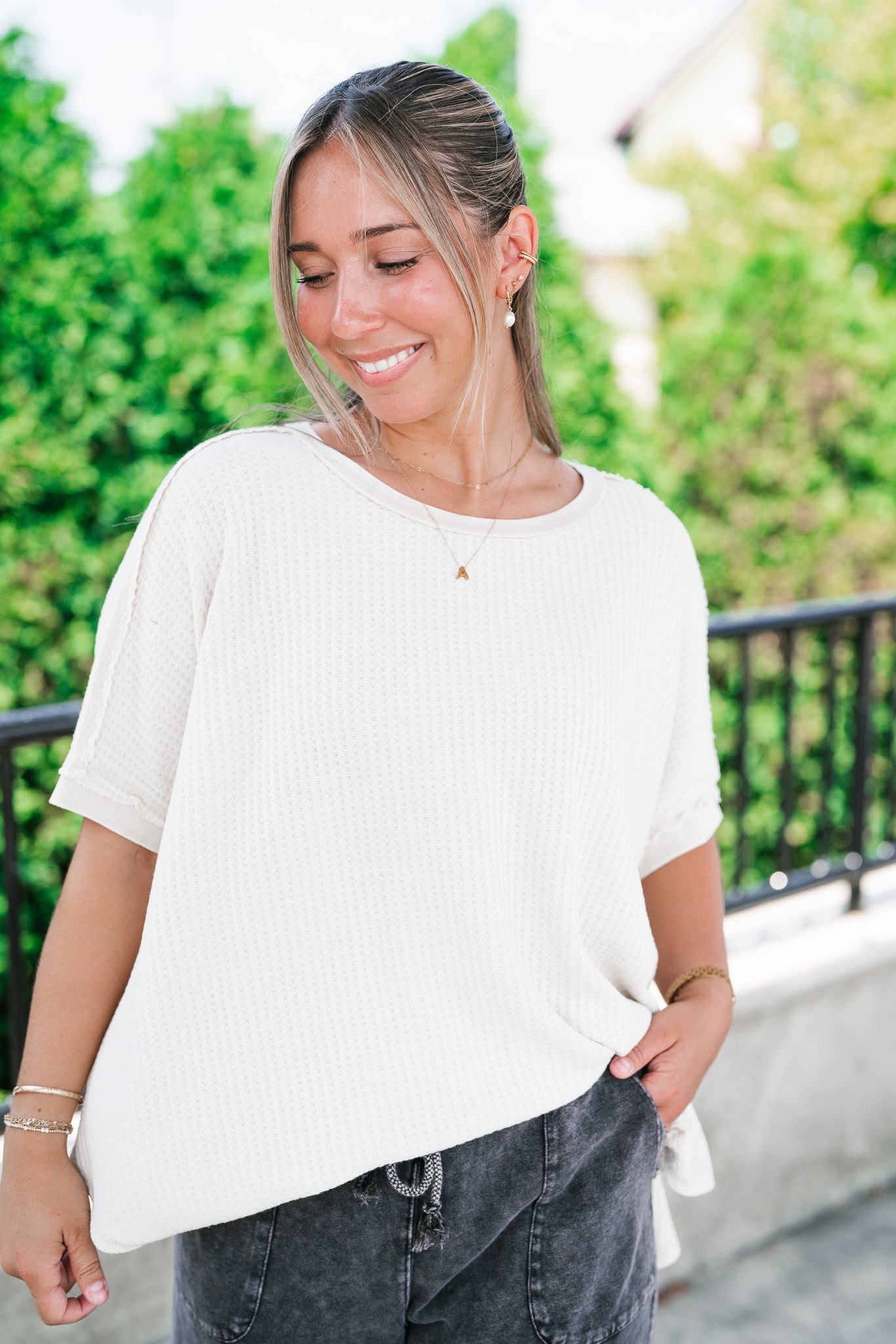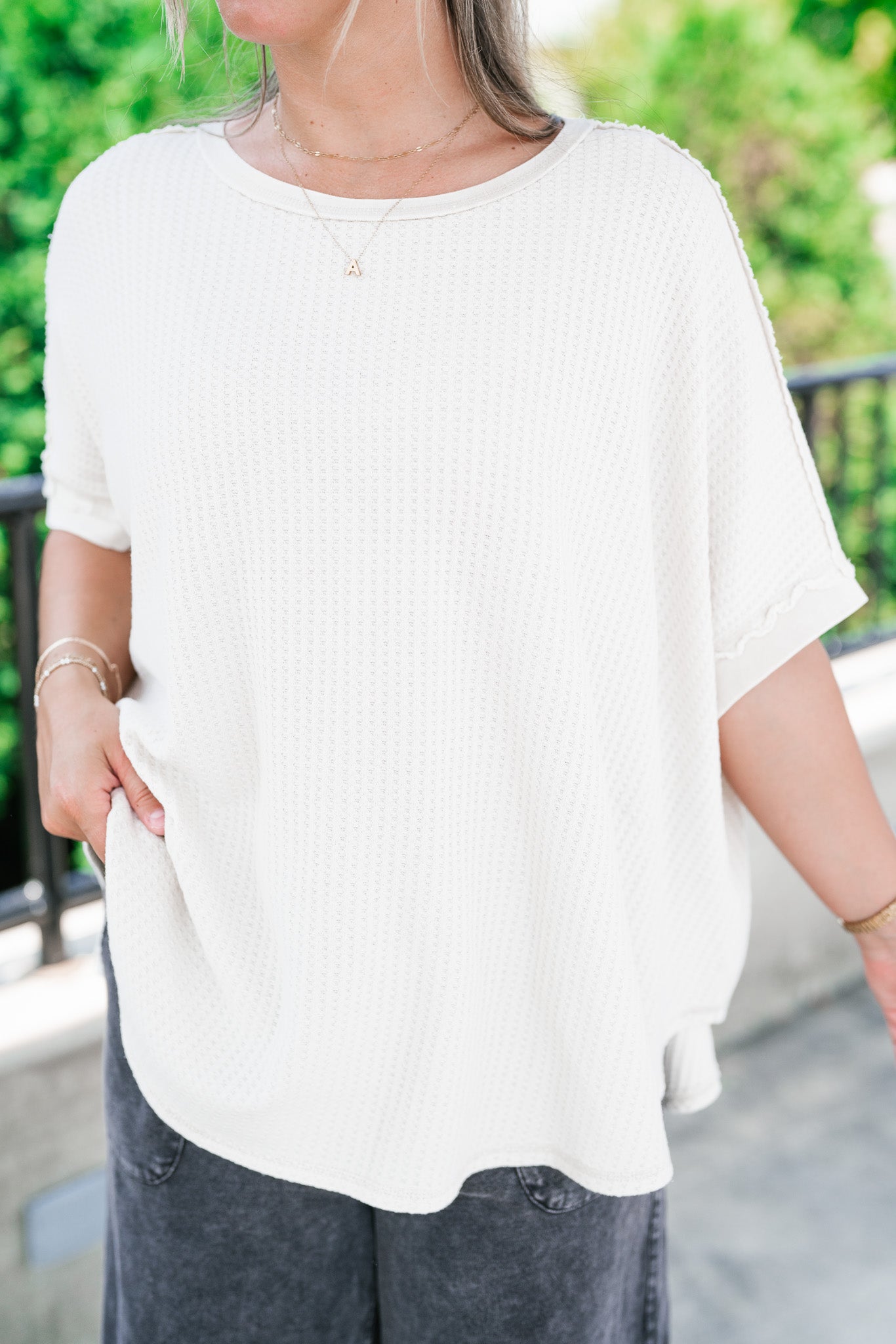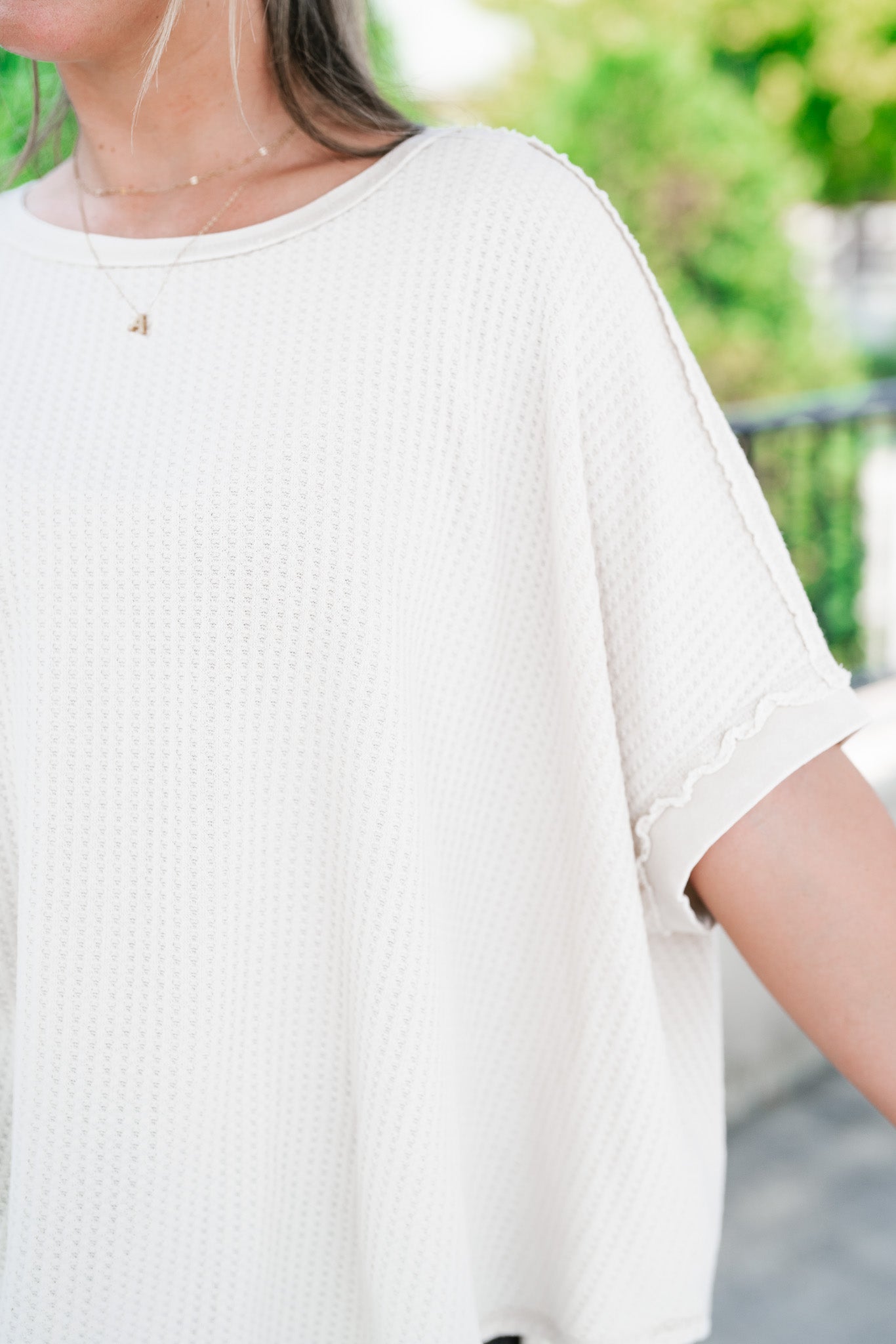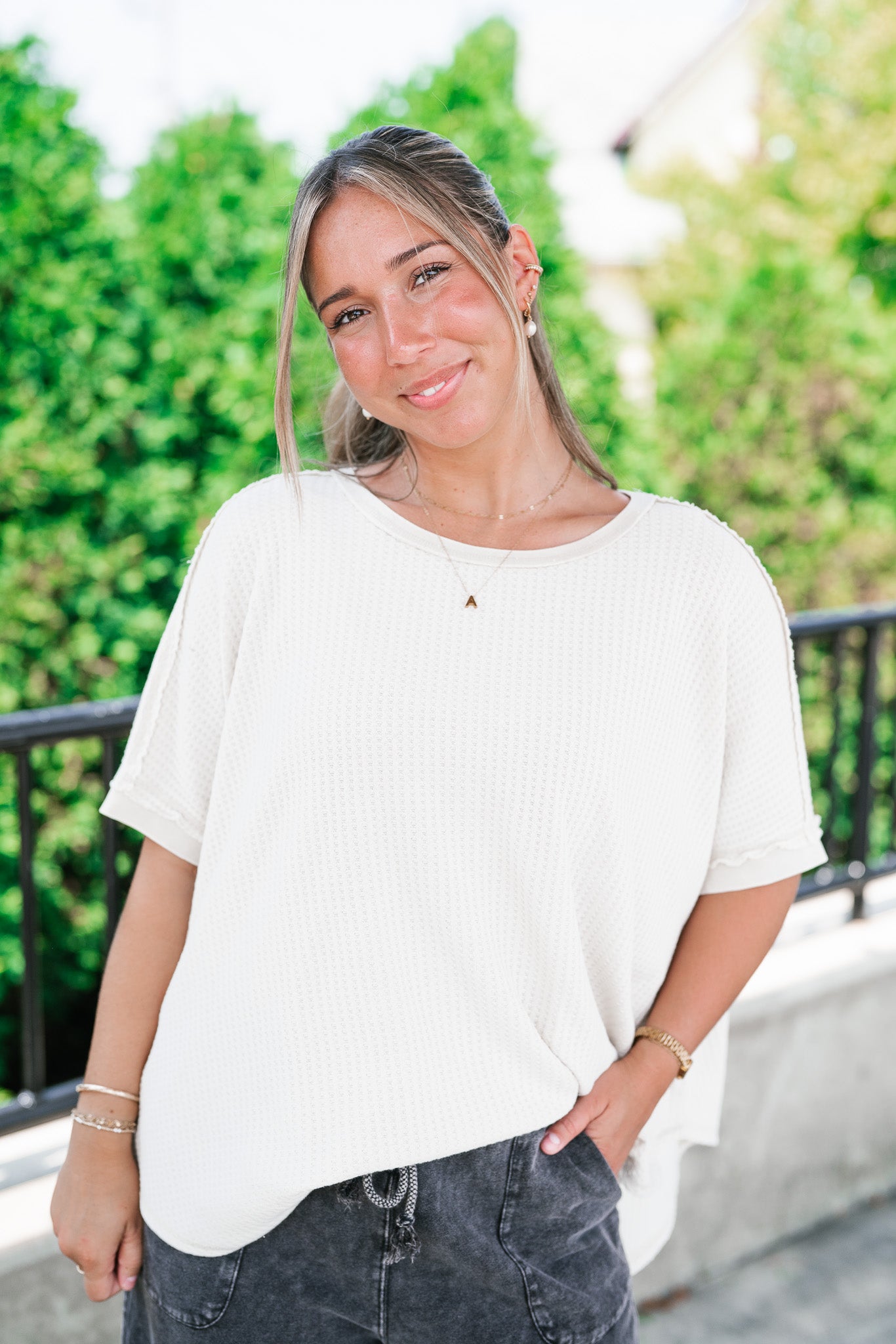 Wrap yourself in effortless comfort with our Cozy Dune Dolman Waffle Knit Top. This easygoing essential features a textured waffle knit fabric that adds depth and dimension to your look while keeping things ultra-soft and breathable. Designed with relaxed dolman sleeves and a boxy fit, it drapes beautifully for that laid-back, lived-in feel. Whether paired with denim, leggings, or layered under a jacket, this top is your go-to for cozy, casual days with a touch of style.
