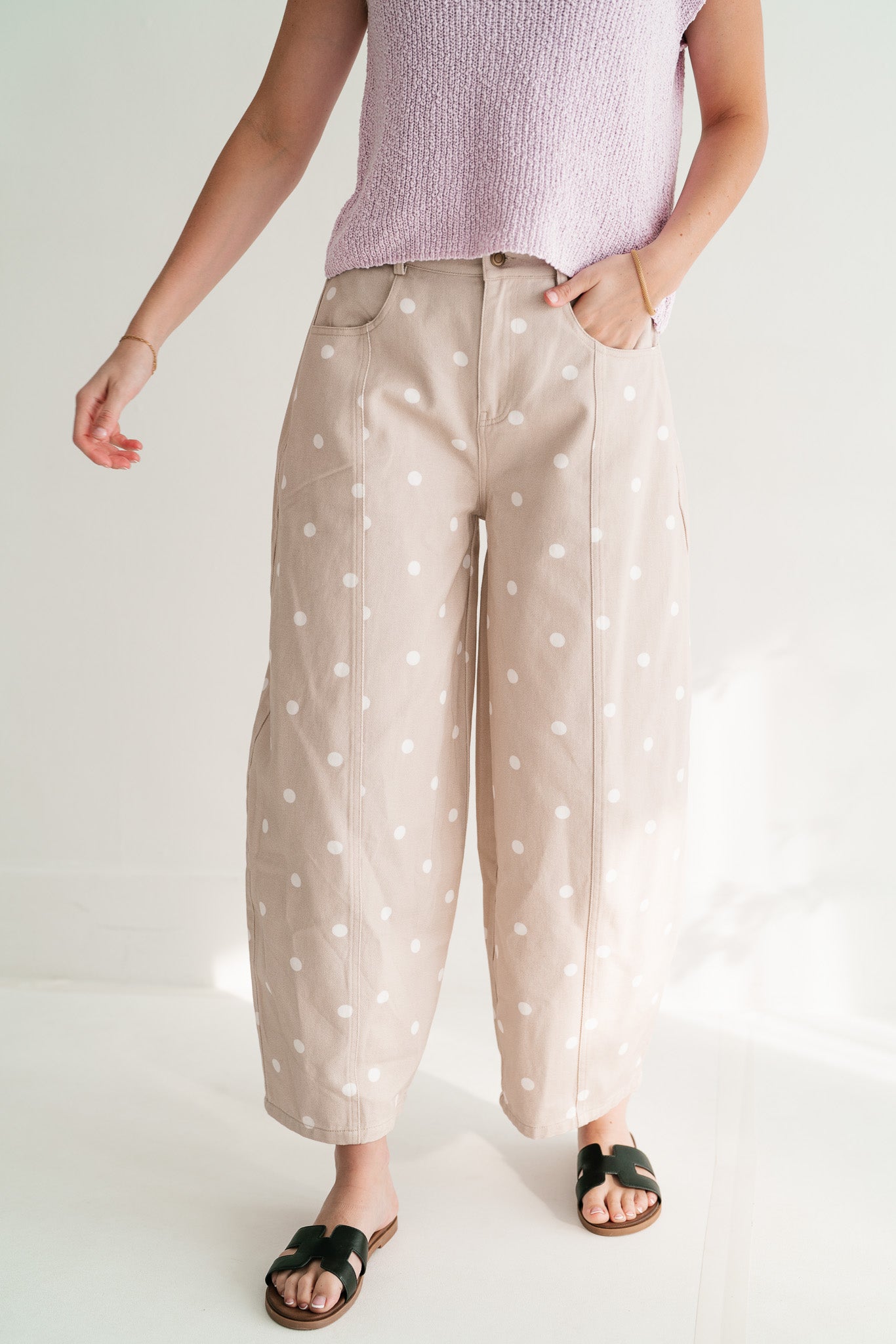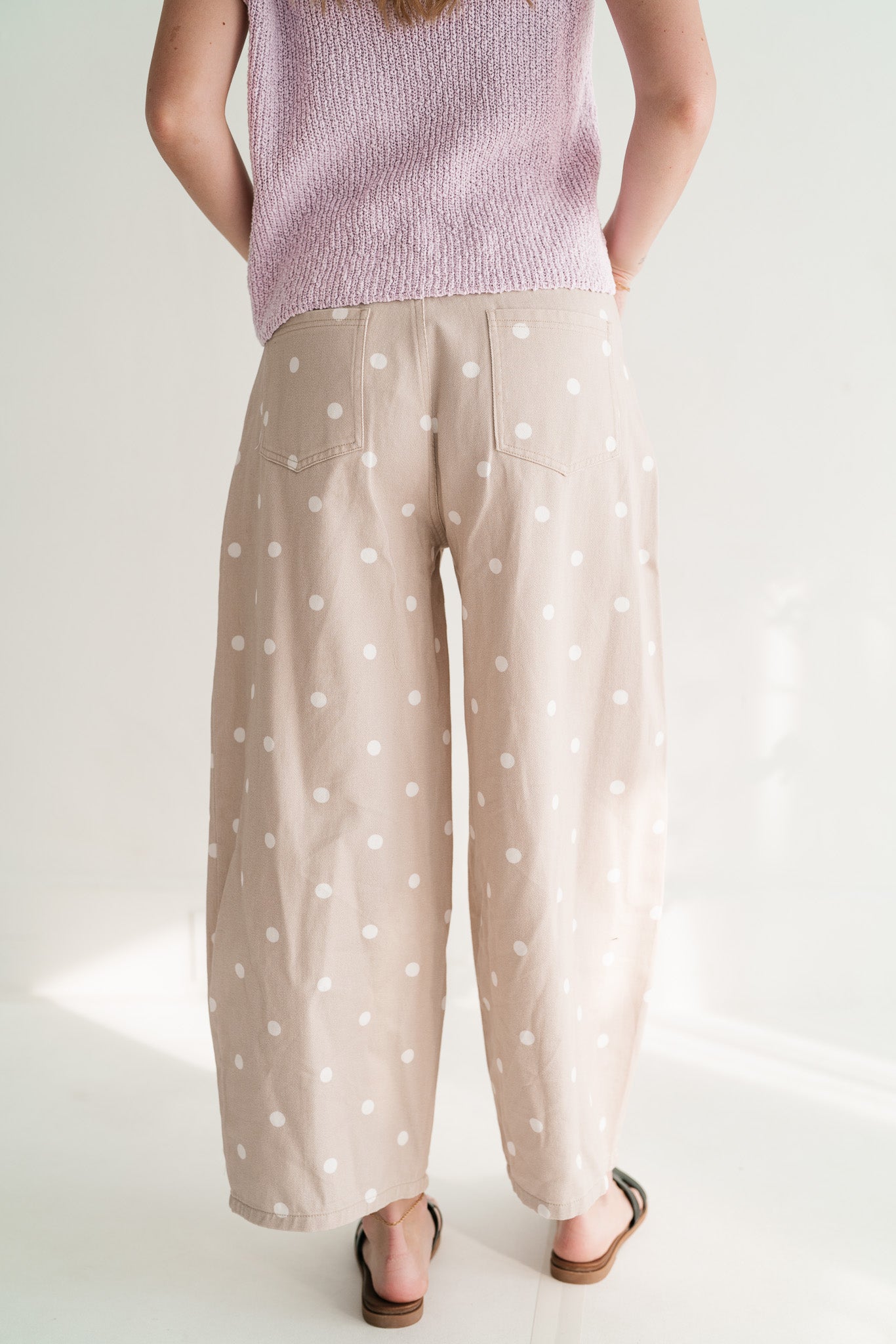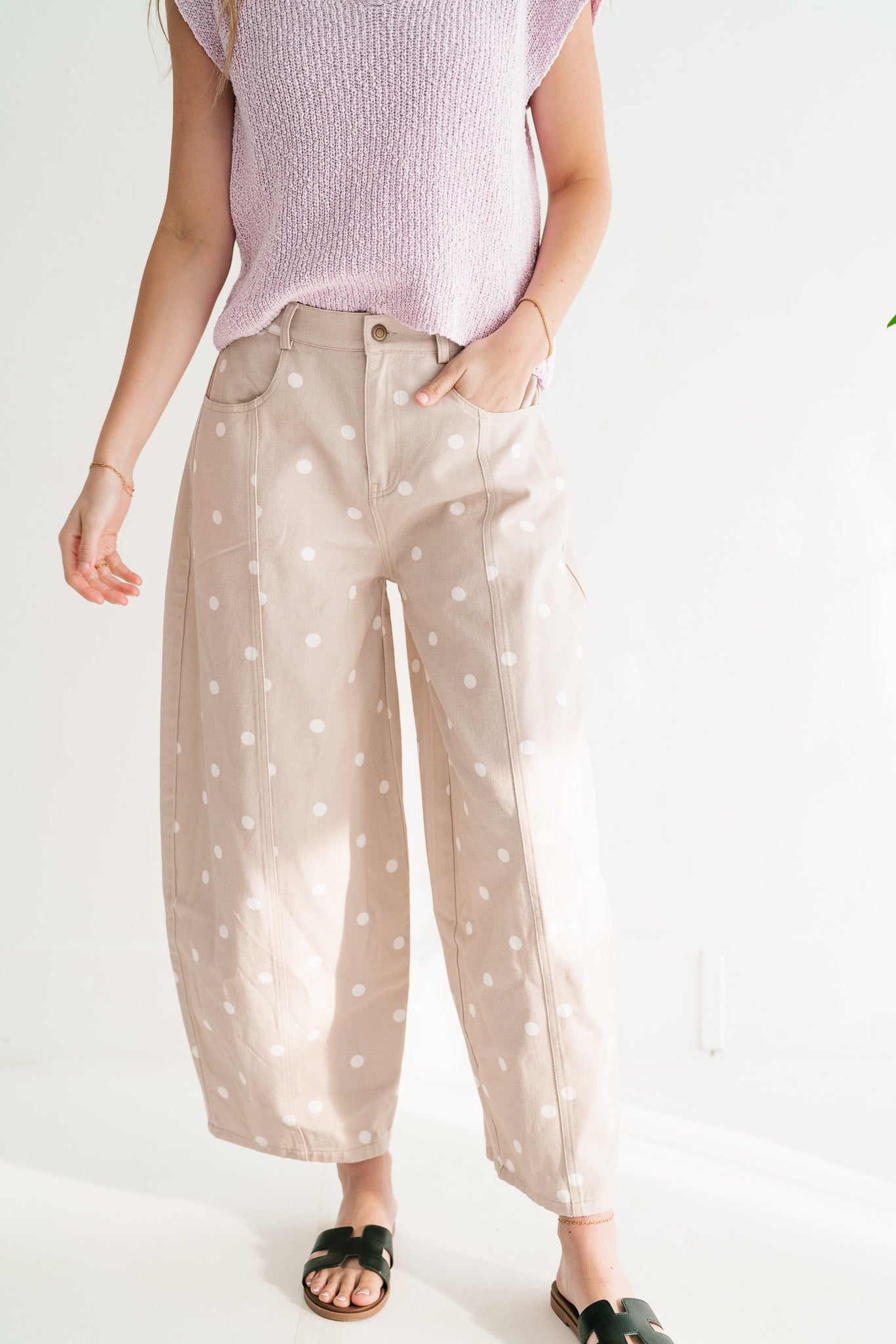 Delicate Polka Dot Barrel Leg Bottom: Effortless Chic Relaxed Fit