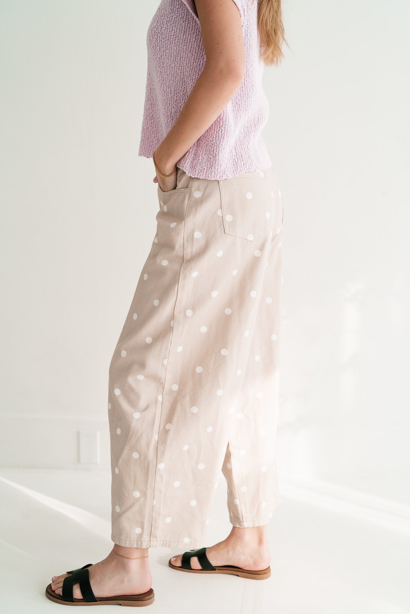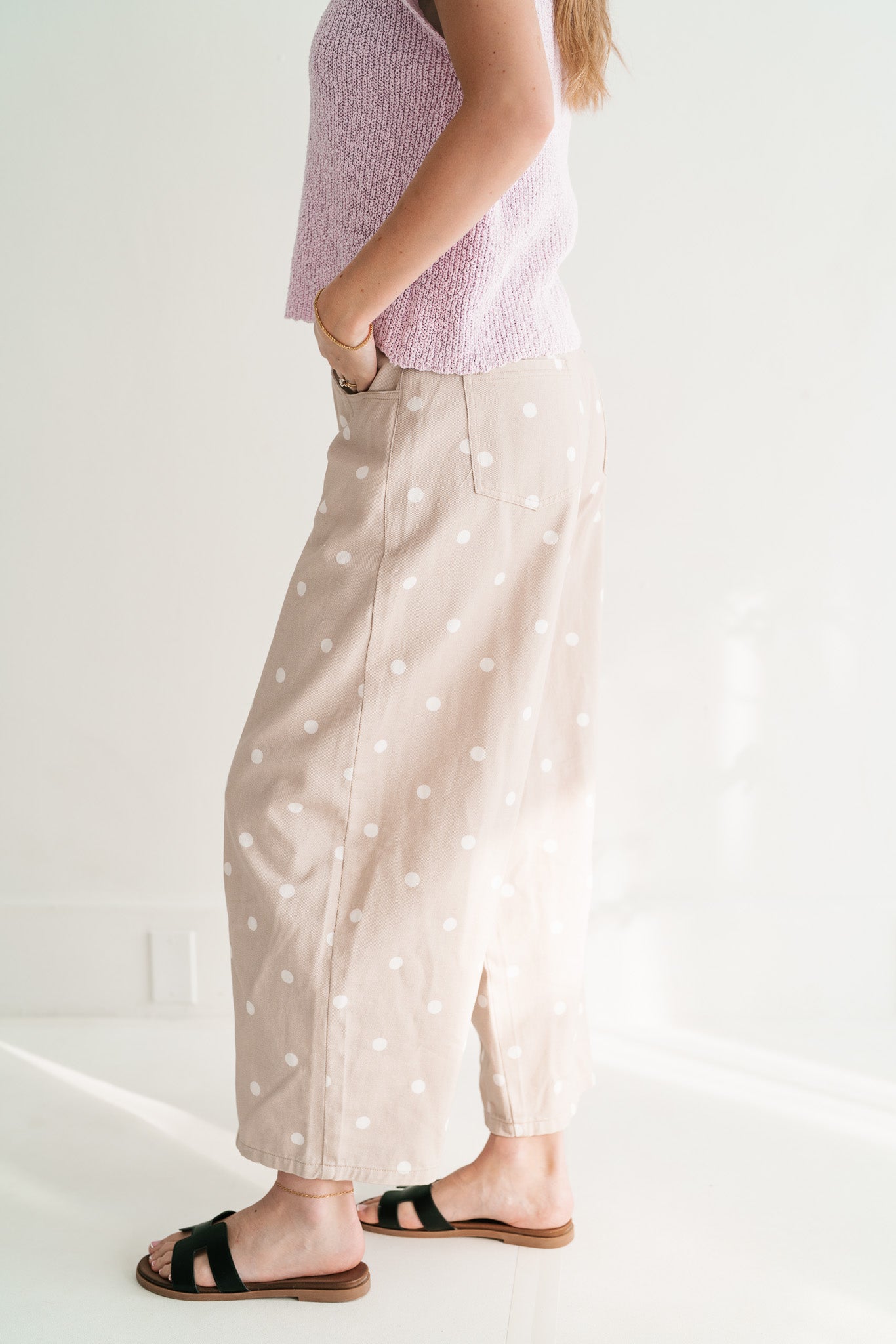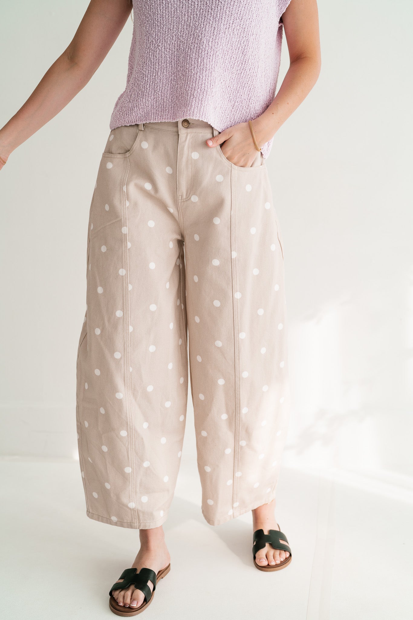Delicate Polka Dot Barrel Leg Bottom: Effortless Chic Relaxed Fit