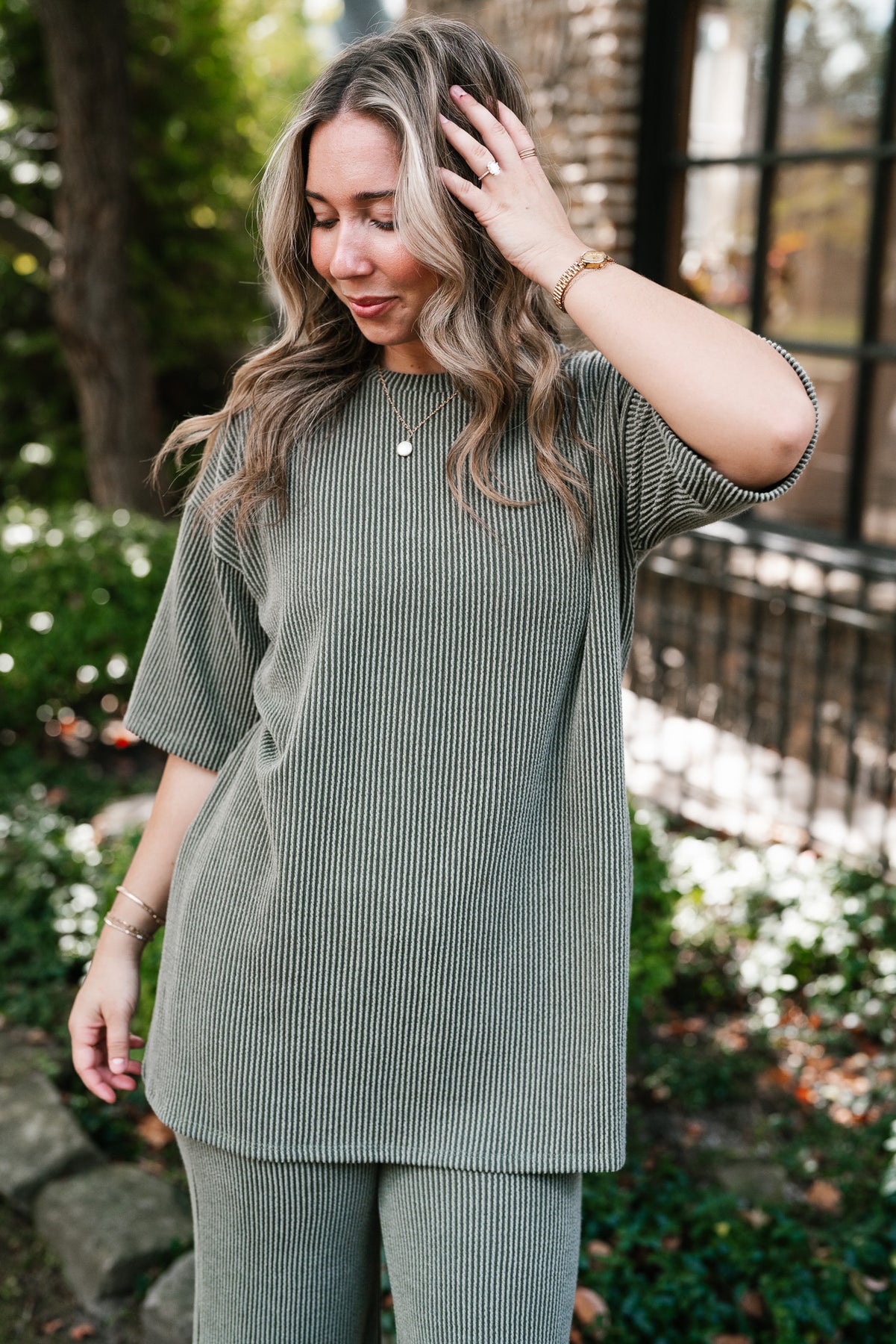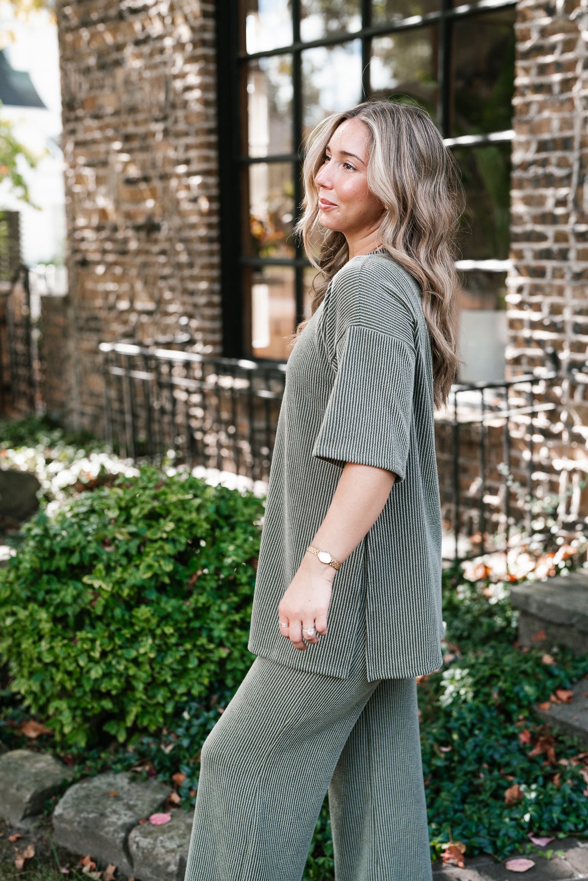 Looking for a soft olive ribbed top that works for every season? The Everyday Olive Ribbed Set - Top is a relaxed, everyday staple with an effortlessly cool drape and subtle texture that elevates even the simplest look. Its midweight ribbed fabric gives it shape while keeping it breathable enough for layering or wearing solo.