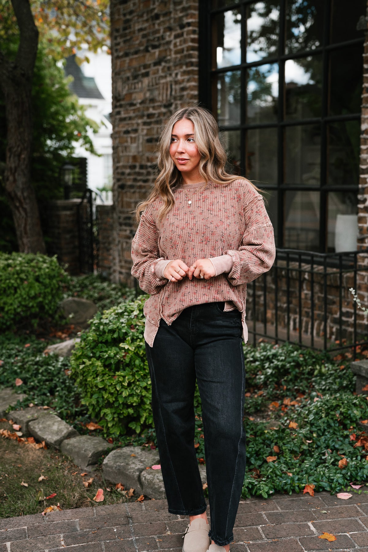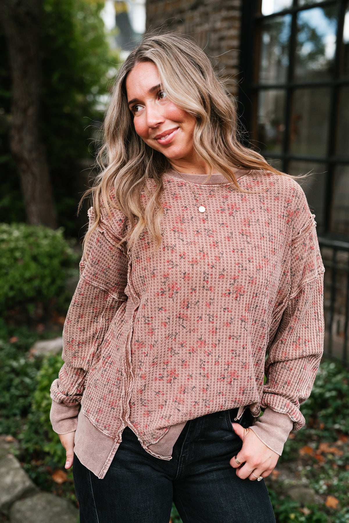 Looking for a cozy floral long sleeve you can wear all season long? This floral waffle knit top brings texture, warmth, and comfort together in one effortless piece. The soft mauve base with scattered floral detailing gives it a subtle feminine touch while keeping it easy for everyday wear.
