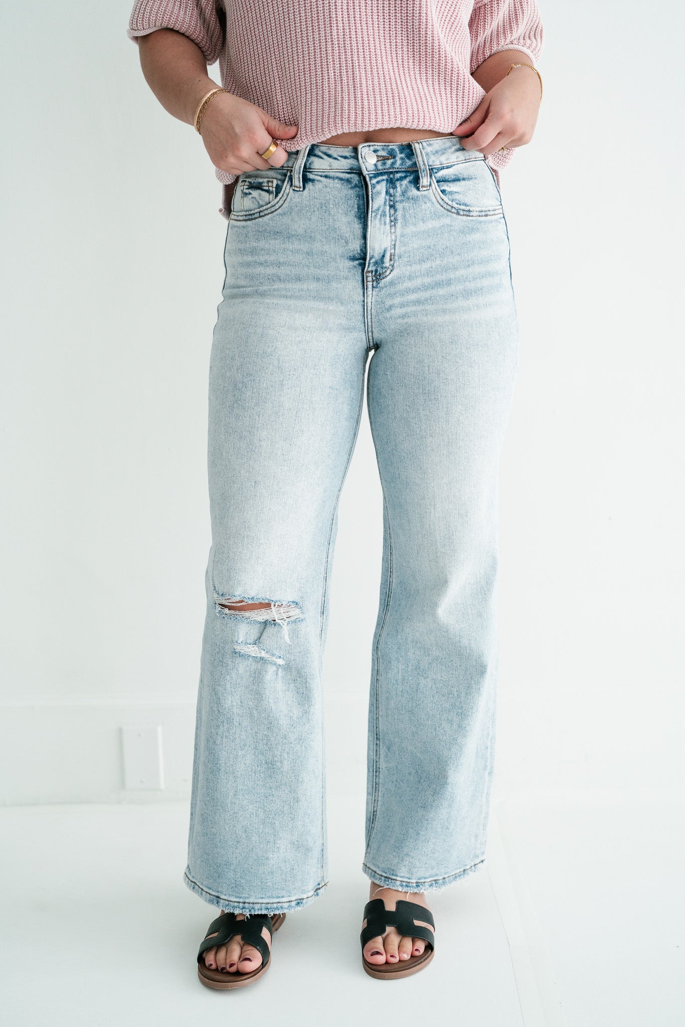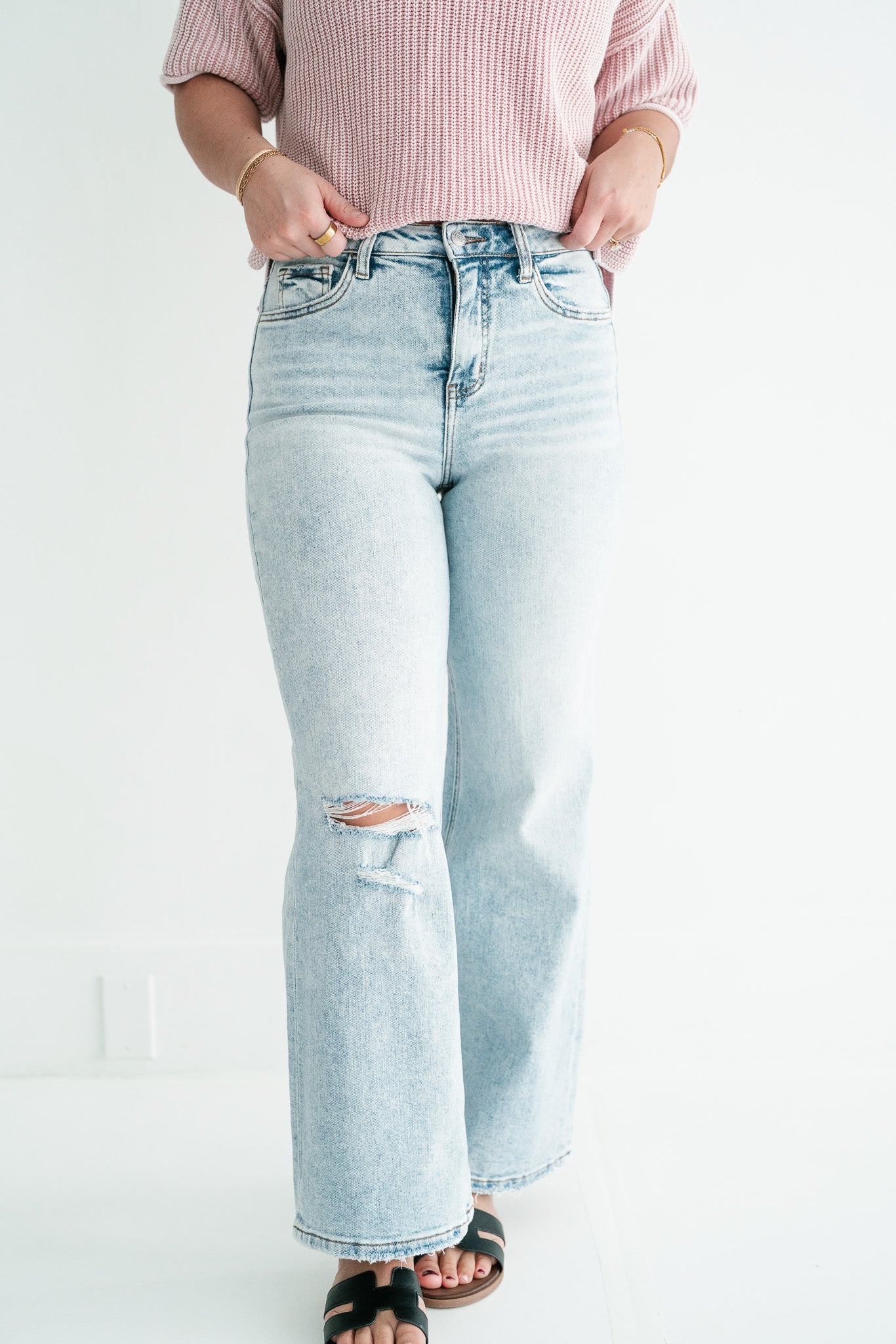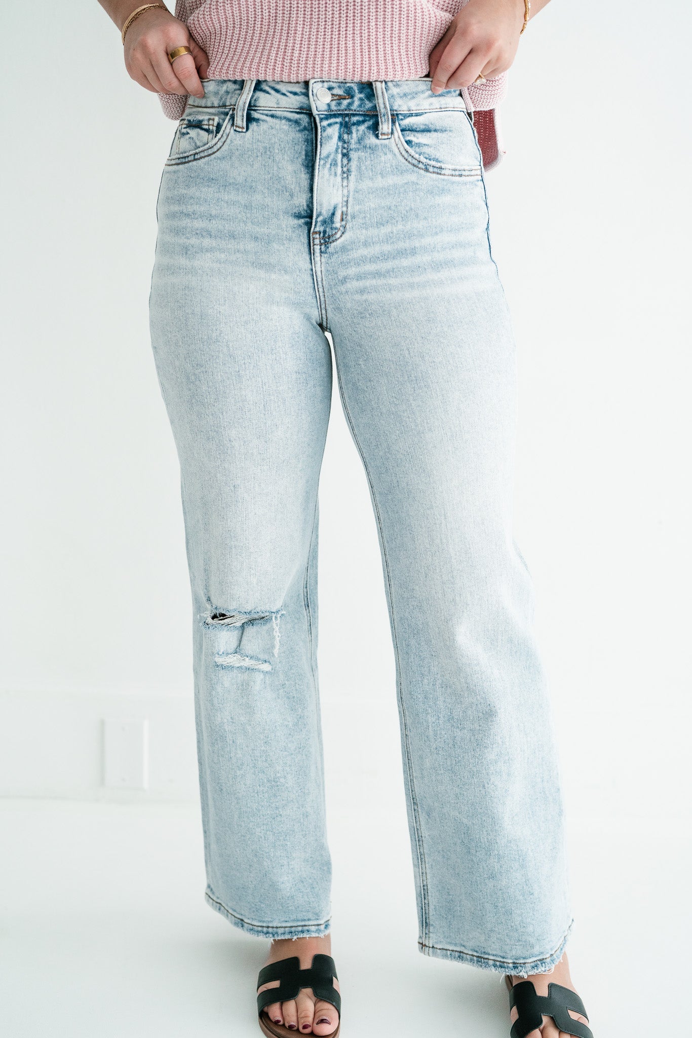 •  Vintage Distressed Aesthetics: Each pair features a raw, frayed hemline and a strategic knee blowout, combined with a light-wash finish to create an effortlessly cool, "lived-in" vibe.