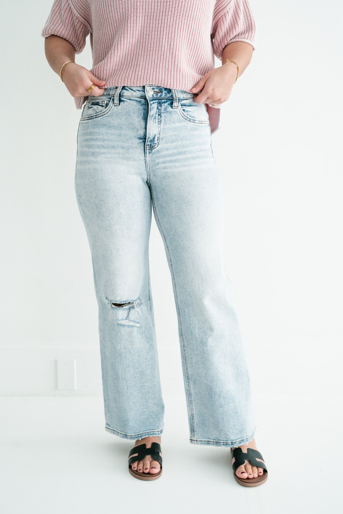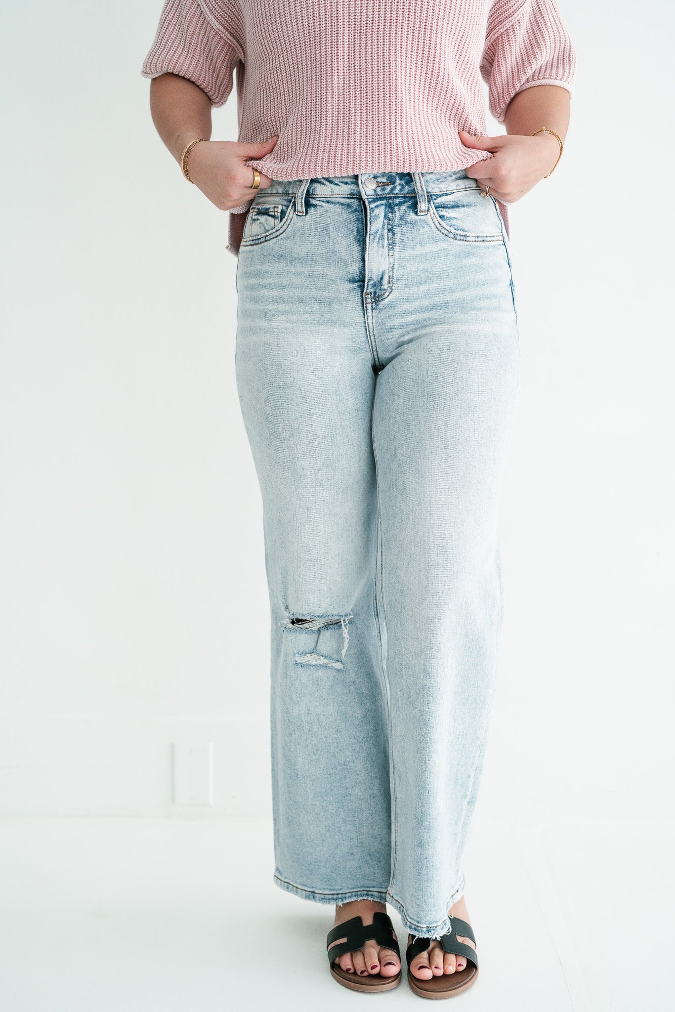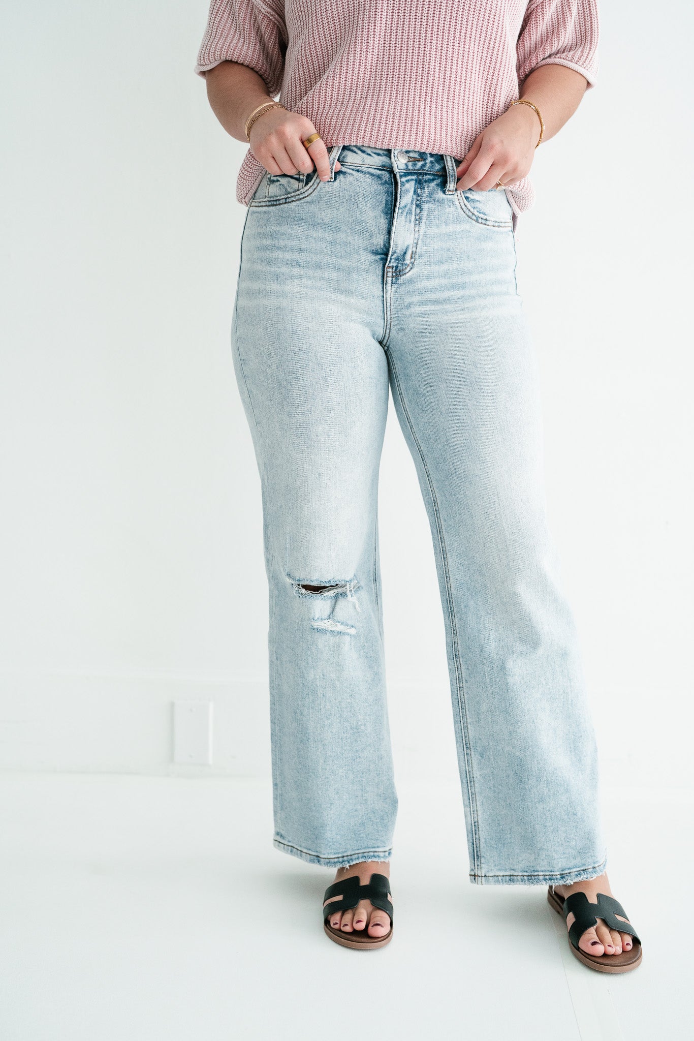 •  Vintage Distressed Aesthetics: Each pair features a raw, frayed hemline and a strategic knee blowout, combined with a light-wash finish to create an effortlessly cool, "lived-in" vibe.