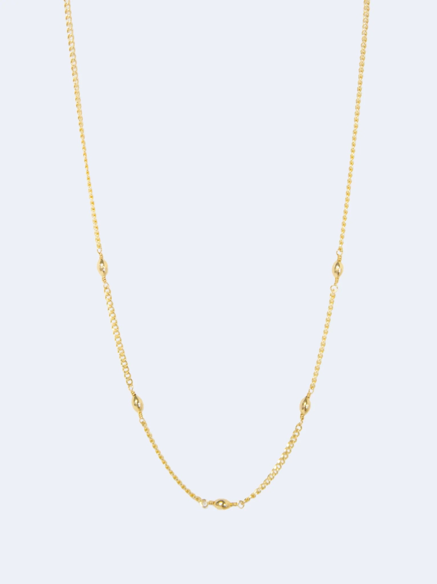 Say hello to your new everyday fave: the Nora Curb Chain Necklace. With its sleek curb chain and oval beads that shimmer just right, this necklace knows how to keep things classic and simple. Whether you’re heading to the office, working out, or just chilling at home, this dainty yet bold necklace adds that little something extra to any look. Go ahead—wear it every day, we dare you! The Nora Curb Chain Necklace stands out for its sophistication and elegance, adding a refined touch that enhances any outfit. It features a clean and classic design, perfect for those who appreciate timeless style. The necklace showcases five elegant oval-shaped beads that seamlessly connect the chain, creating a sophisticated and harmonious look. Made with the finest materials and exceptional craftsmanship, this piece is designed to be cherished for years to come.