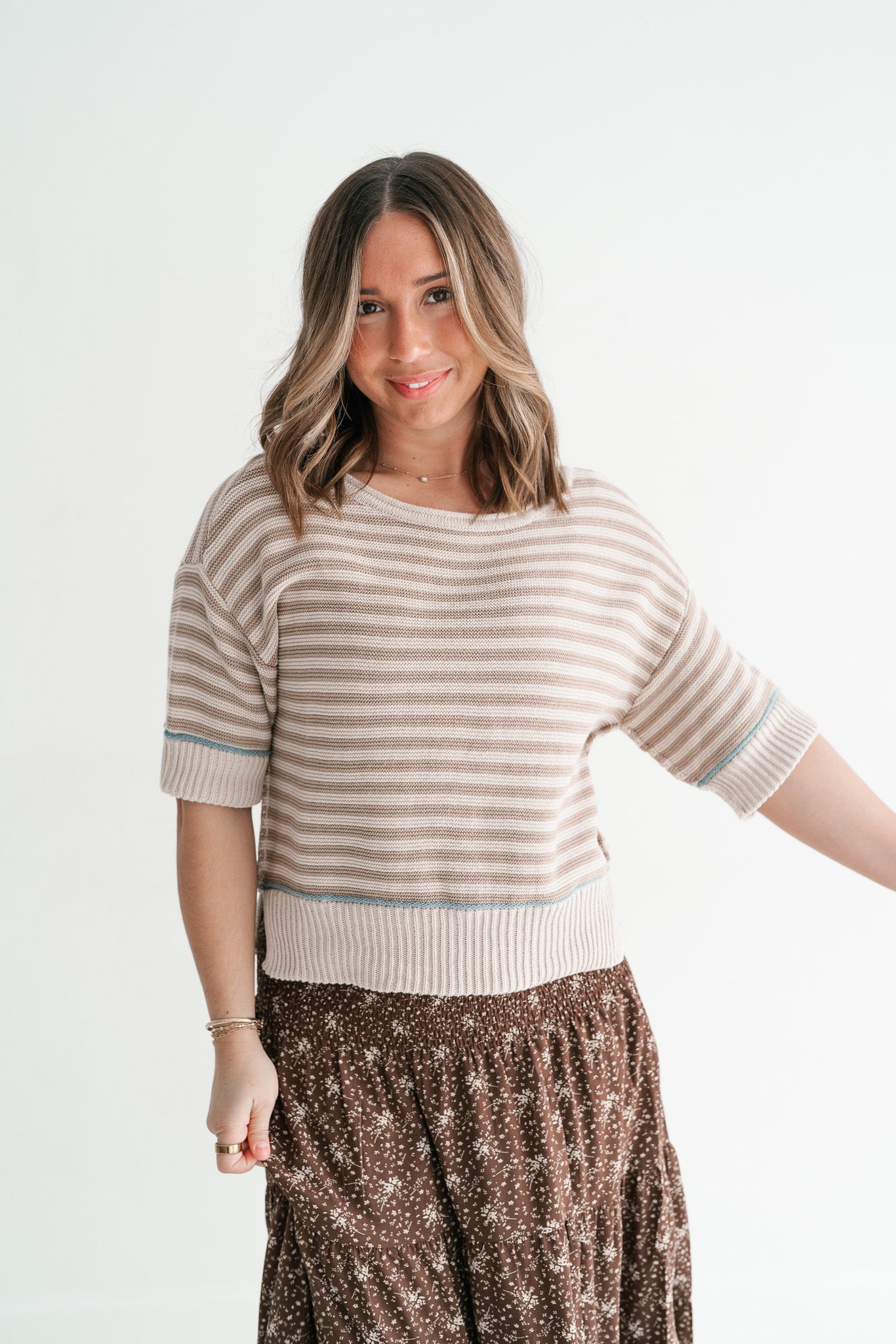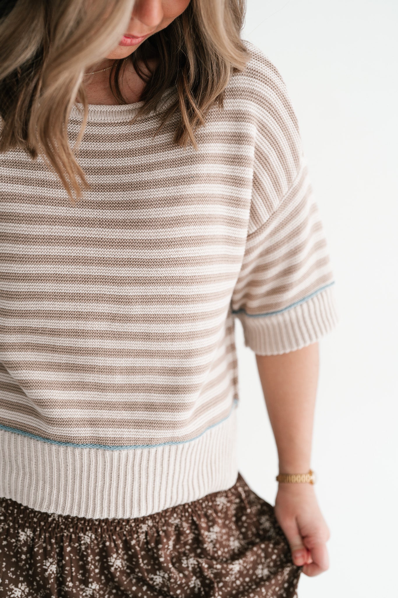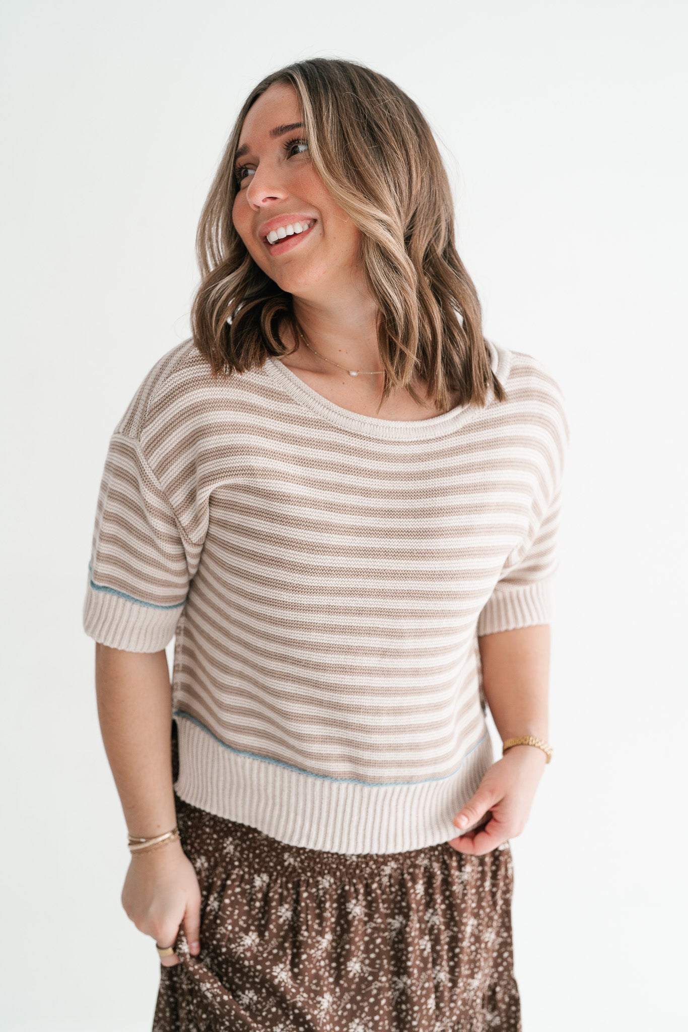 Elevate your everyday wardrobe with the Airy Muse Striped Knit Short Sleeve Top, where coastal sophistication meets modern comfort. Crafted from a premium, breathable lightweight knit, this beige and cream horizontal stripe pullover is designed to keep you cool while looking effortlessly polished. Featuring a unique pop of blue contrast stitching at the hem and sleeves, this versatile piece transitions seamlessly from a sun-drenched brunch to a relaxed evening by the shore.