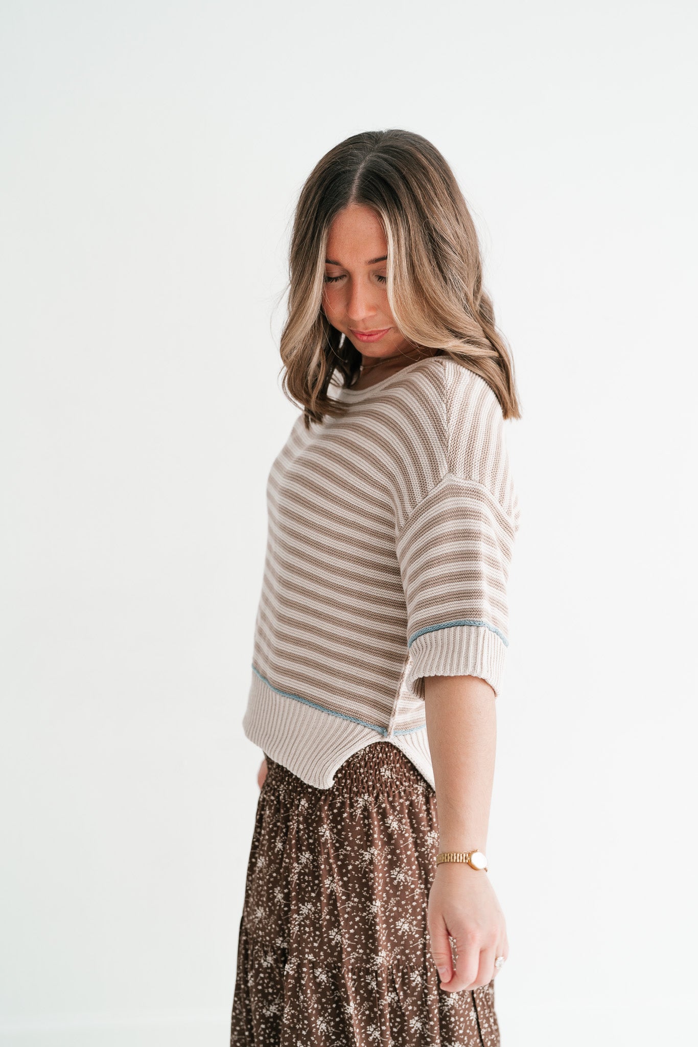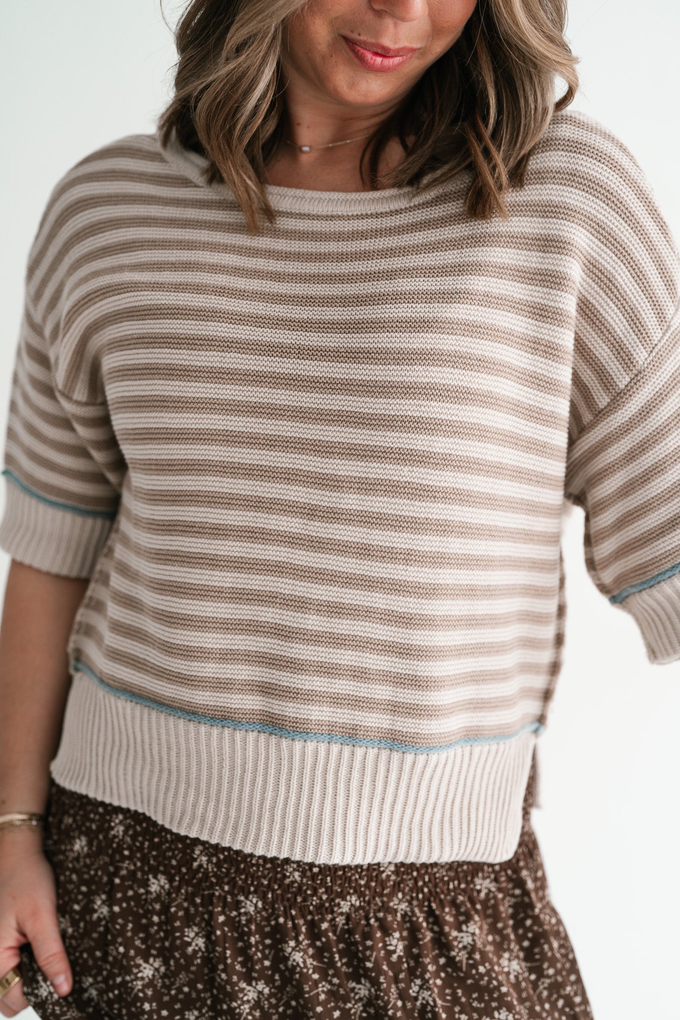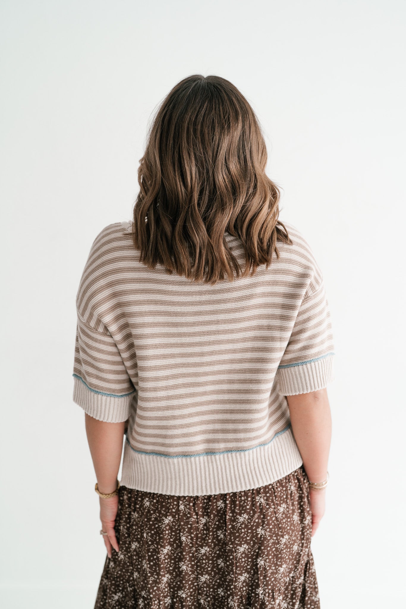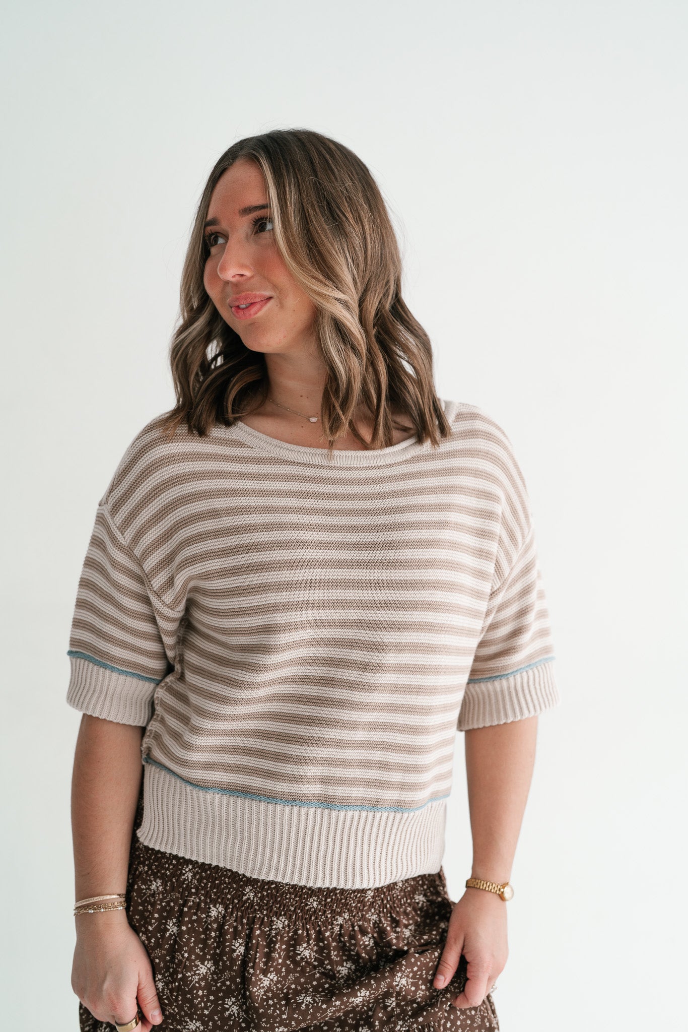 Elevate your everyday wardrobe with the Airy Muse Striped Knit Short Sleeve Top, where coastal sophistication meets modern comfort. Crafted from a premium, breathable lightweight knit, this beige and cream horizontal stripe pullover is designed to keep you cool while looking effortlessly polished. Featuring a unique pop of blue contrast stitching at the hem and sleeves, this versatile piece transitions seamlessly from a sun-drenched brunch to a relaxed evening by the shore.