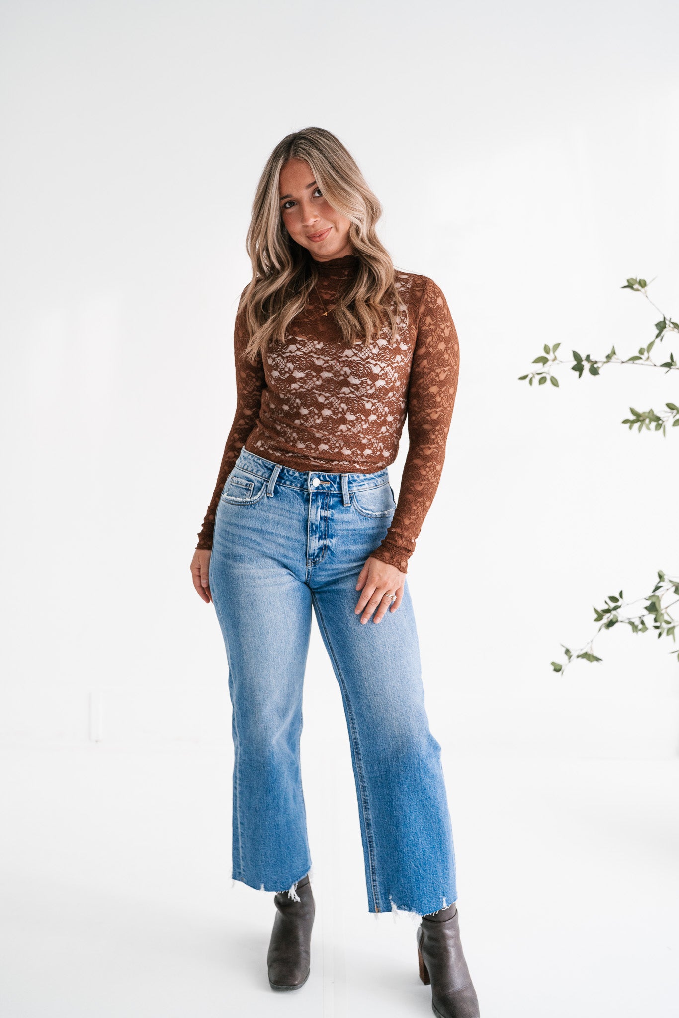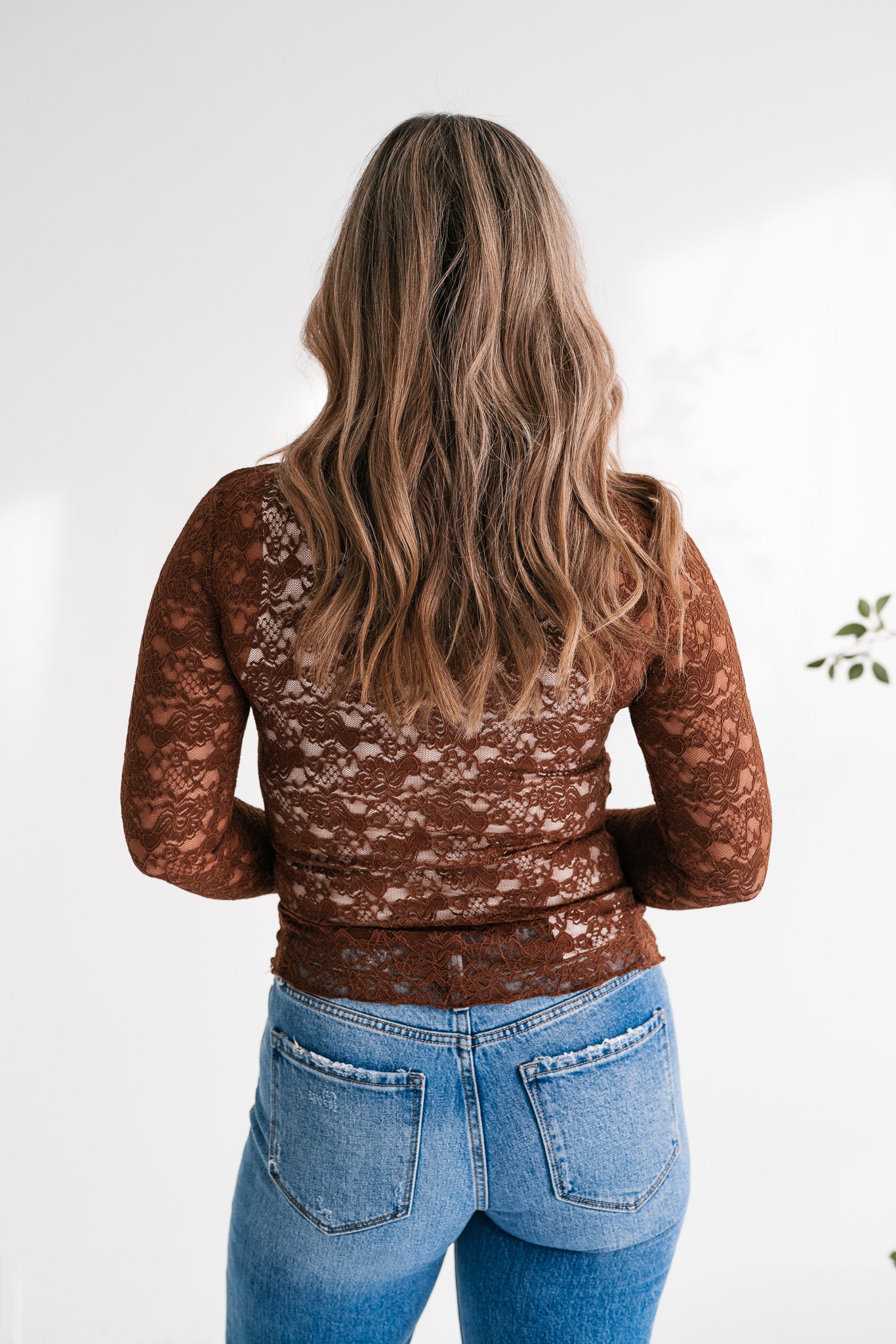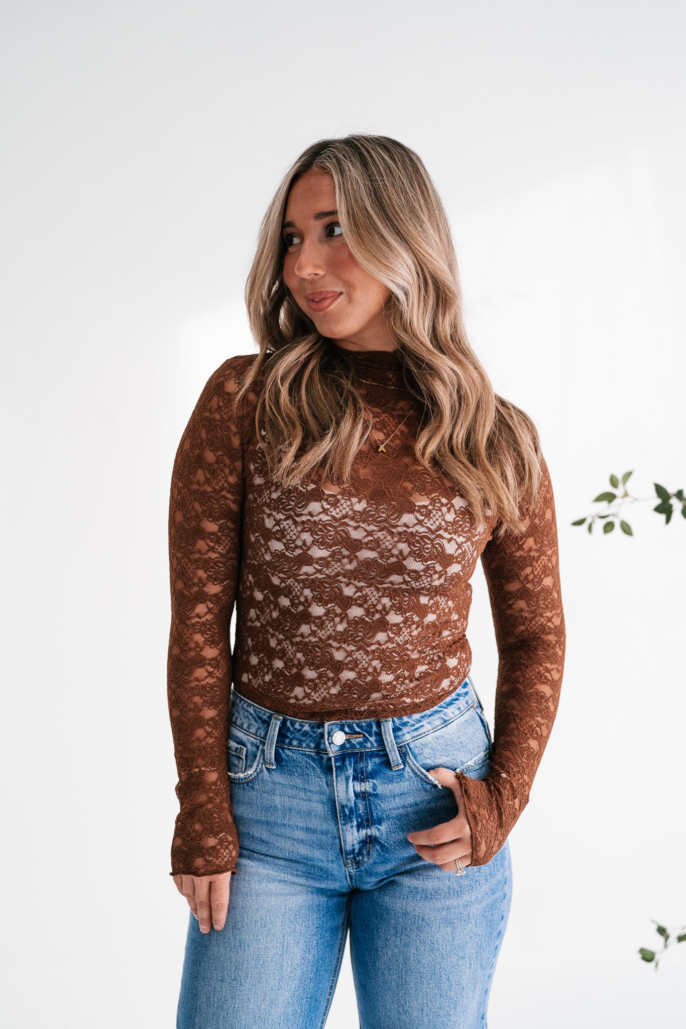 Autumn Chic Brown Floral Lace Mock Neck Top - Sheer Long Sleeve Blouse