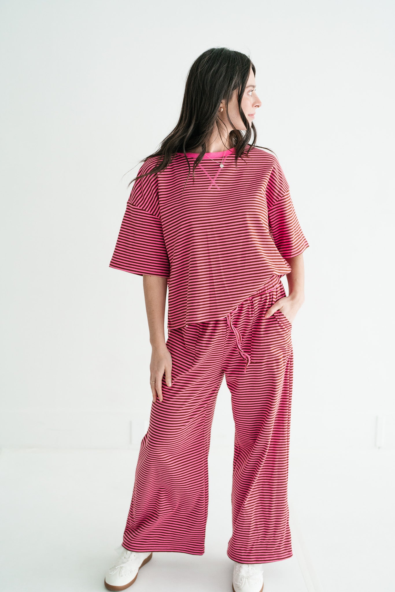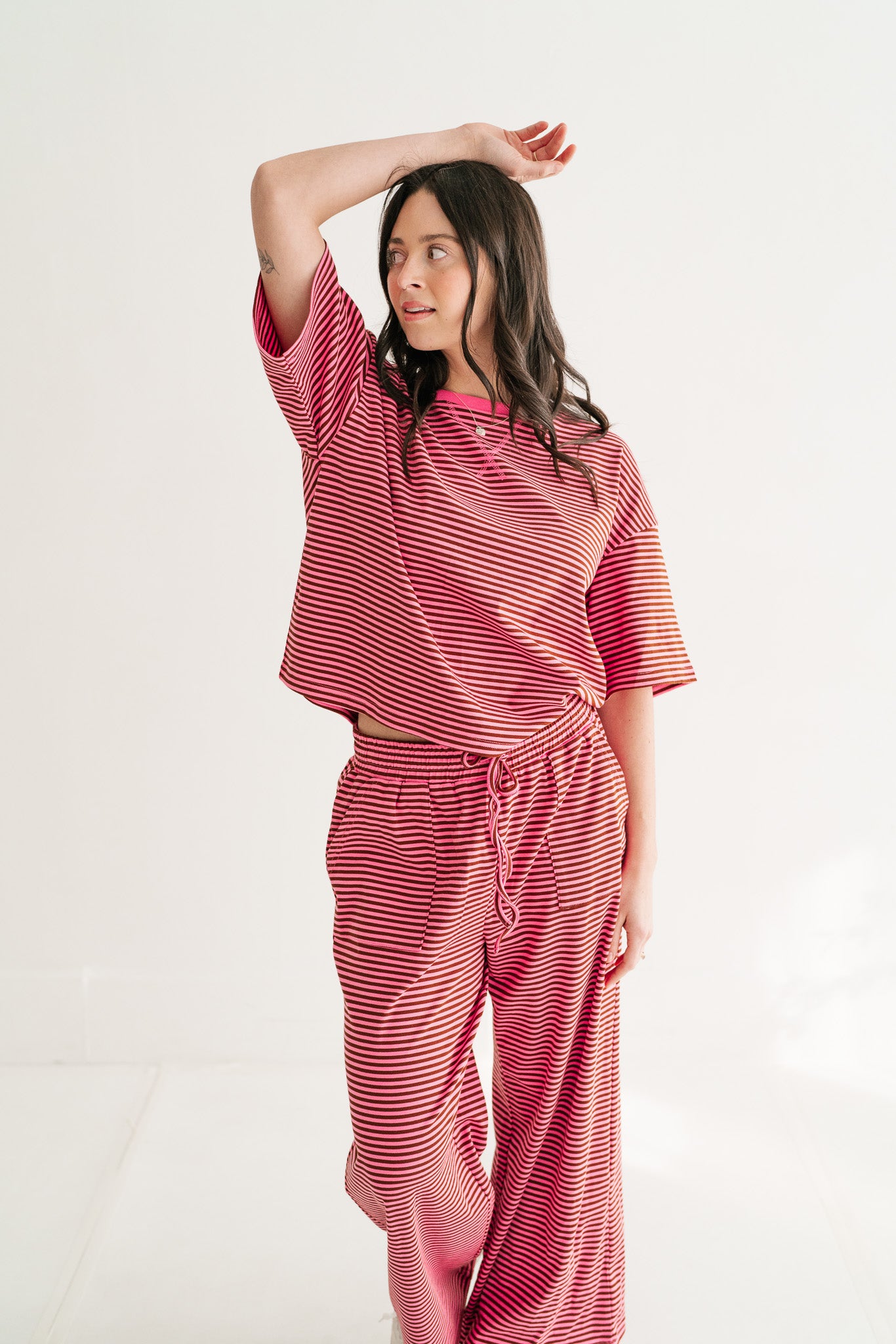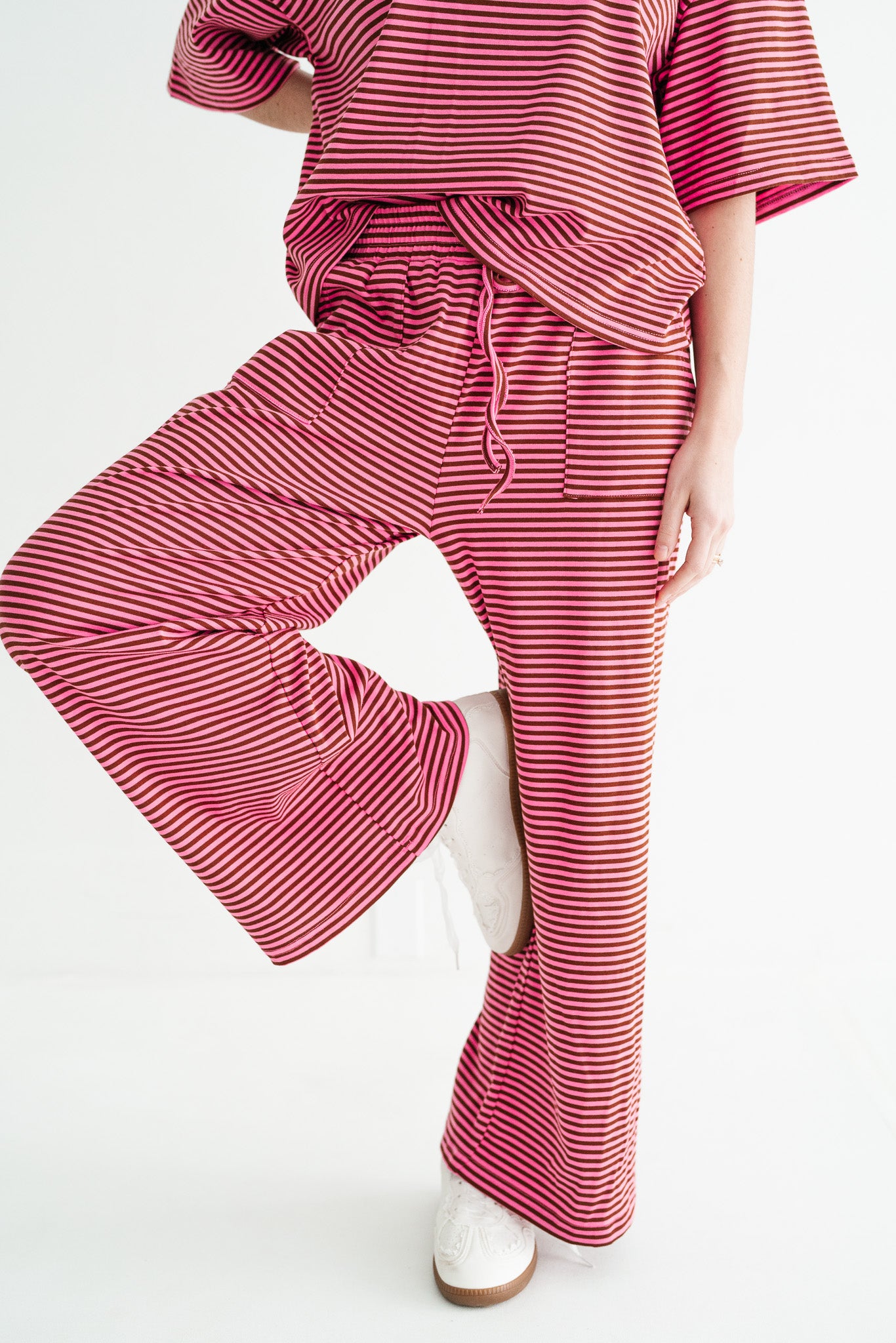 Elevate your off-duty style with this effortless striped knit set, crafted from a premium, cool-touch ribbed fabric that breathes as you move. Featuring a relaxed, oversized short-sleeve top and matching wide-leg pants with an adjustable drawstring waist, this boho-inspired duo is the ultimate solution for airport style, lazy weekends, or chic lounging. It’s the perfect blend of cozy texture and a "Free People" aesthetic that ensures you look put-together without sacrificing a second of comfort.