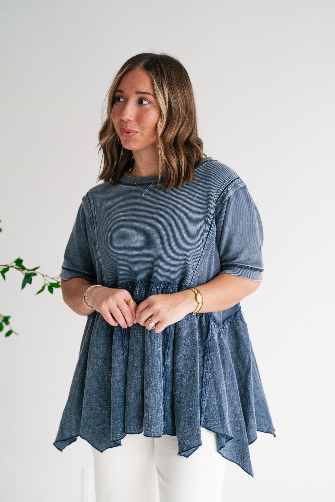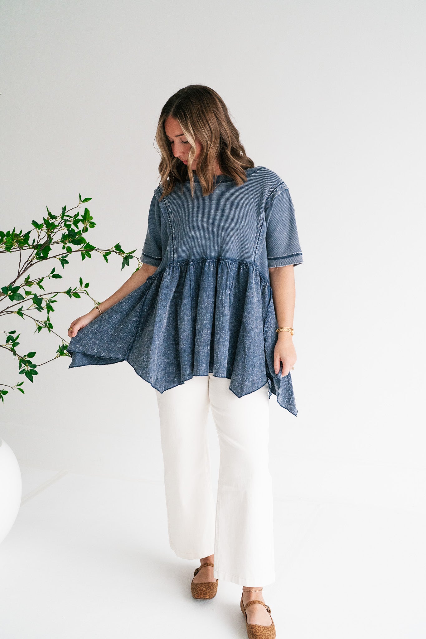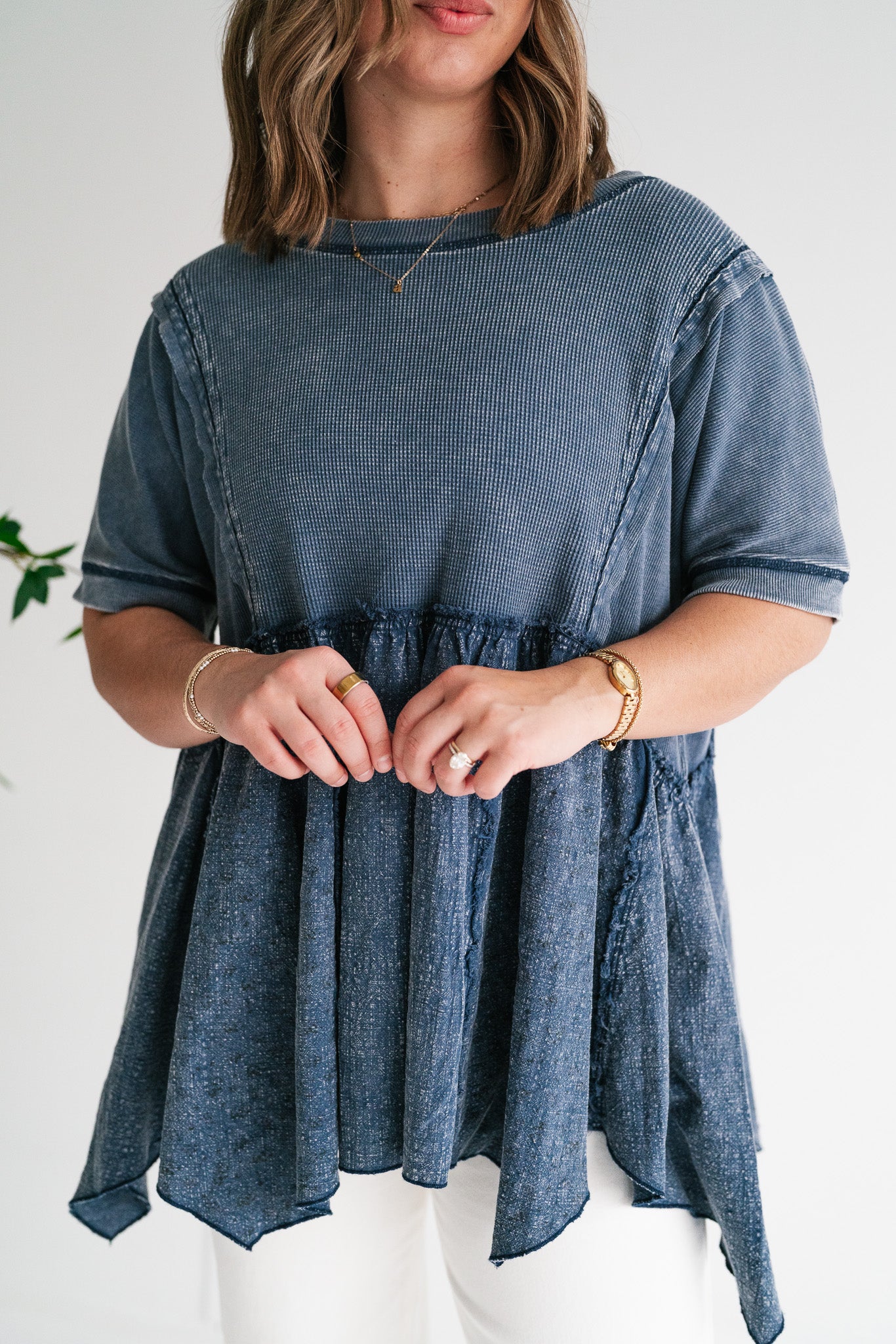 Calm Days Textured Babydoll Top - Blueberry | Floral Mixed Media Tunic Top
