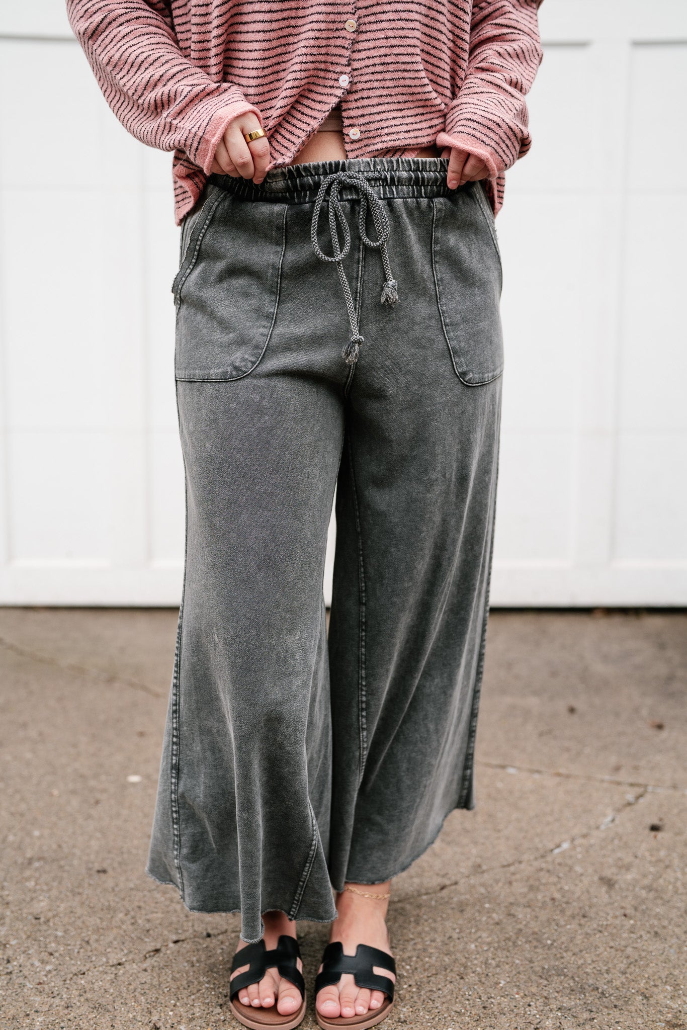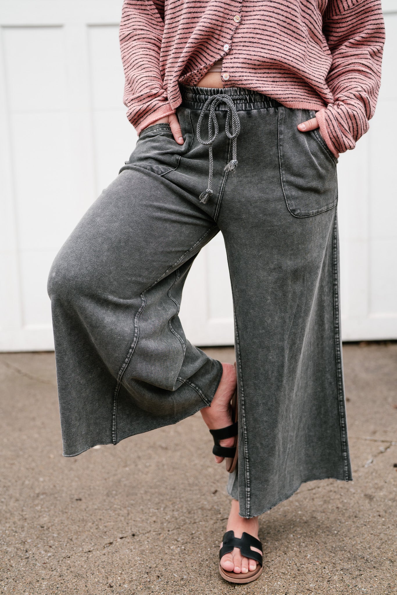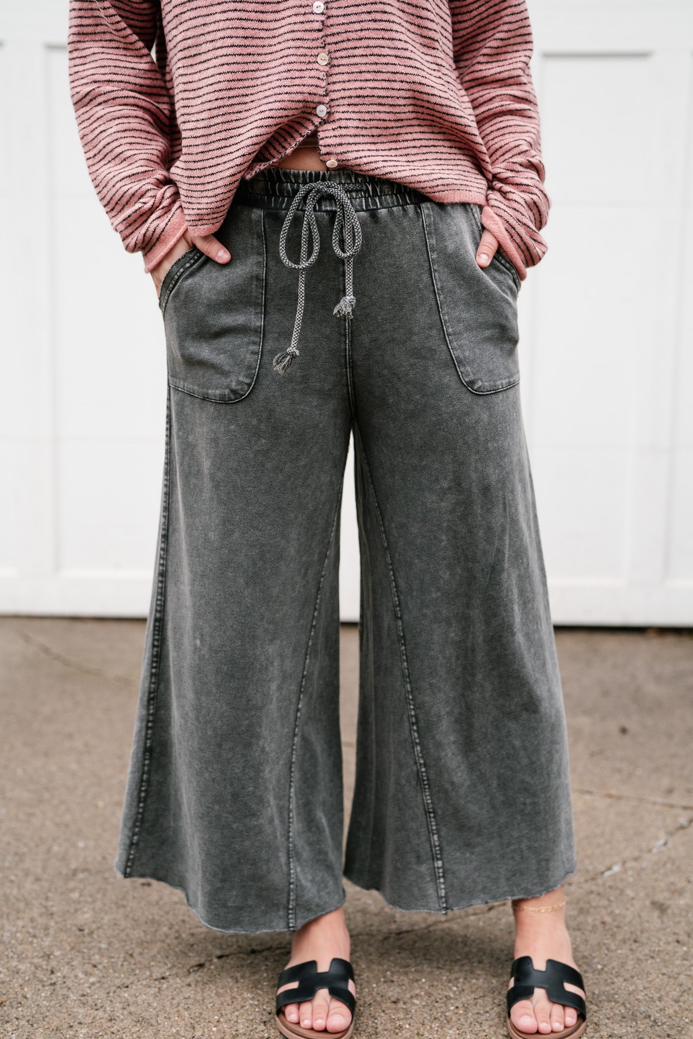 Elevate your everyday style with these ultra-soft, mineral-wash wide-leg pants in a stunning faded black. Featuring a flexible drawstring waist, they offer a seamless transition from cozy loungewear to chic street style. Feel effortlessly polished in the ultimate comfort staple.