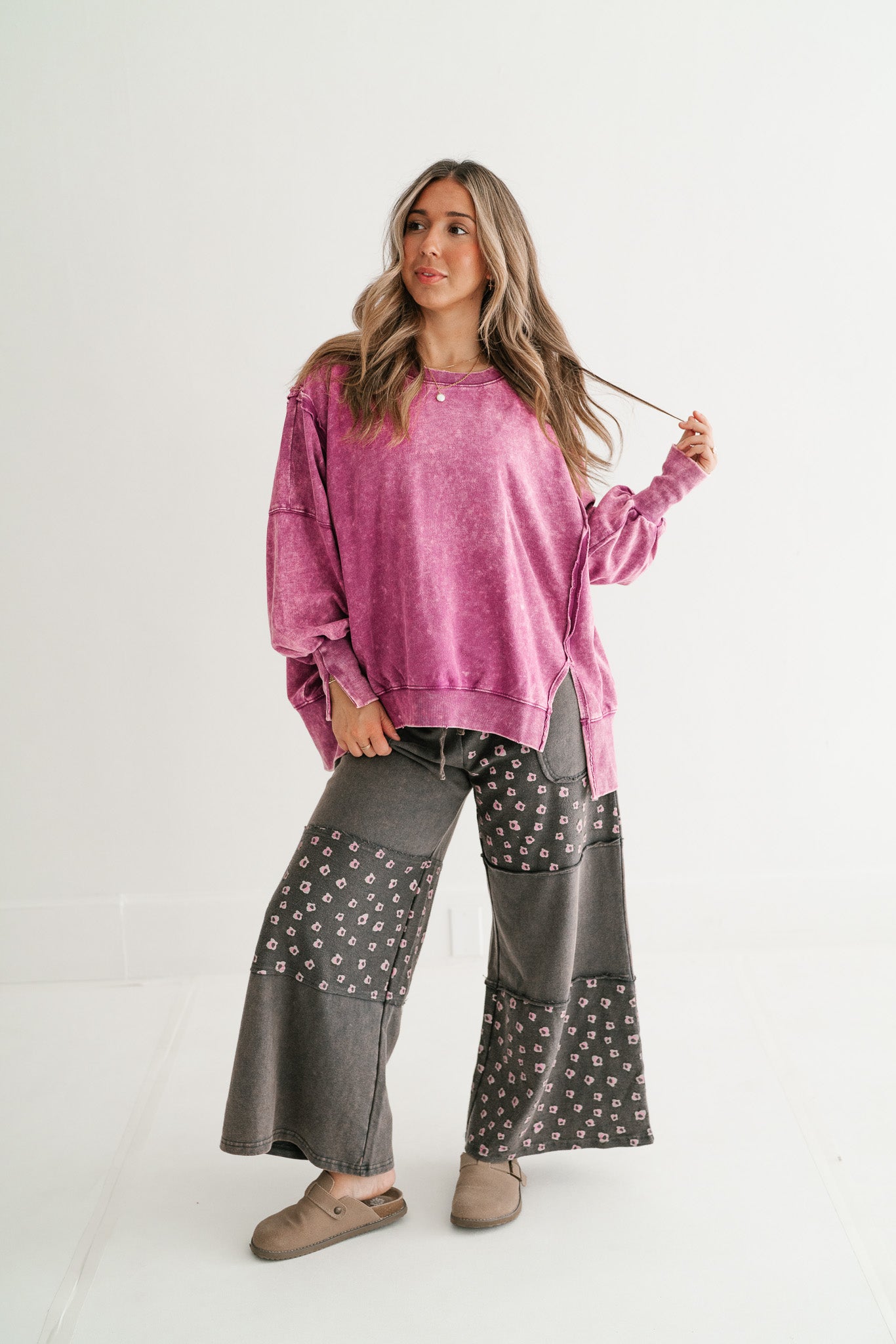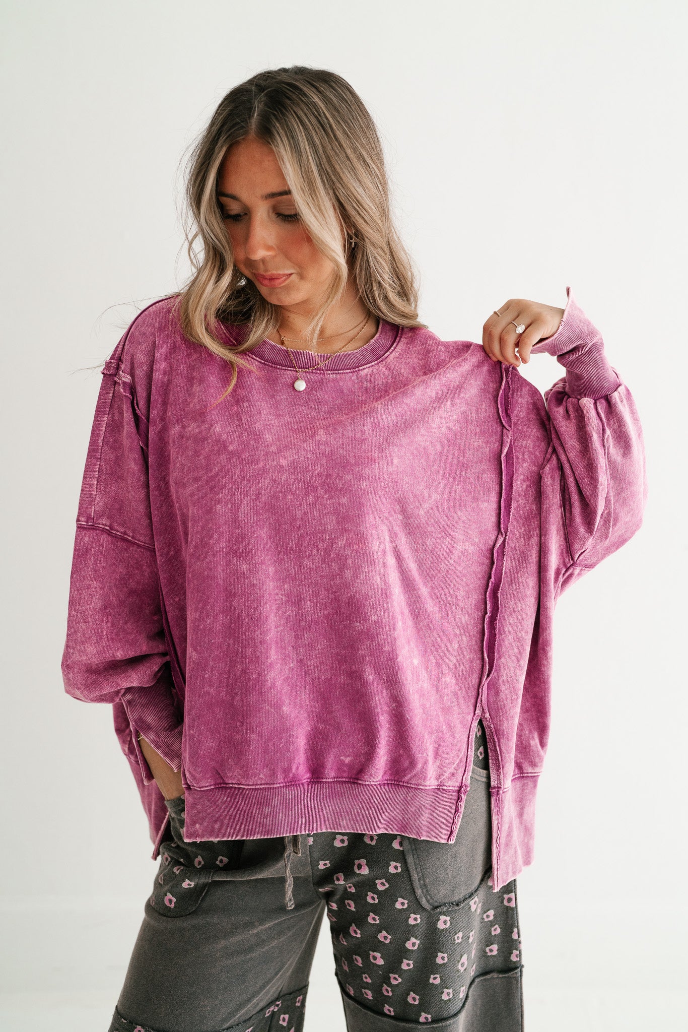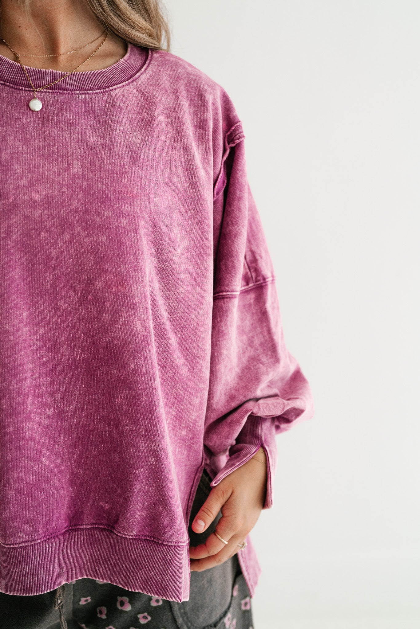 This oversized pullover makes a statement with its vibrant color and lived-in mineral wash finish. Designed with a roomy silhouette, dropped shoulders, and raw seam accents, it strikes the perfect balance between cozy and chic. Side slits and a slightly longer back hem give it that relaxed, flattering drape that pairs perfectly with denim or leggings. Whether you’re lounging at home, running errands, or layering up for a casual day out, this crewneck is the go-to staple you’ll reach for on repeat.