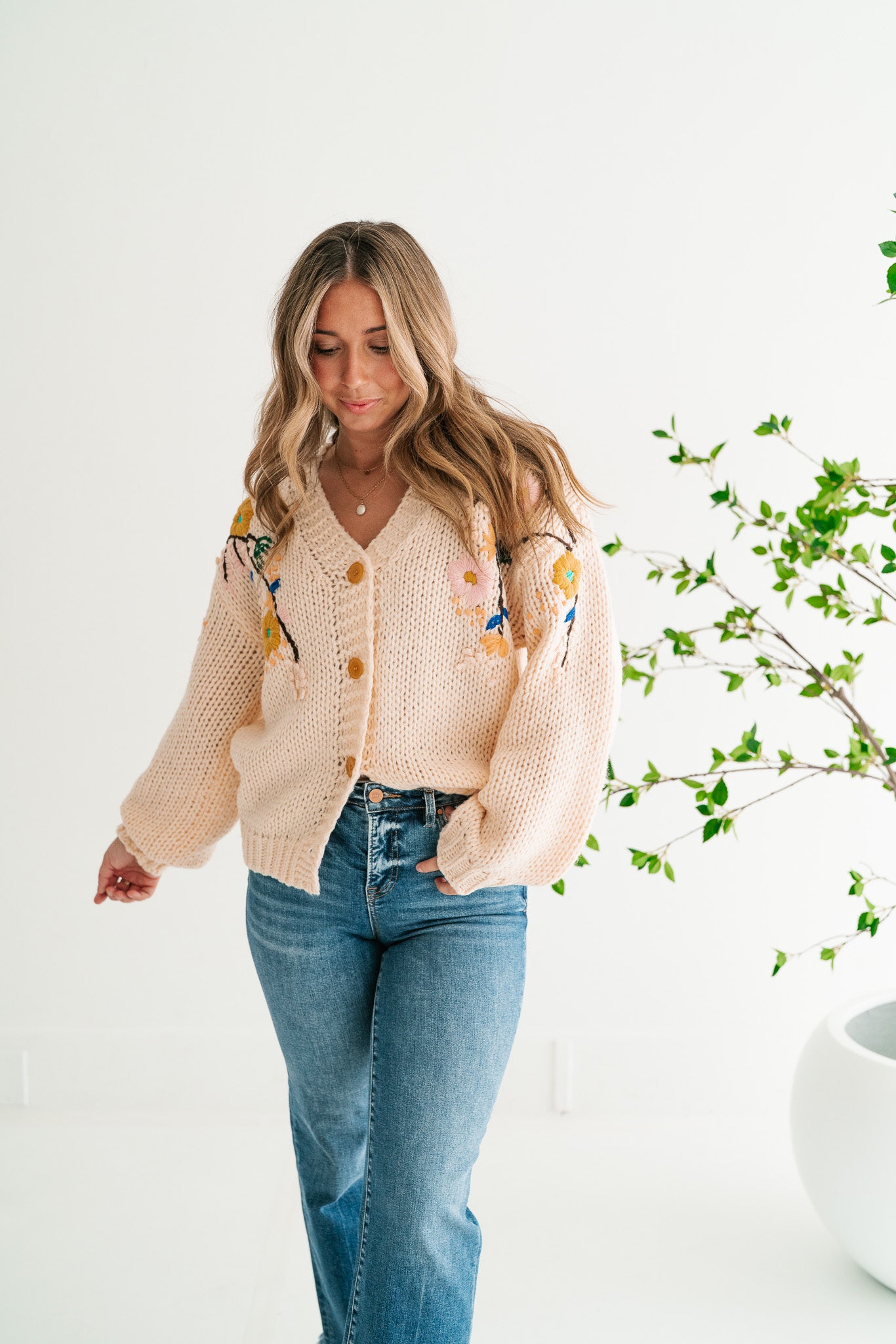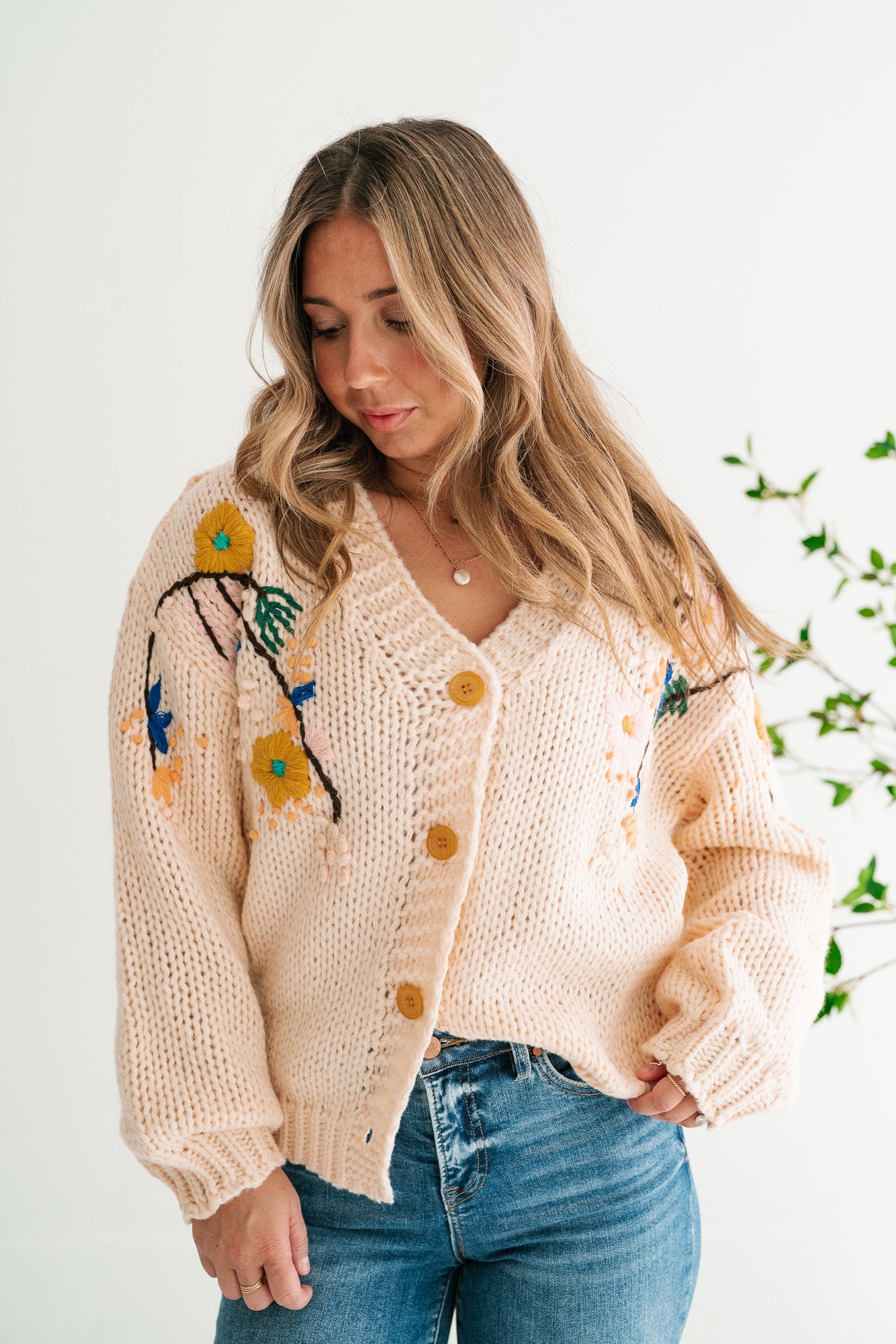 Embrace effortless style and cozy comfort with our Poetic Charm Ivory Floral Embroidered Chunky Knit Cardigan. This beautifully crafted sweater features a relaxed, oversized fit, perfect for layering over your favorite tops and dresses. The soft, chunky knit fabric provides warmth and a luxurious feel, making it an an ideal choice for transitional weather or a chilly evening.