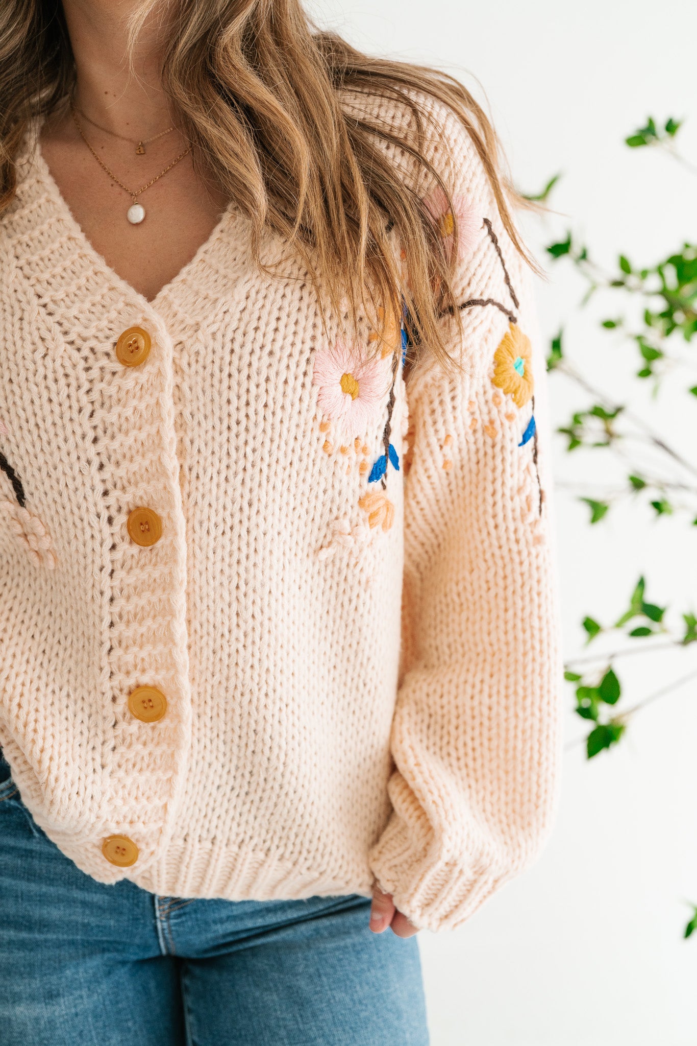 Poetic Charm Ivory Floral Embroidered Chunky Knit Cardigan | Relaxed V-Neck Sweater