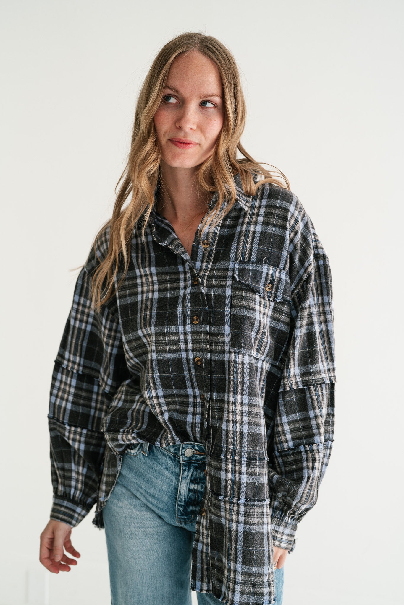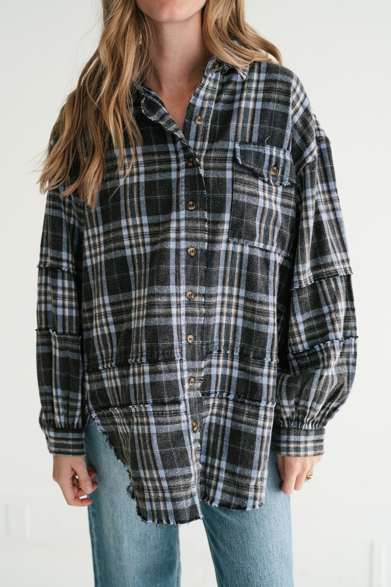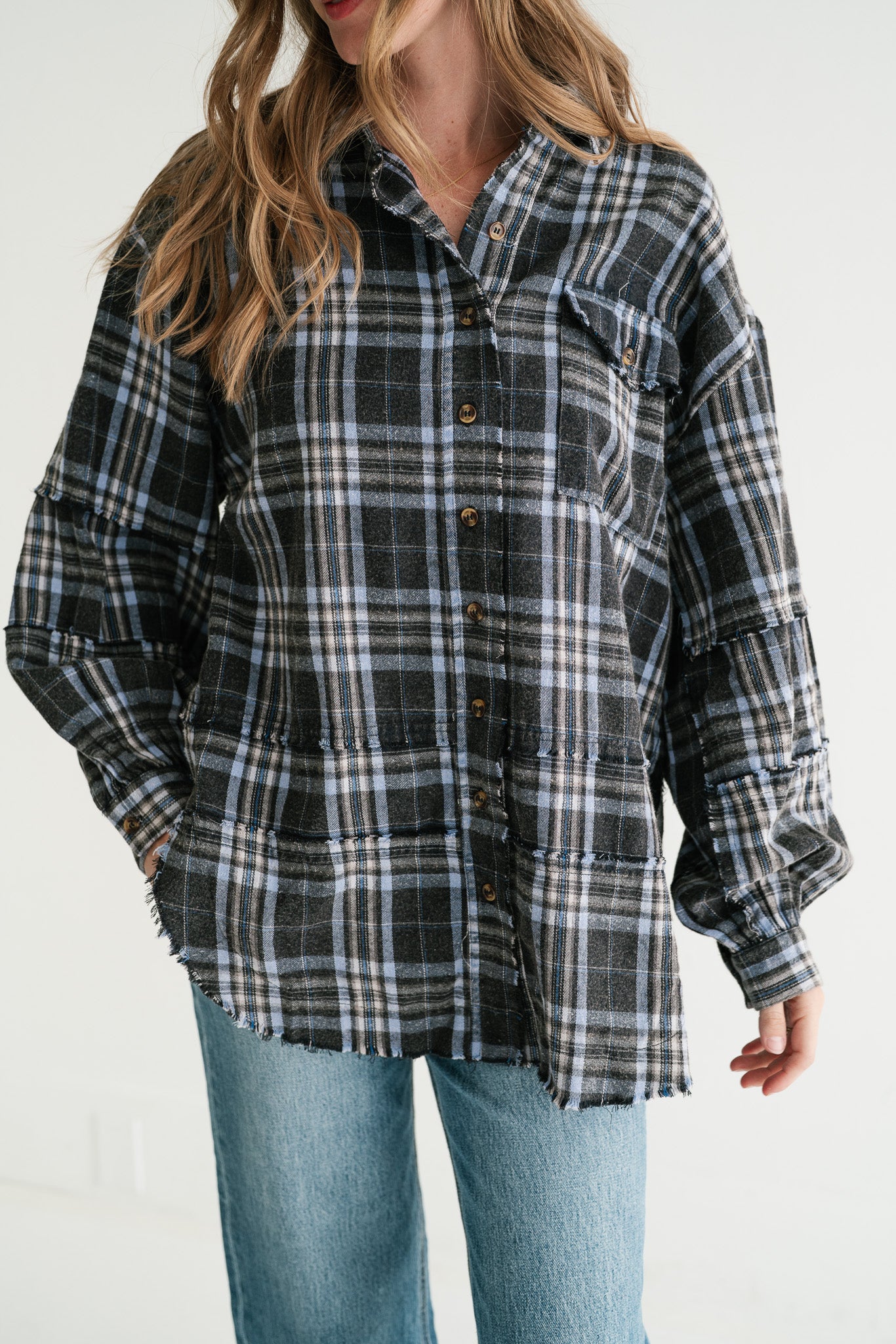 Embrace laid-back style with our Fireside Chic Blue & Black Plaid Oversized Flannel. This versatile piece combines the comfort of a soft flannel shirt with the casual coolness of a lightweight jacket, making it a must-have for your wardrobe. Its relaxed, oversized fit ensures ultimate comfort and a flattering silhouette for all body types, perfect for year-round wear.