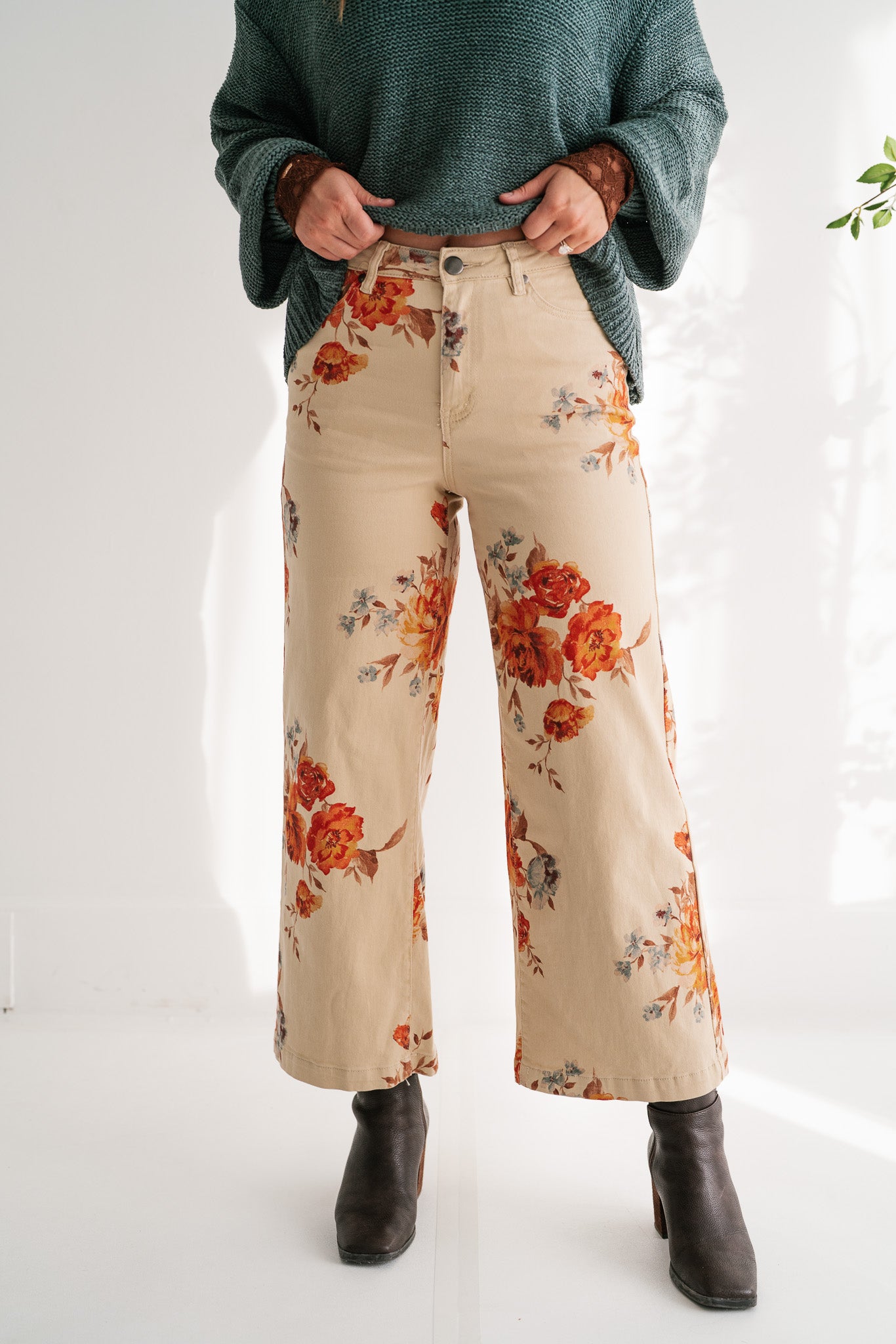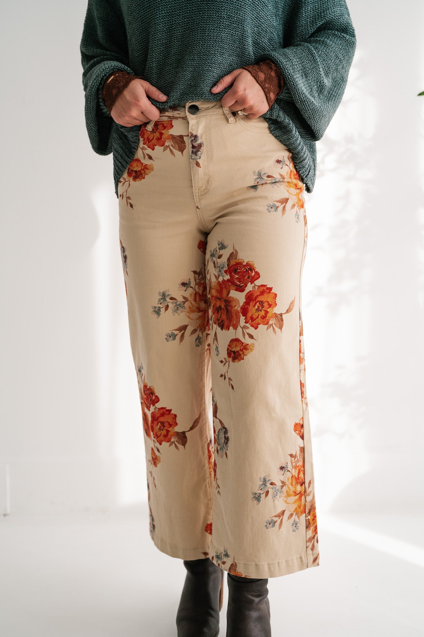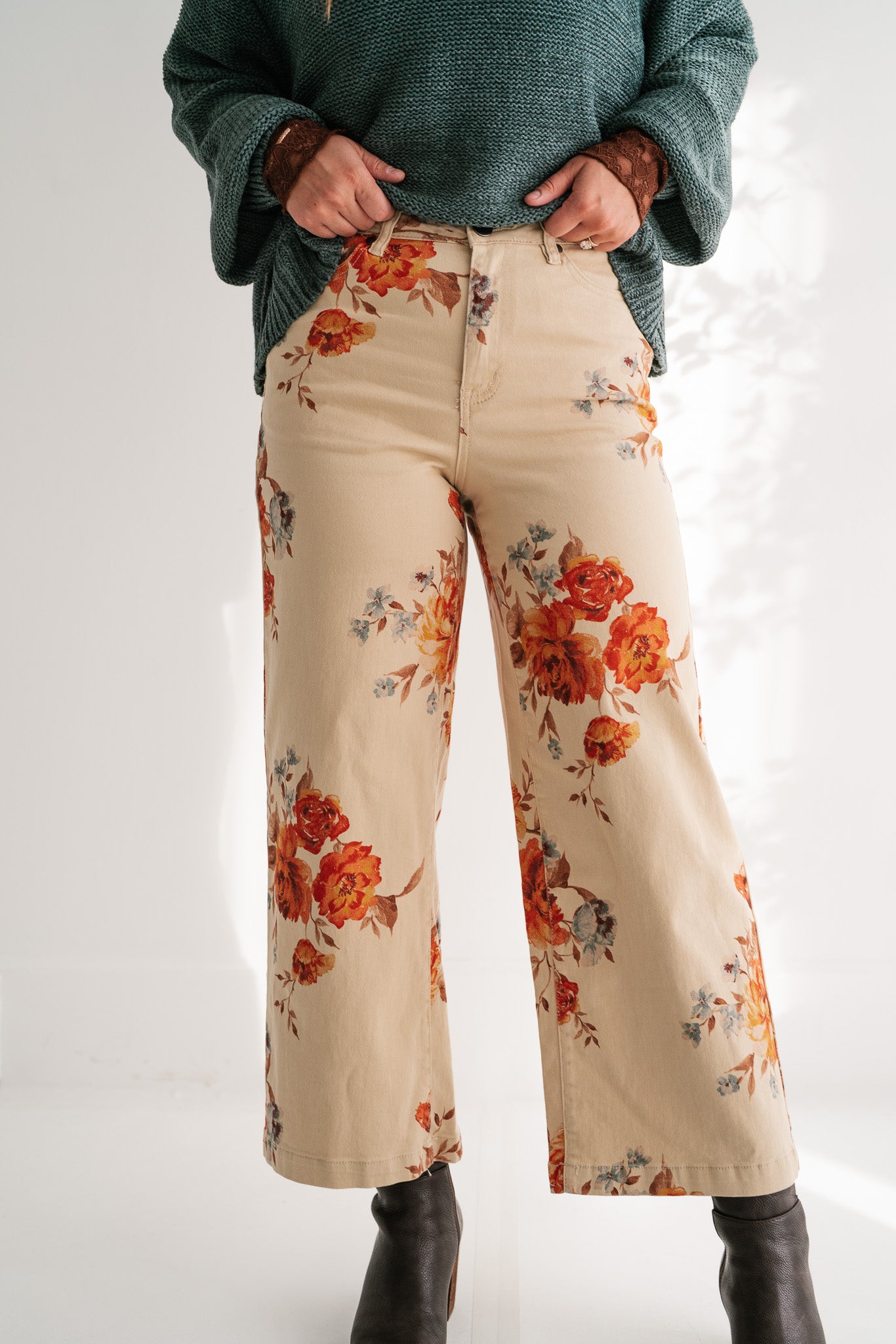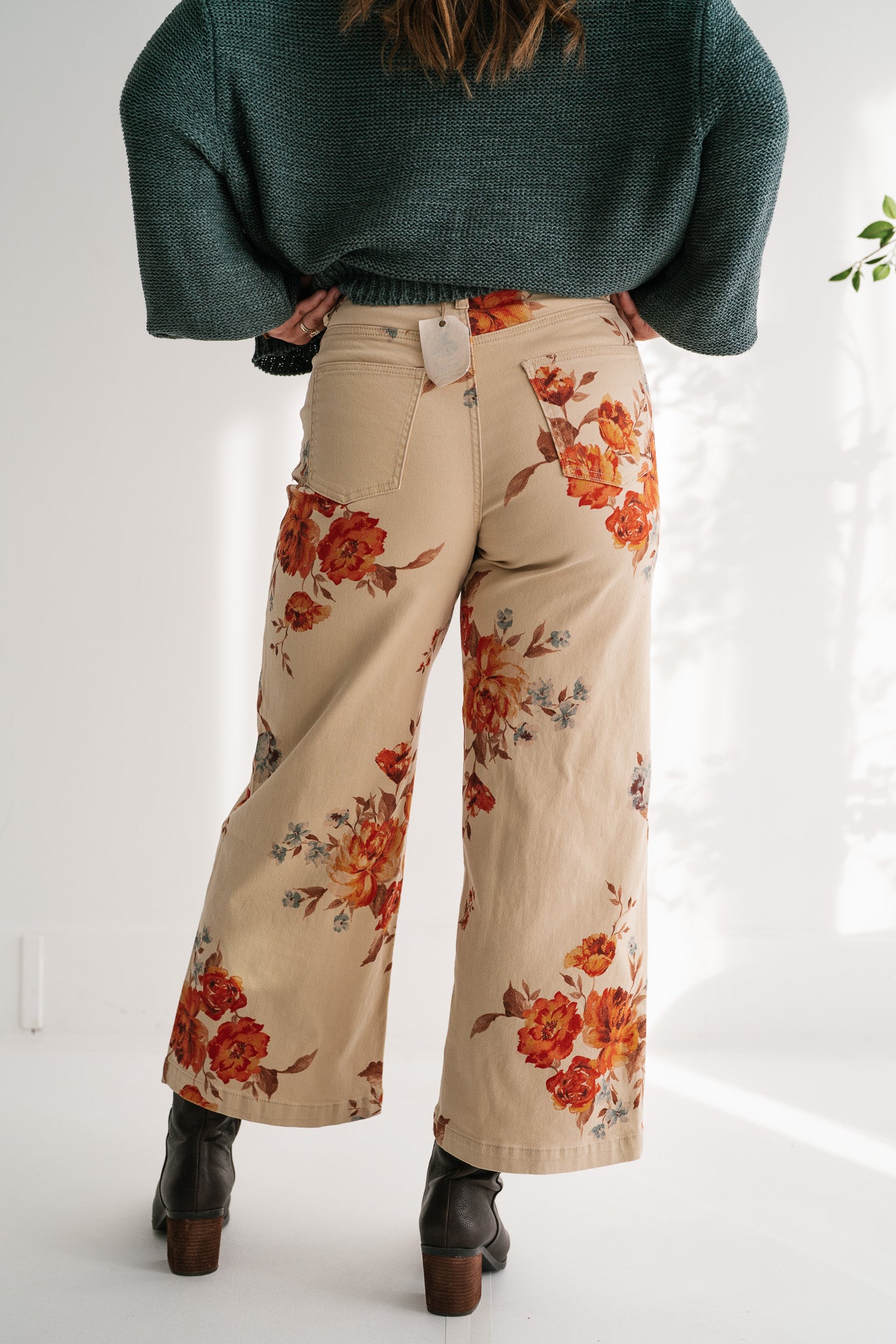 Step into blooming style with our stunning Floral Meadow Wide Leg Denim Pants - Khaki, designed to bring a fresh and vibrant touch to your wardrobe. These high-rise trousers feature an elegant cream background adorned with a captivating pattern of rich orange, deep red, and soft blue flowers, intertwined with subtle sepia-toned leaves. Crafted for both comfort and fashion, they offer a relaxed yet sophisticated silhouette that moves beautifully with you, perfect for making a statement.