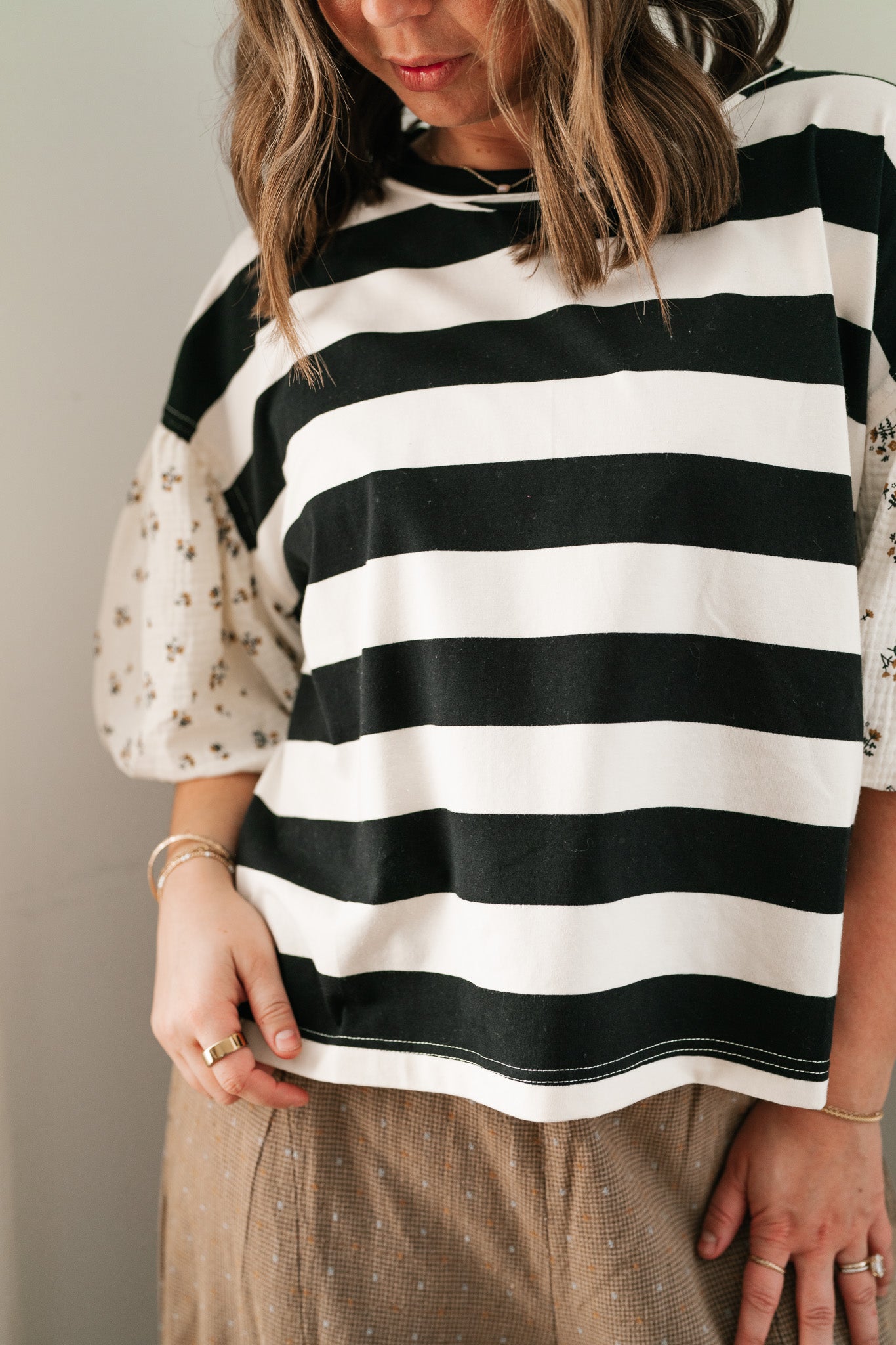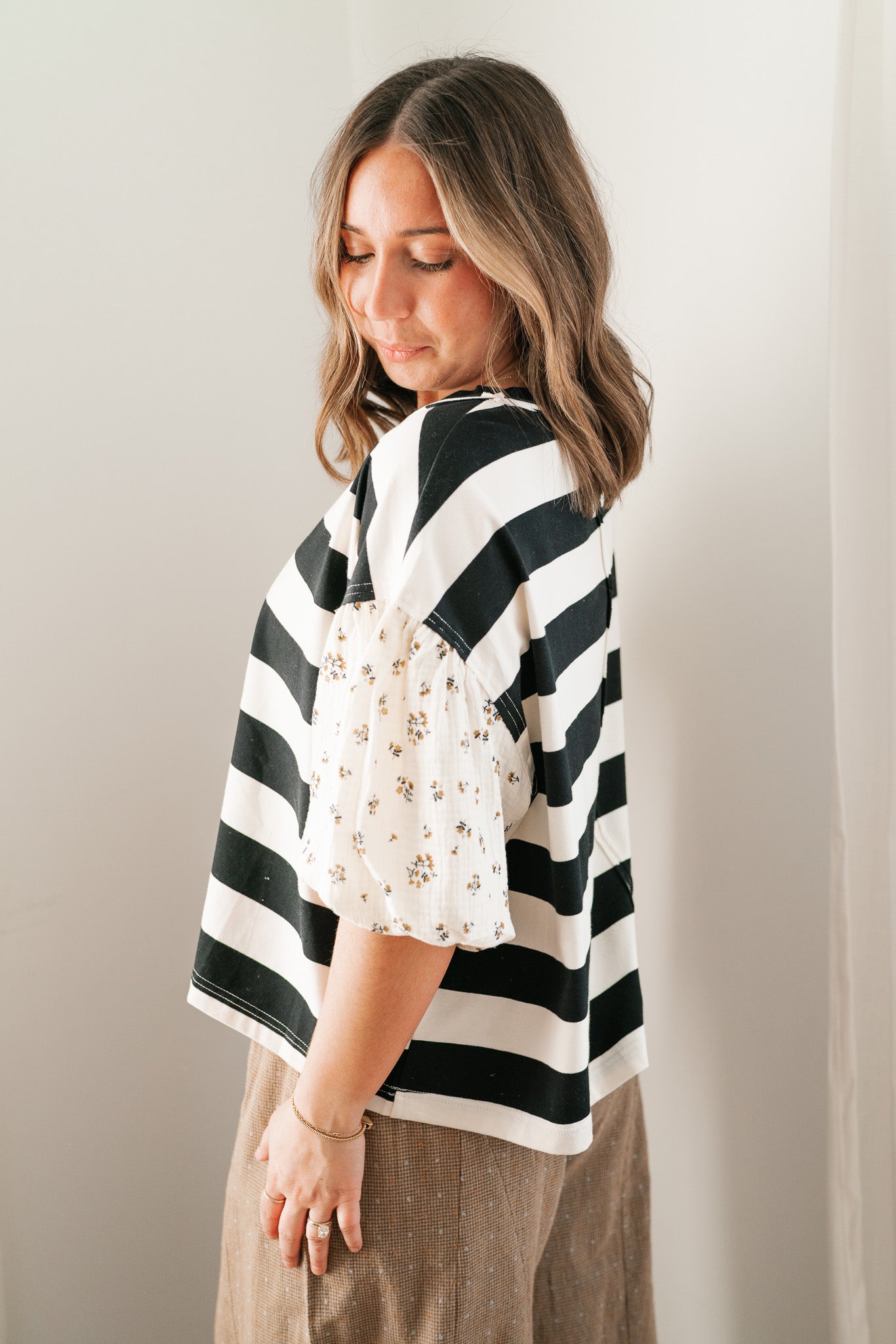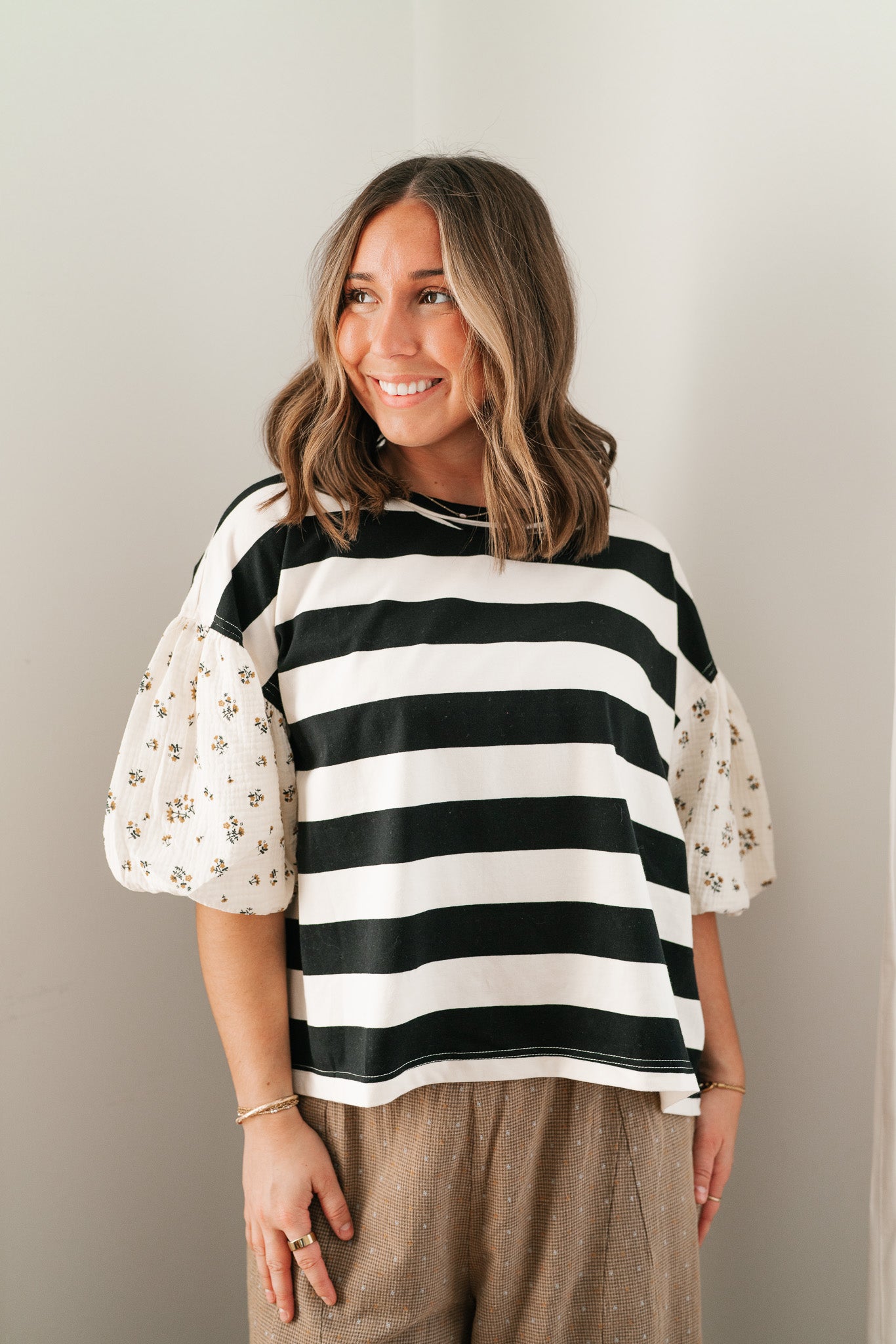 Elevate your everyday rotation with the Quiet Confidence Striped Top. This isn't just a basic tee; it features a timeless black and white horizontal pattern paired with feminine floral puff sleeves for a boutique-inspired twist. Crafted from a soft, breathable fabric blend, this versatile staple offers a polished look for the office and effortless chic for the weekend.